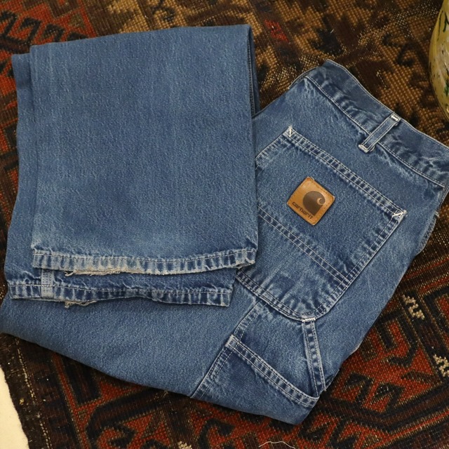 程良いダメージ具合がGOODなcarharttのダンガリーデニムペインターパンツ◎ carharttらしい丈夫ながら着心地の良い生地感が魅力的です! お探しの方はぜひ* サイズ表記 「33×34」 素材表記 100%コットン 裾に擦れ、ボディにいくつかシミや汚れがございますが、古着の味として着て頂けるかと思います。 その他、着用に問題のあるダメージはございません。 《実寸サイズ》 着丈115cm ウエスト86cm 股上33cm 股下86cm わたり幅37cm 裾幅24cm