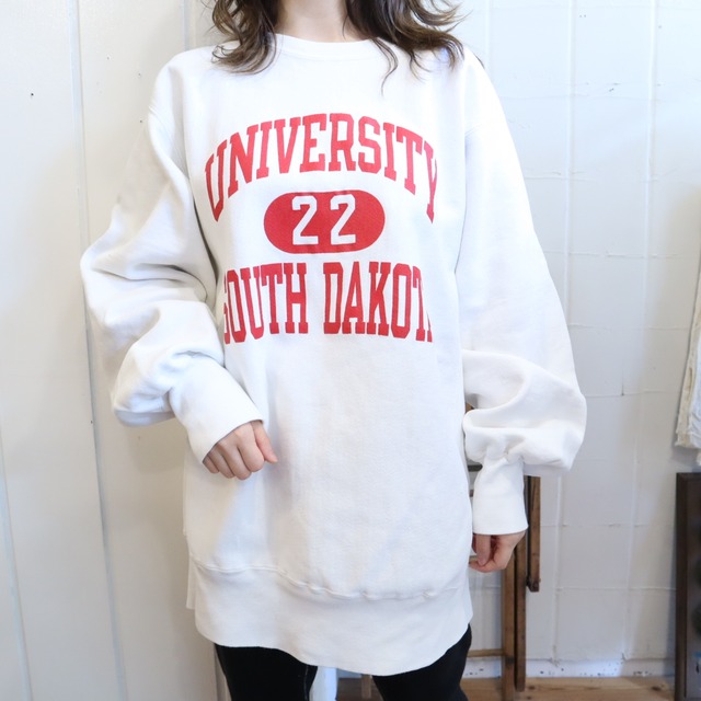 真っ白ボディに赤が映えて可愛い90sリバースウィーブ。 ミニワンピぽく着られるサイズ感で、サーマルパンツやニットタイツと合わせても♡ (着用スタッフ身長150cm) サイズ表記 「X-LARGE」 素材表記 90%コットン、10%アクリル いくつかシミや汚れ、キズがございますが、古着の味として着て頂けるかと思います。 その他、着用困難なダメージはございません。 《実寸サイズ》 着丈75cm 肩幅51cm 身幅58cm ウエスト104cm(裾リブで計測) 袖丈64cm