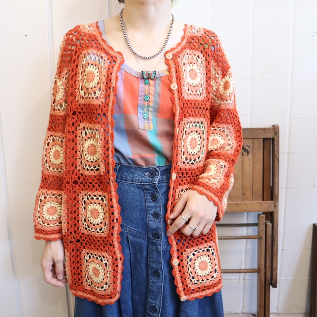 フリンジ付きなど、遊び心のあるデザインが可愛いカーディガン♡ オクラホマにまつわるデザインになっていて、見ているだけで楽しい古着らしい一点です◎ 天使のピンバッジ付きです! (着用スタッフ身長147cm) サイズ表記 「M」 素材表記 100%コットン いくつか糸のツレ・飛び出し、シミ・汚れがございますが、古着の味として着て頂けるかと思います。 その他、着用に問題のあるダメージはございません。 《実寸サイズ》 着丈63cm 肩幅53cm 身幅56cm ウエスト88cm(裾リブで計測) 袖丈59cm *ニットの為伸縮性あり*
