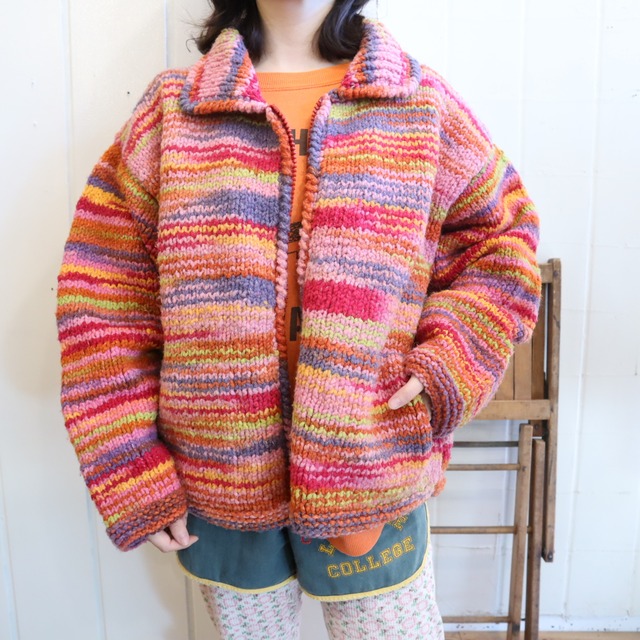 pink×orange full zip Ecuador wool knit cardigan [l-4621]