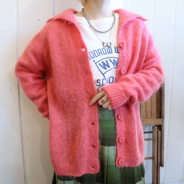 襟付きのデザインがとっても可愛いニットカーディガン。 目を惹く鮮やかなピンクのカラーリング、細部まで拘られたボタンもポイントです。 身体になじみやすいラグランスリーブなところも着やすいですね◎ (着用スタッフ身長147cm) サイズ表記 ‐ 素材表記 ‐ ウールやモヘアの混紡かと思われます。 袖に汚れが見受けられますが、あまり気にならないかと思います。 その他、特に目立つダメージはございません。 《実寸サイズ》 着丈65cm ゆき丈83cm 身幅51cm