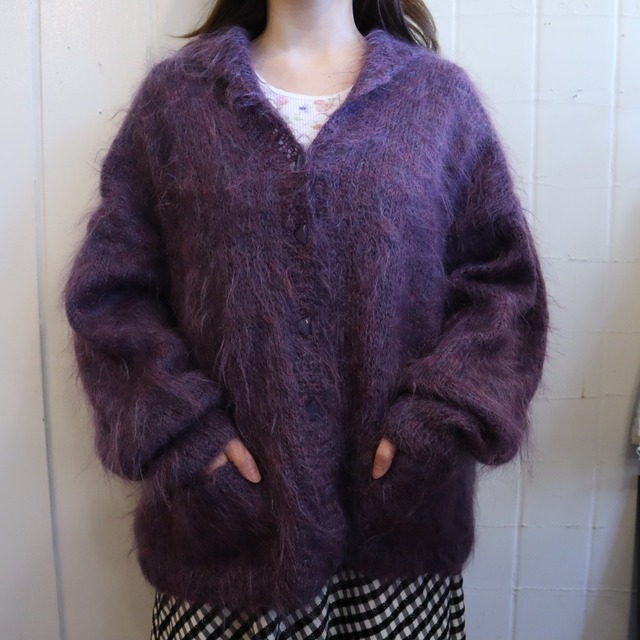 パープル×ブルーのミックスカラーデザインが可愛いショールカラーカーディガンです。 モヘアニットならではの毛足の長いデザインが高級感があって素敵です! (着用スタッフ身長154cm) サイズ表記 ‐ 素材表記 ‐ 一部付着汚れがございますが、あまり気にならないかと思われます。 その他、特に目立つダメージはございません。 《実寸サイズ》 着丈65cm ゆき丈88cm 身幅66cm ウエスト112cm(裾で計測) *ニットの為伸縮性あり*