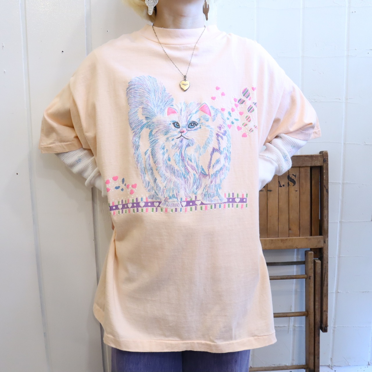 ややサーモンピンクのような絶妙なカラーが可愛いネコプリントTシャツ。