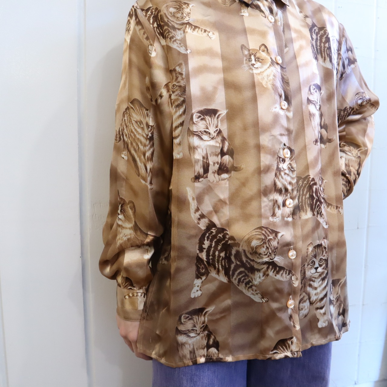 80s brown cat pattern see-through shirt [l-2613]