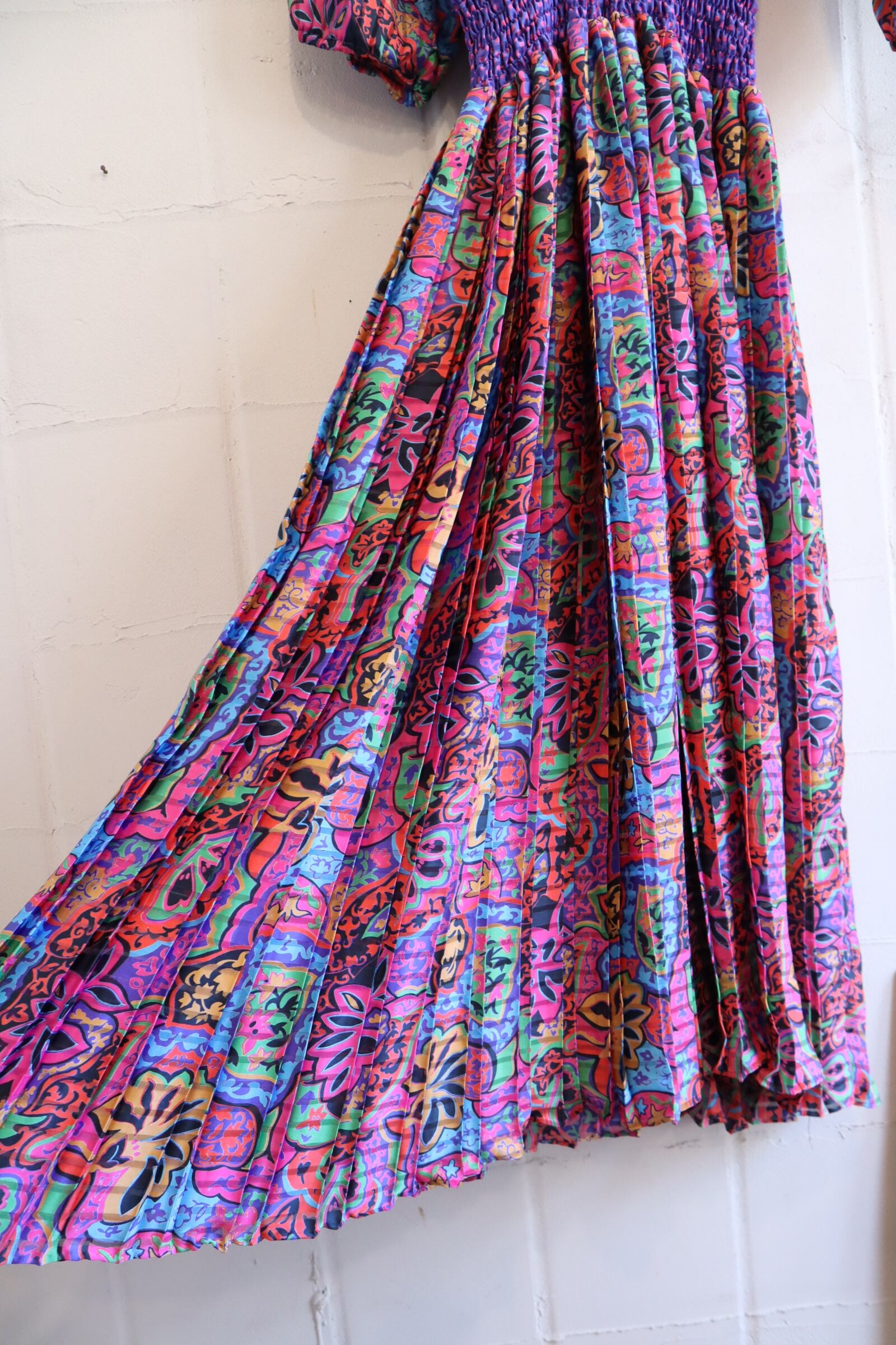 80s Diane Freis purple×pink×colorful pleats skirt dress [l-2623]