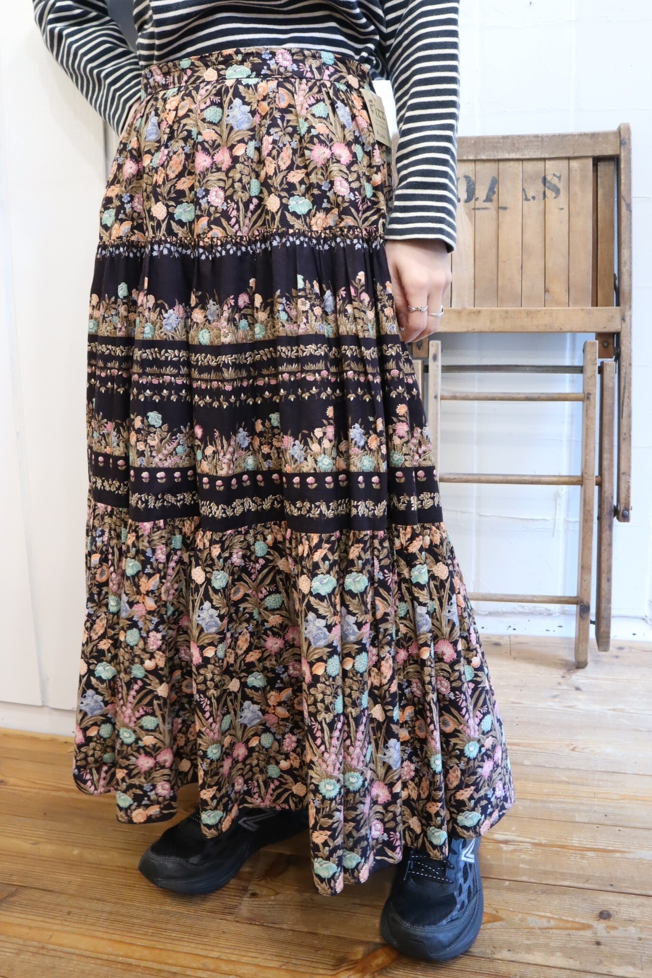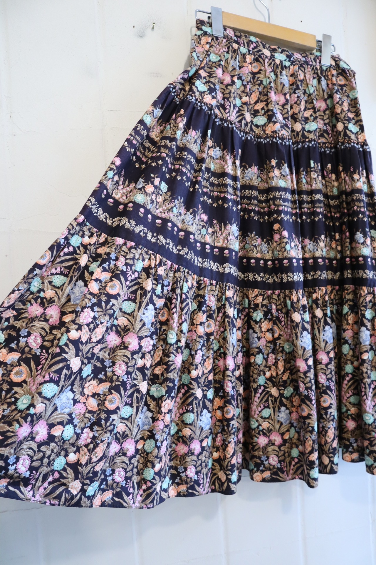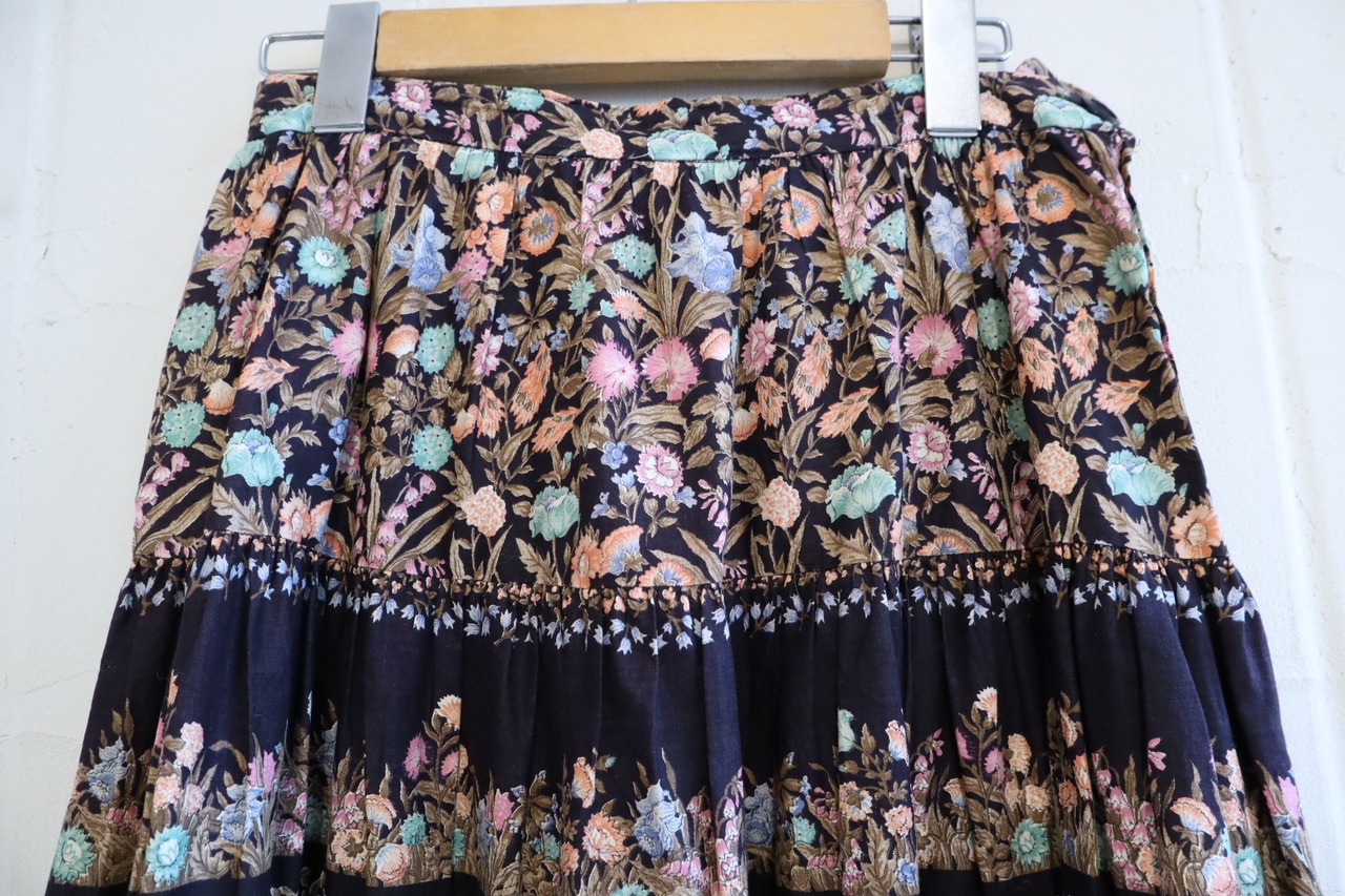 ブラックに映えるネオンカラーテイストなオレンジやミントグリーンなどのお花が可愛いティアードスカート。