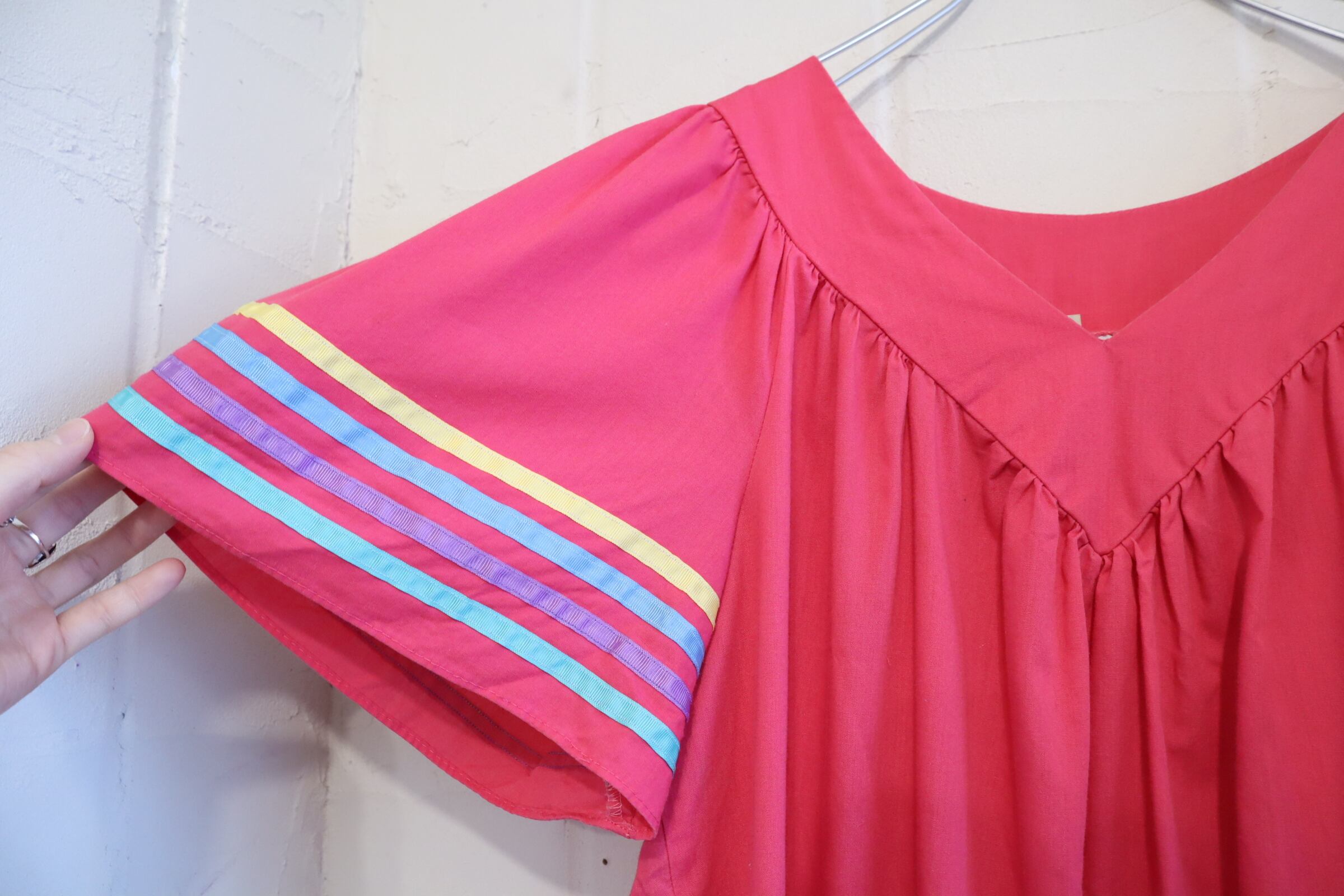 鮮やかなピンクに黄色水色紫などのテープが特徴的な半袖のドレス。