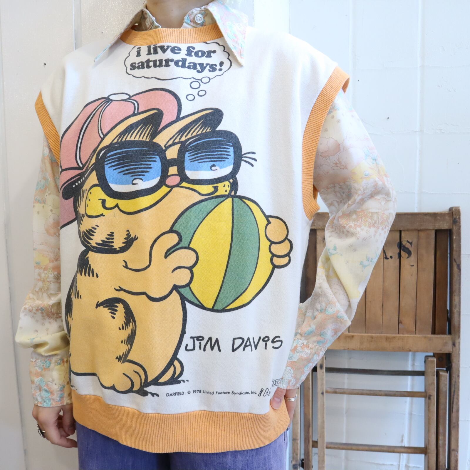 70s- offwhite×orange character pattern sleeveless sweat [l-2711]
