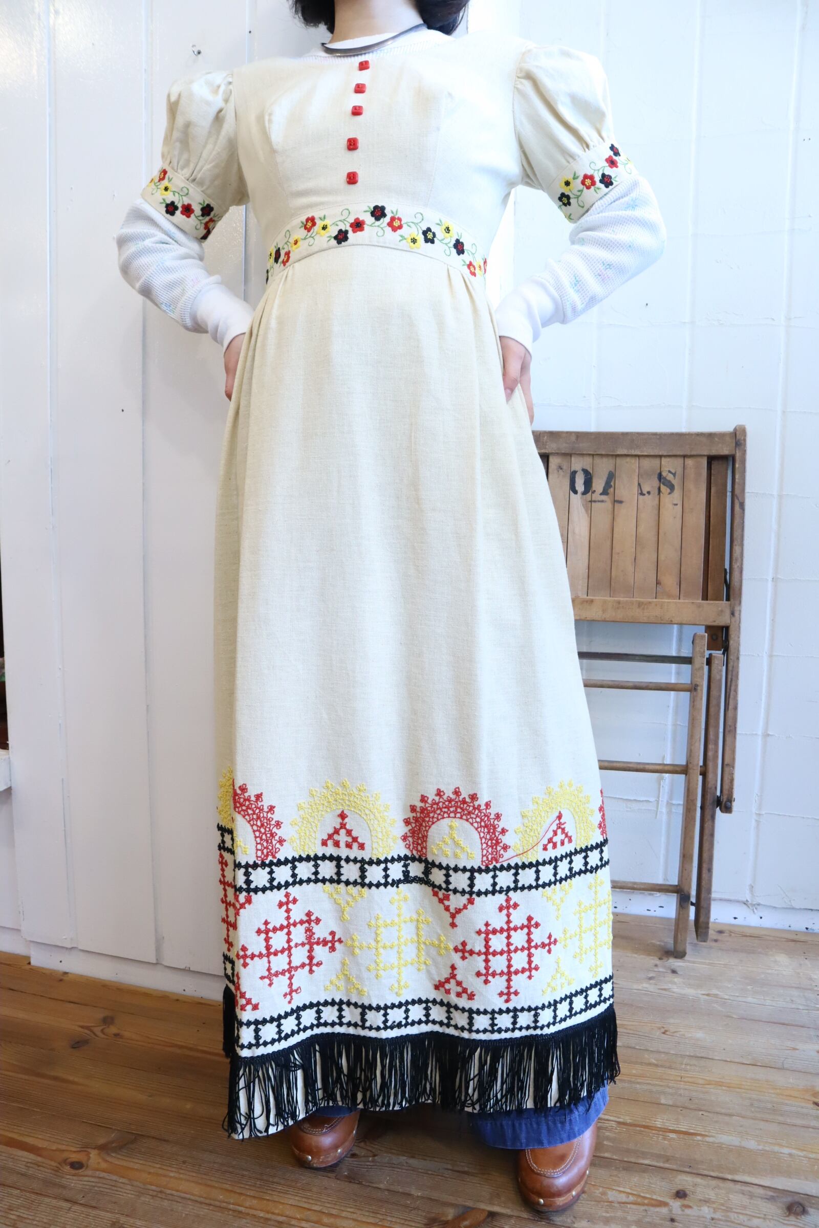 70s ivory×red flower embroidery fringe long dress [l-2720]