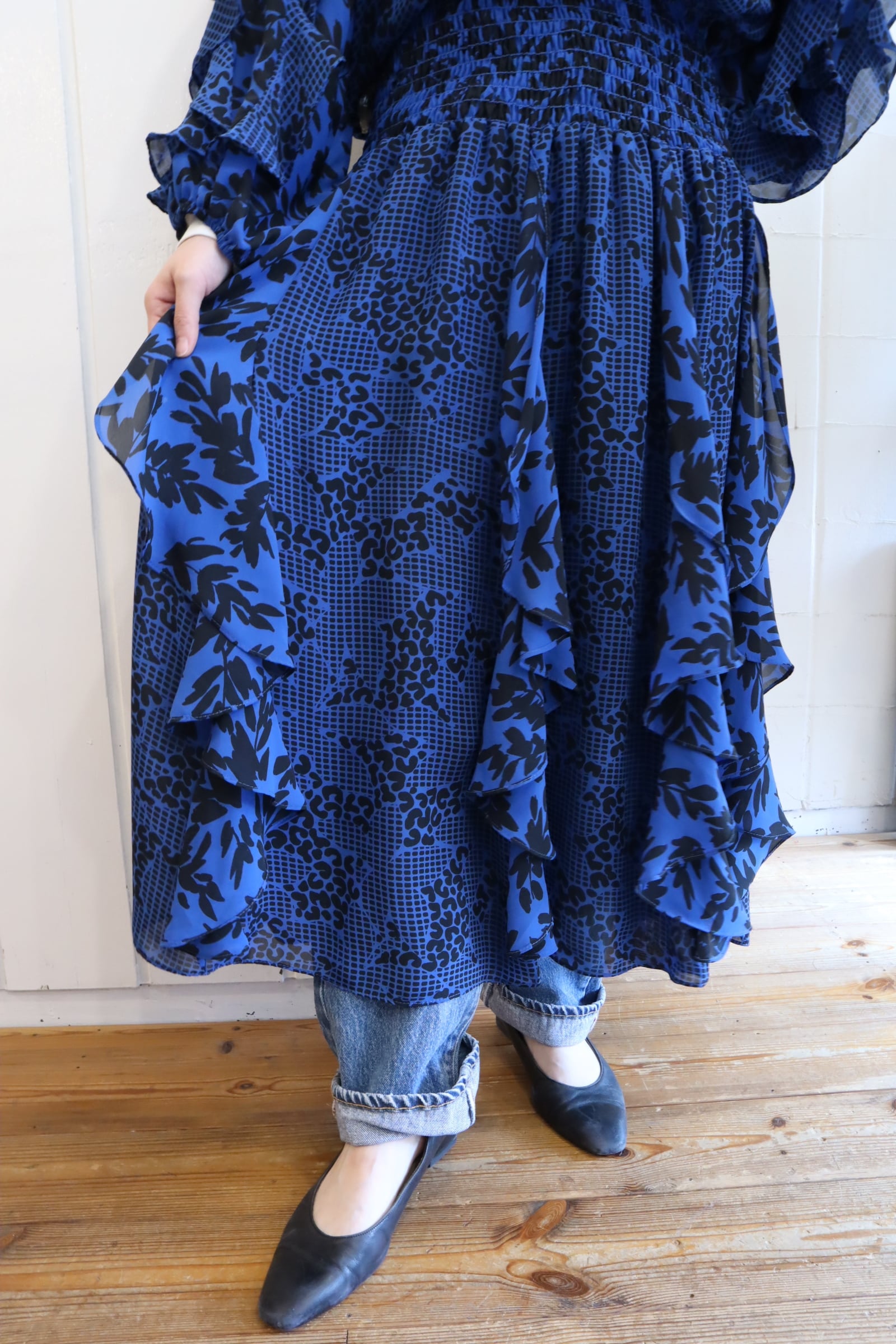 お花やハートにも見えるヒョウ柄が混ざった独特なテキスタイルが素敵ですよ。一枚で主役になれるアイテムですが、上からTシャツを着てお袖とスカートのフリルを見せるのも可愛いと思います◎