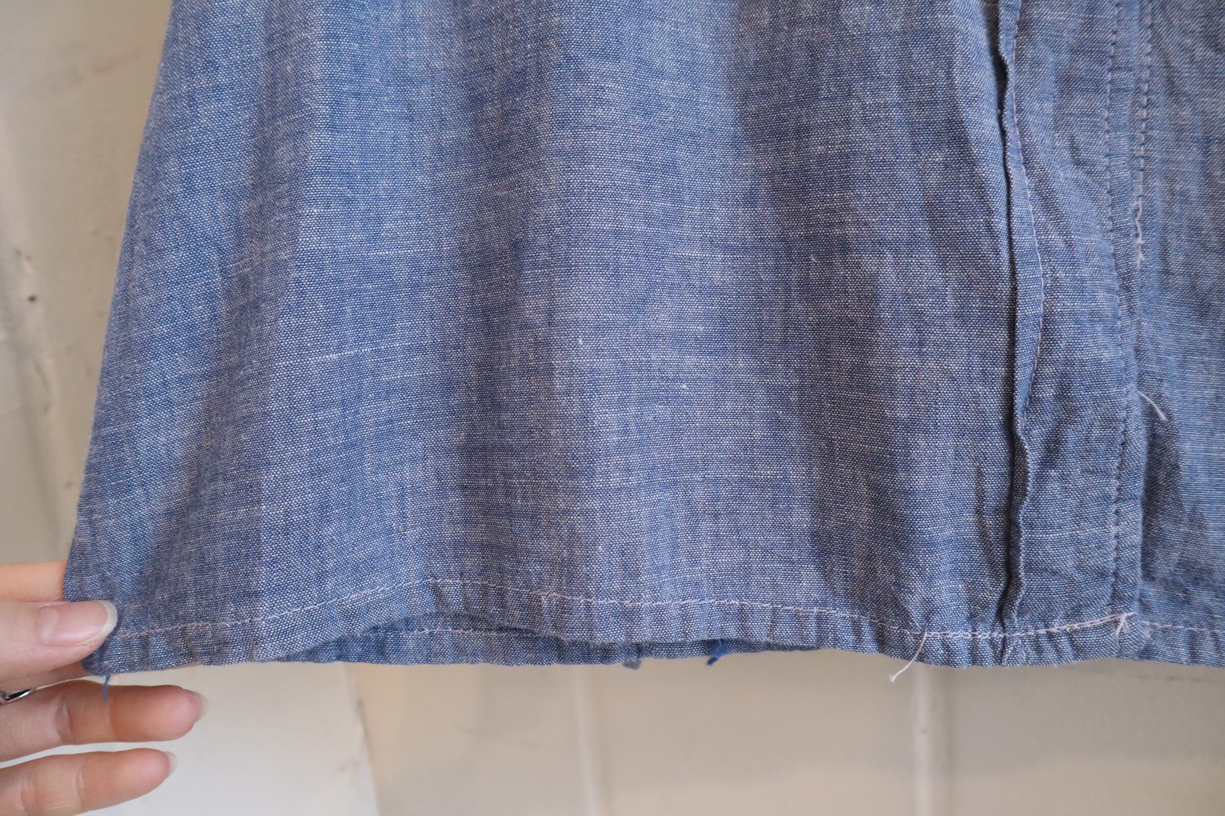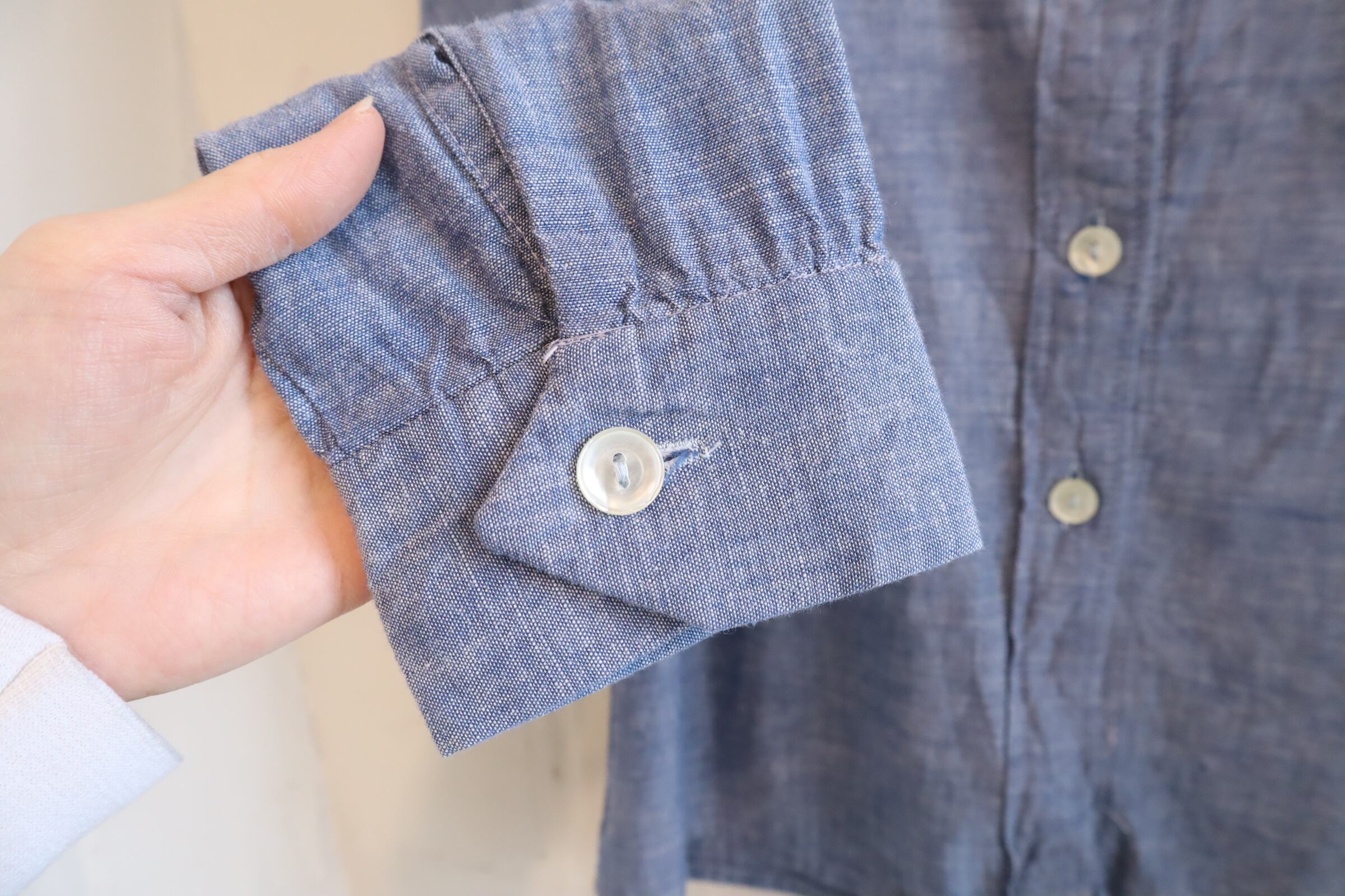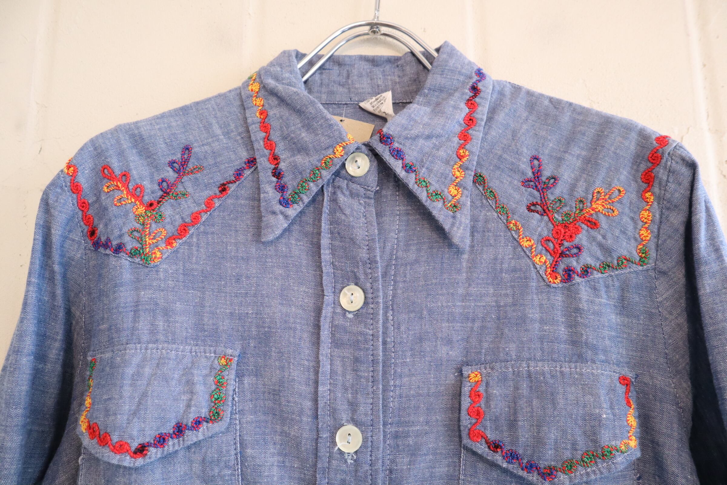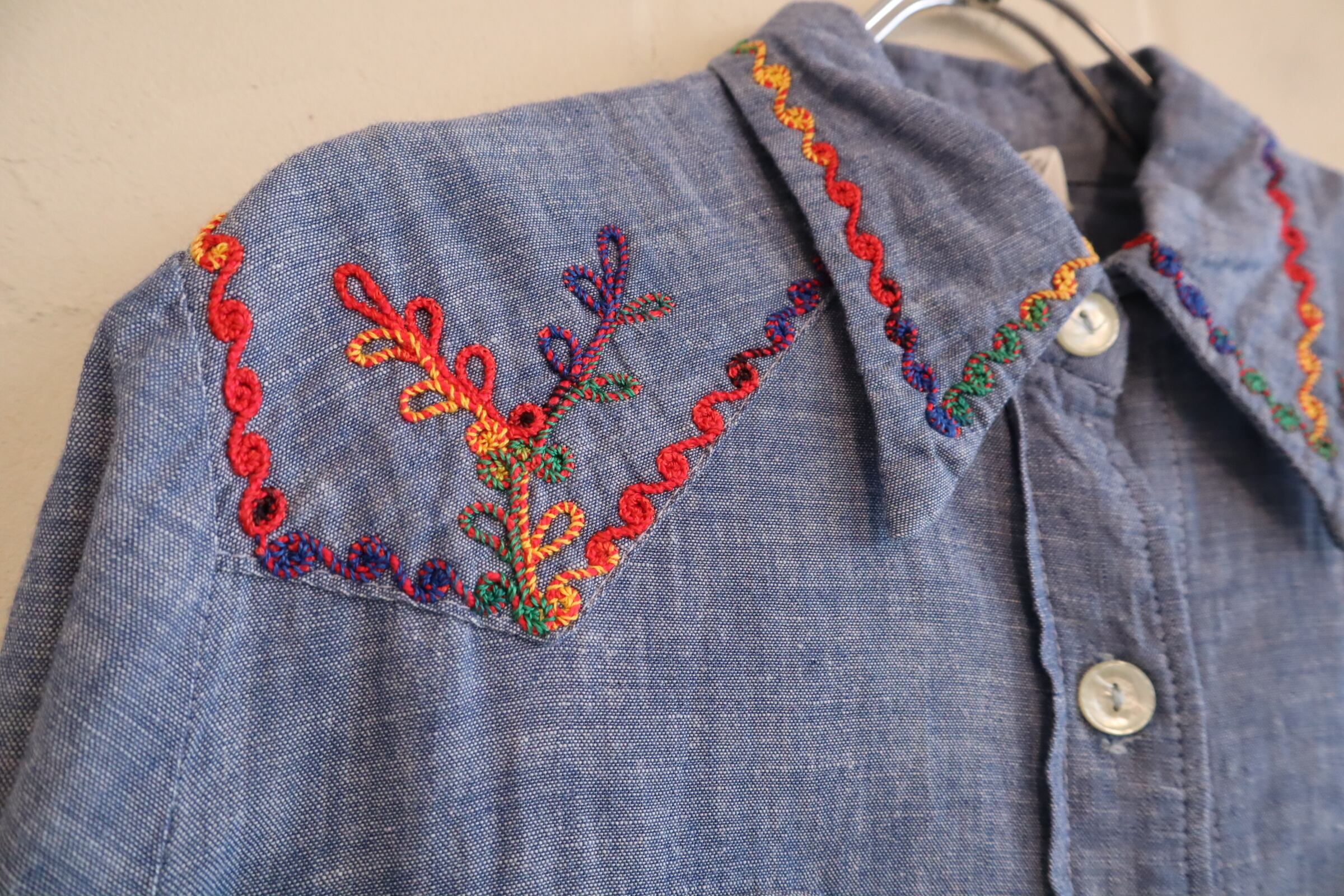 リーフとうねうねくるくるしたカラフルな刺繍がとても可愛いシャンブレーシャツ。