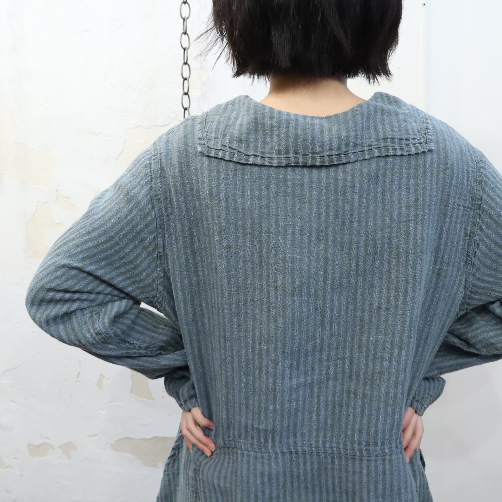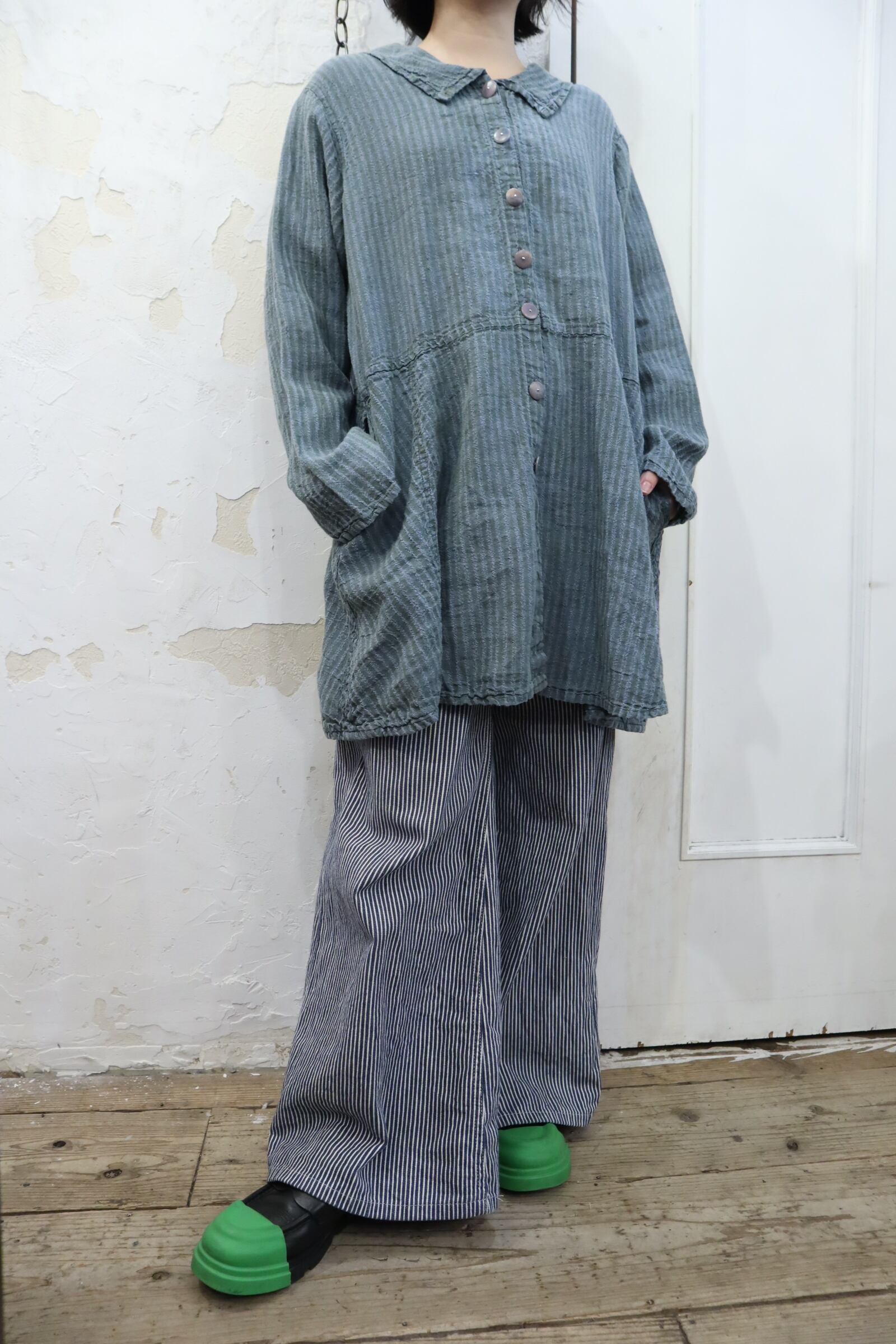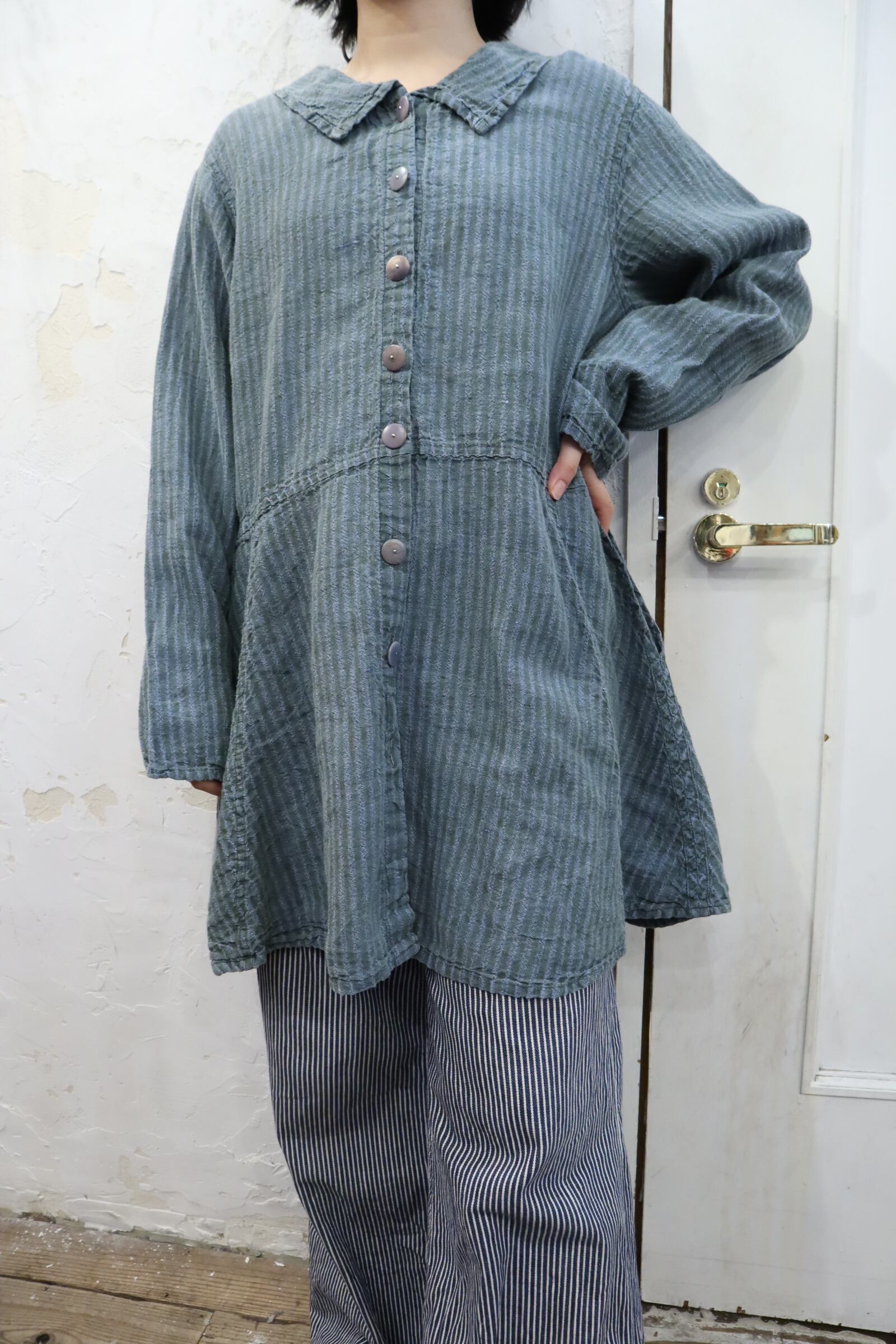 FLAX pailblue×mossgreen stripe linen shirt dress [k-2802]