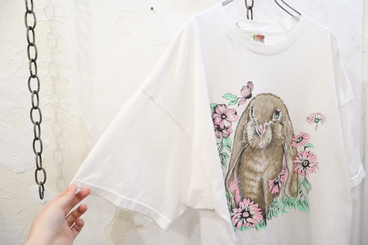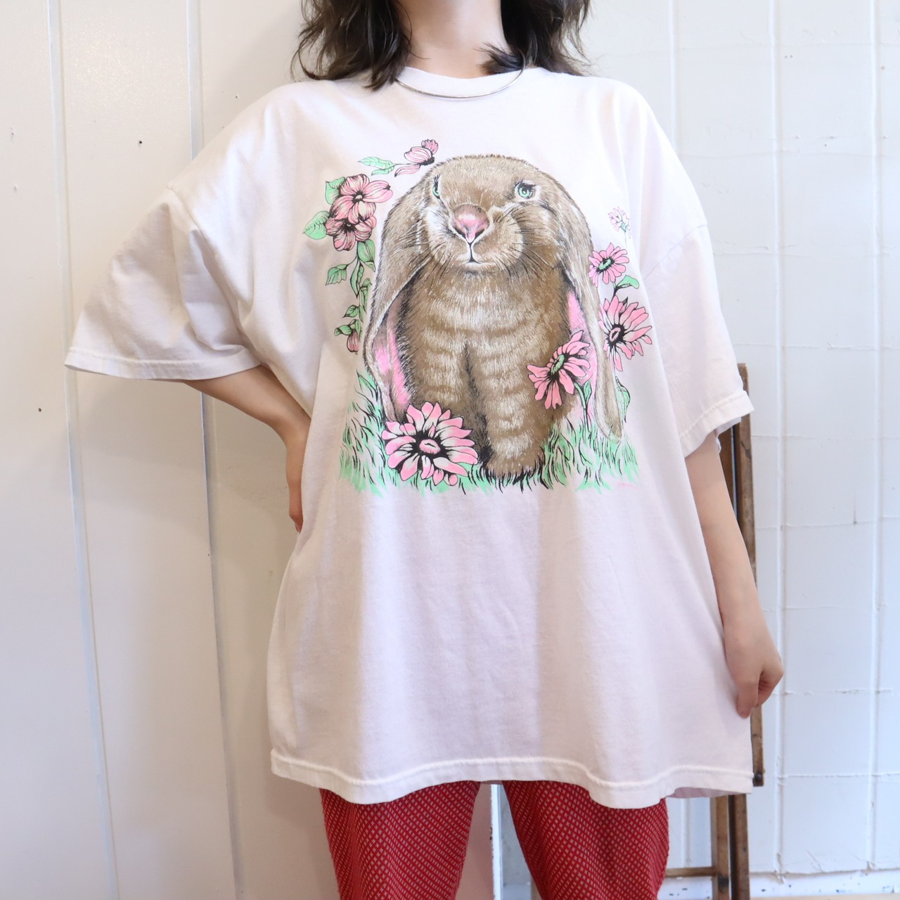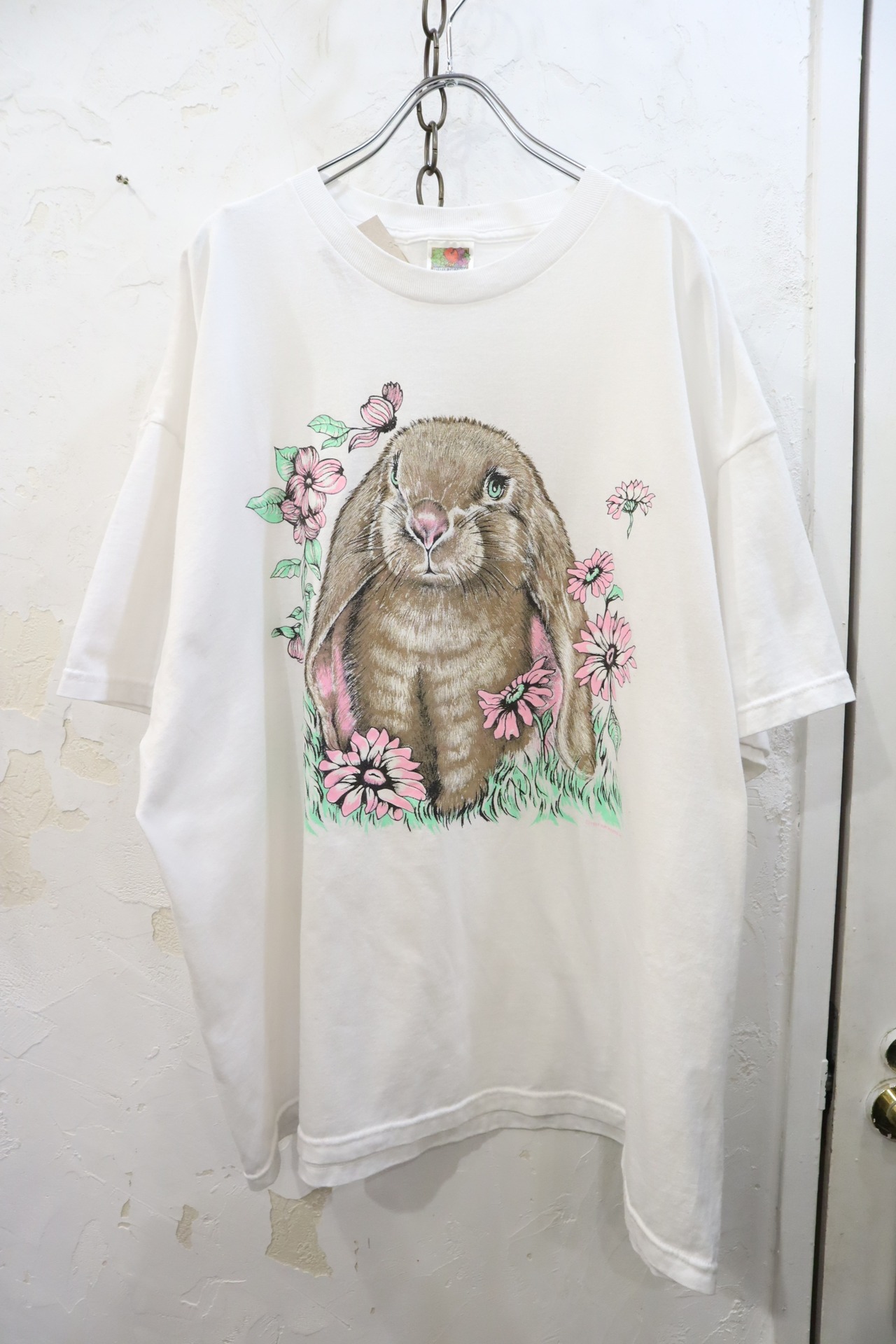 90s FRUIT OF THE LOOM white×brown×pink rabbit print T-shirt [l-2867]