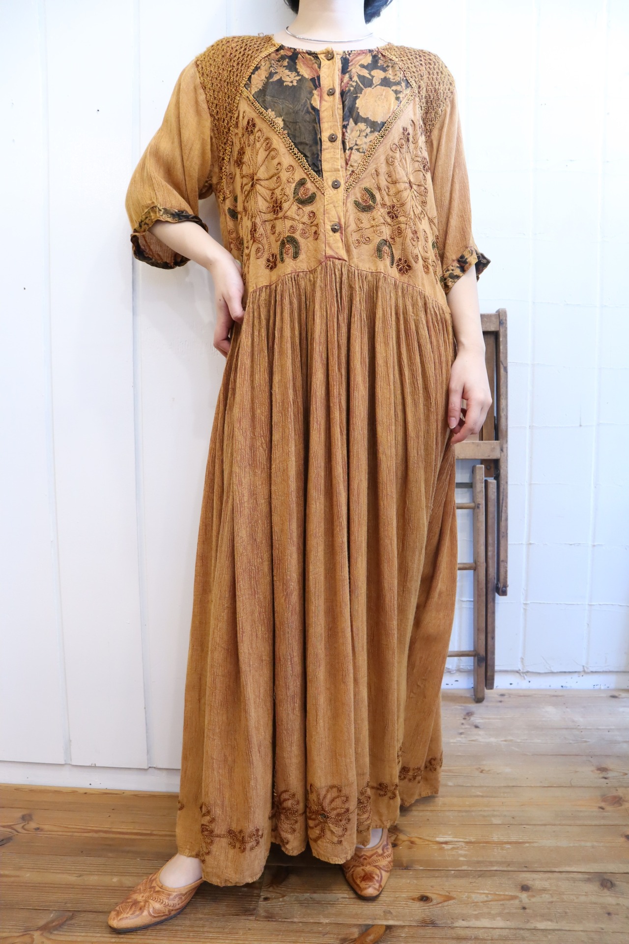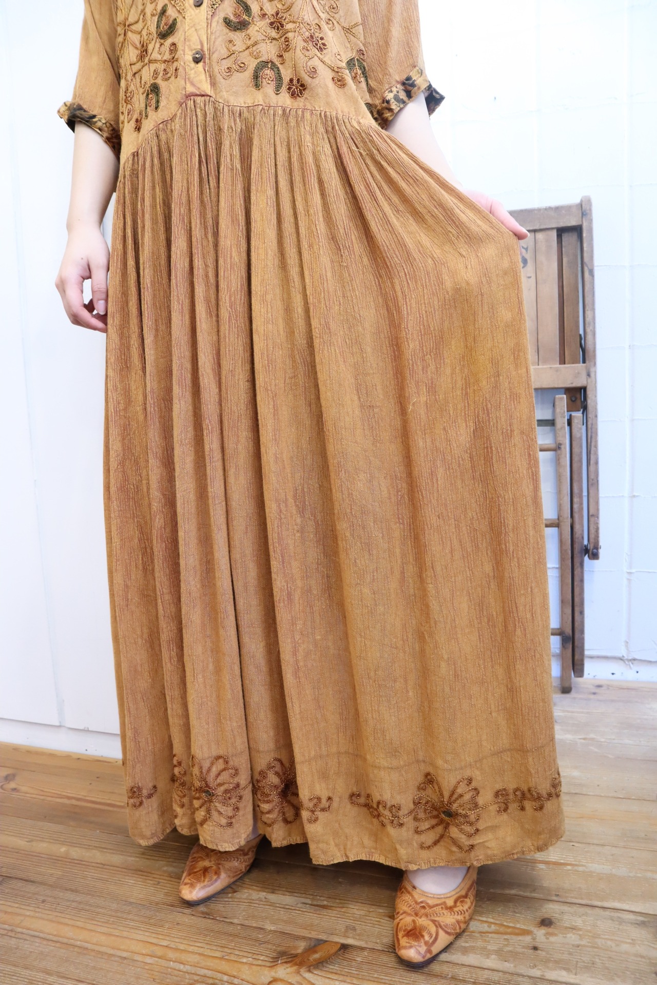 lightbrown×black embroidery flower Indian rayon dress [l-2882]