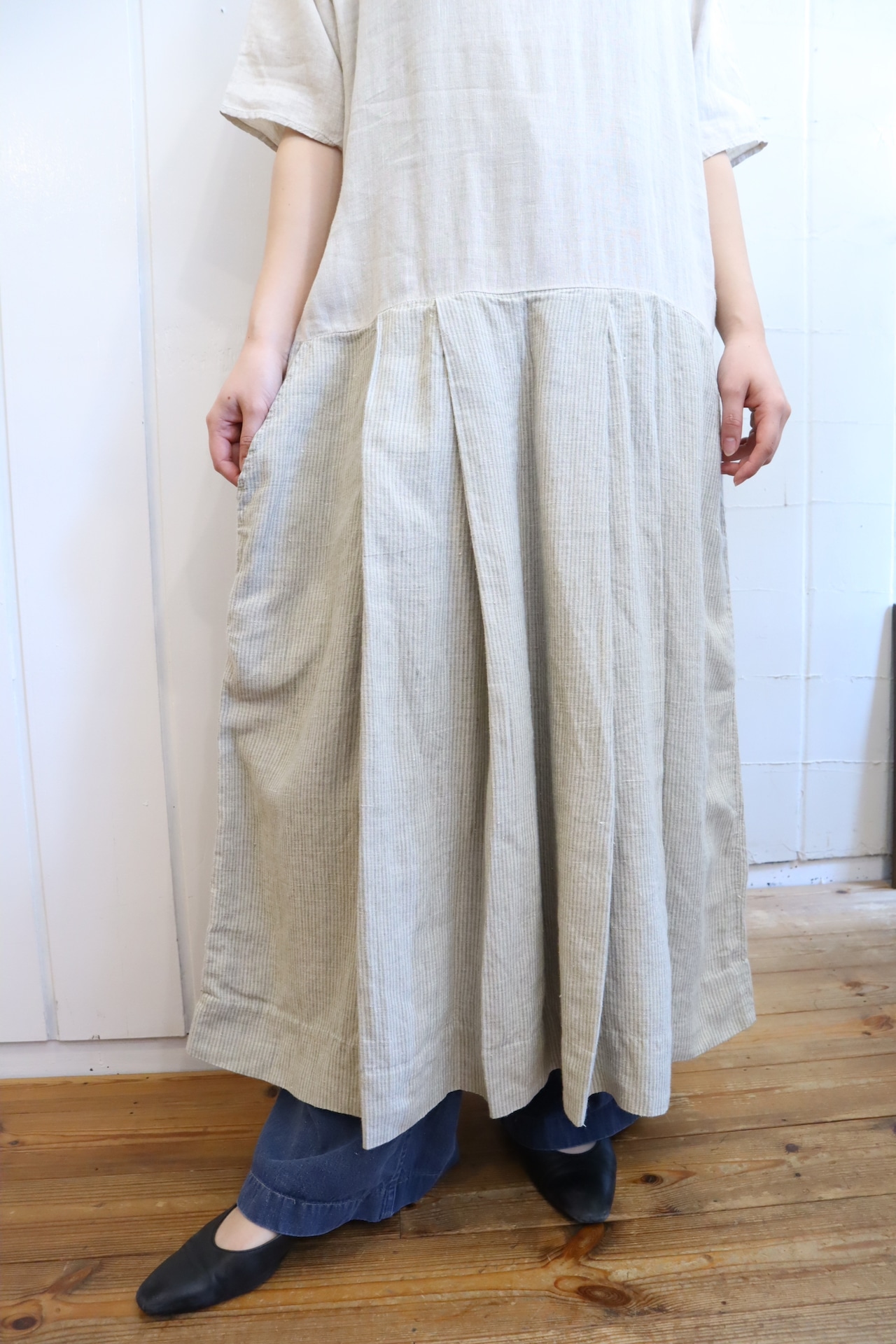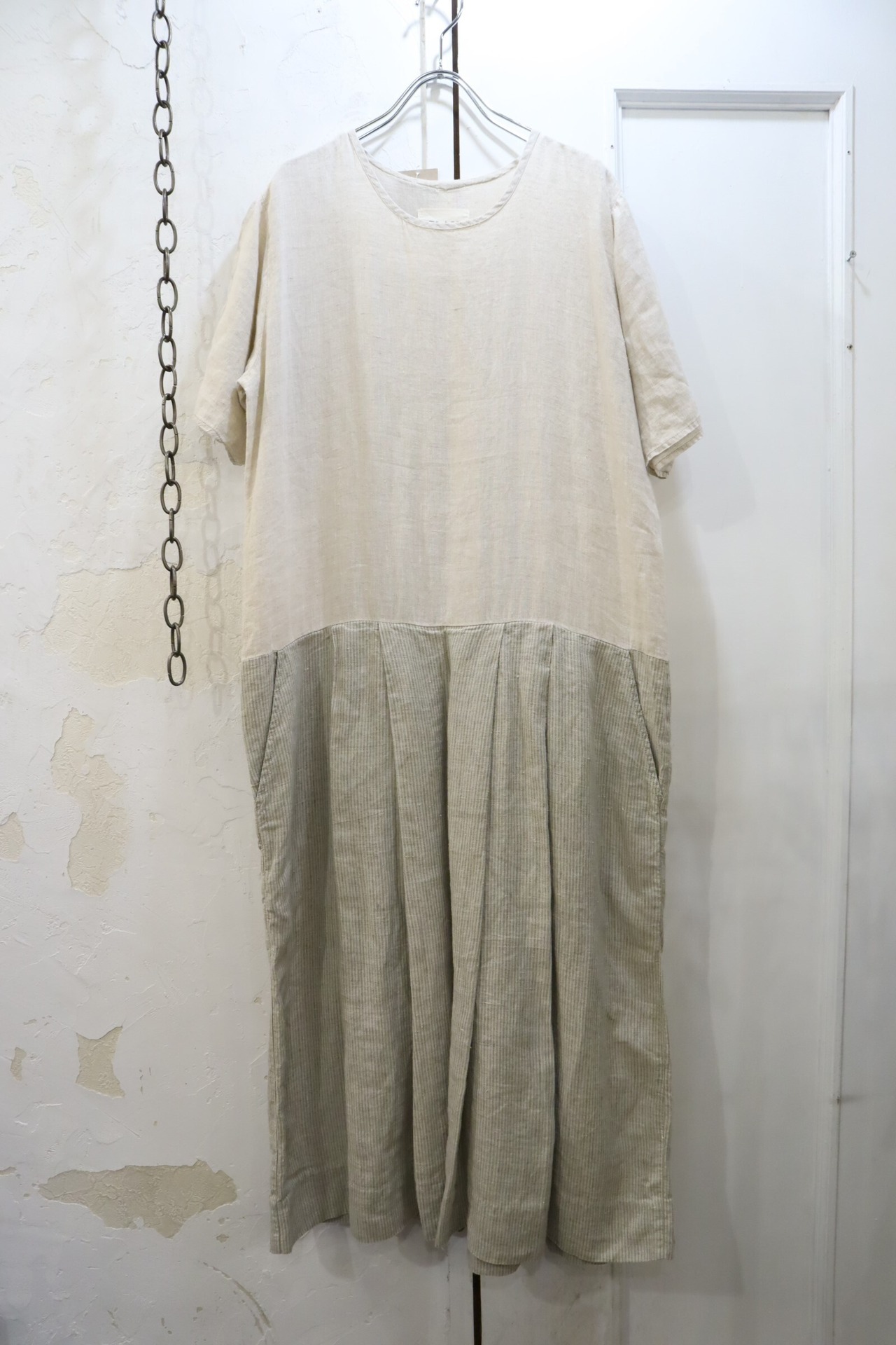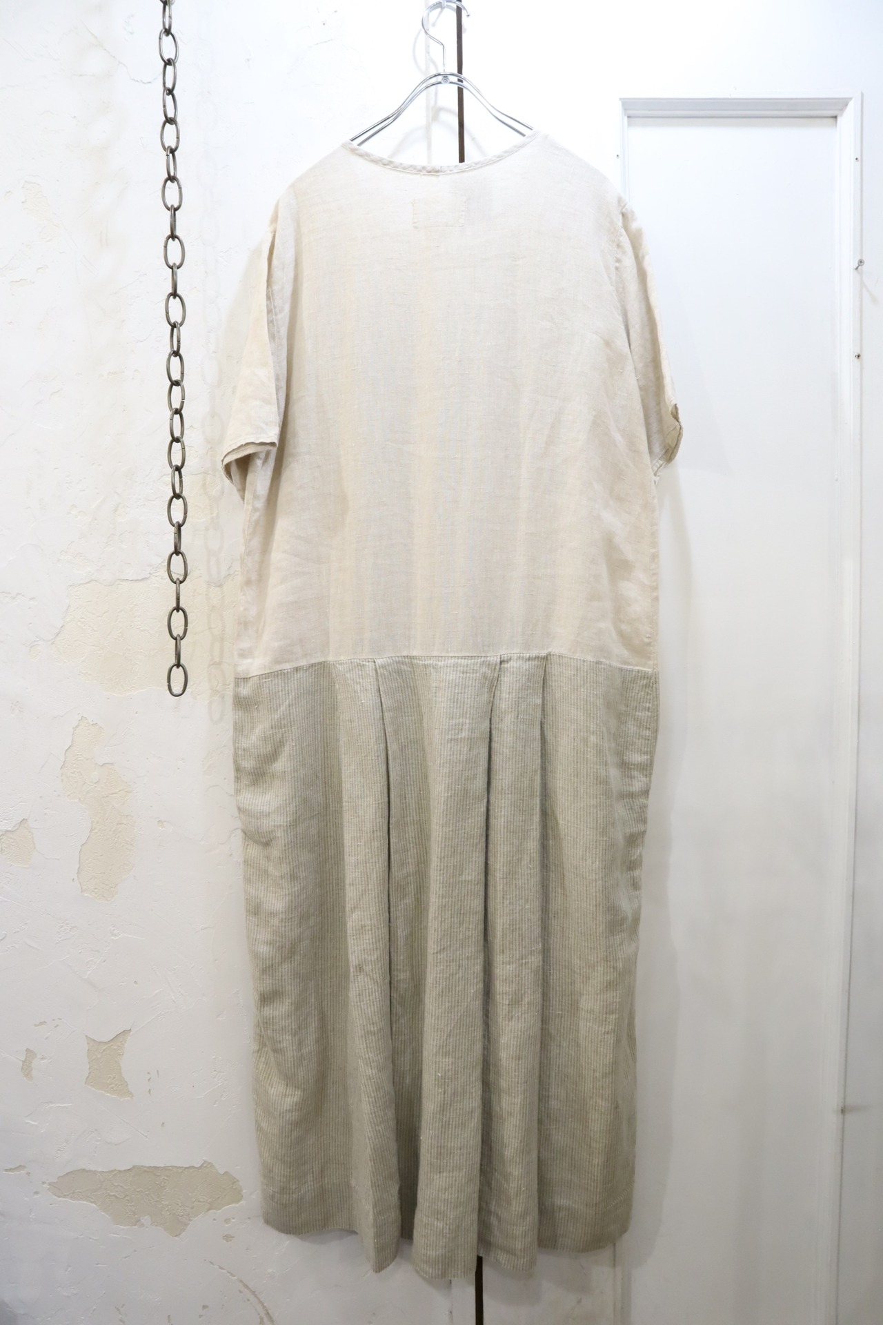 FLAX ecru×pailgreen plain&stripe linen dress [k-2895]
