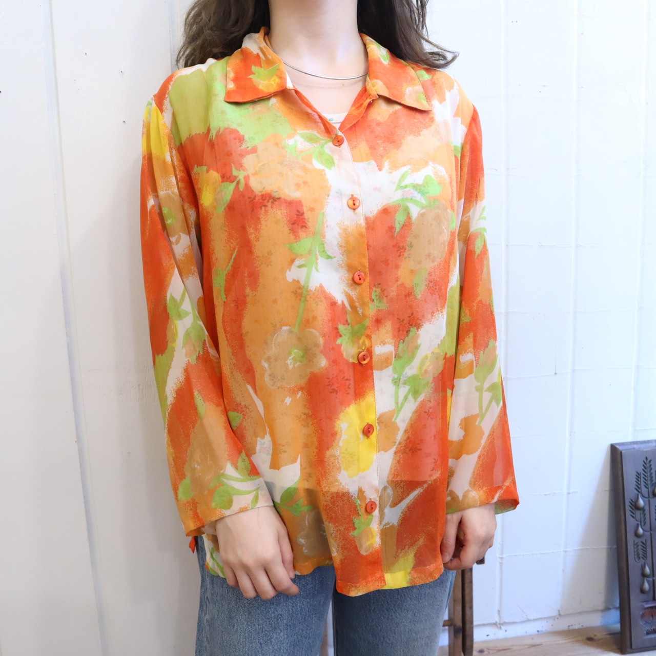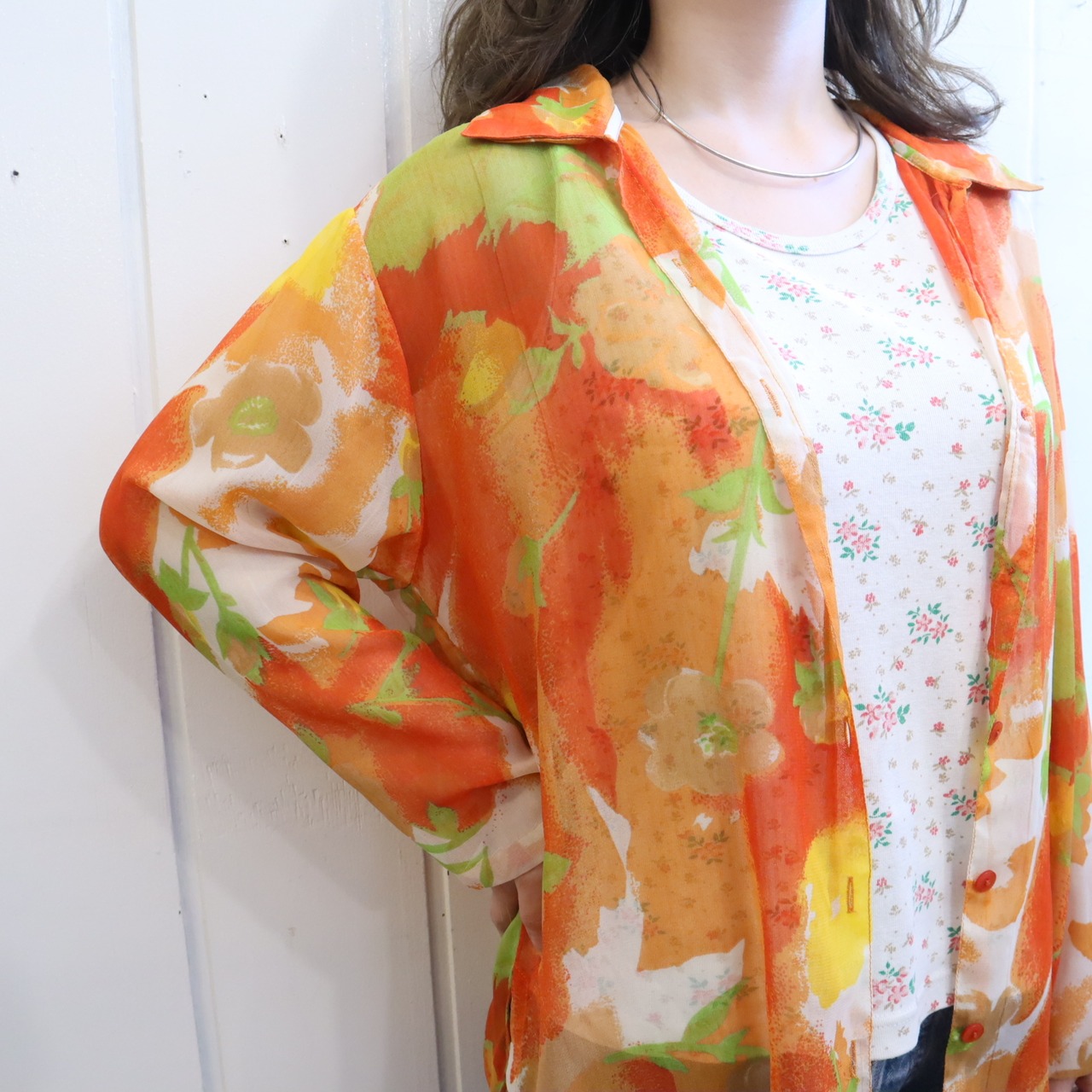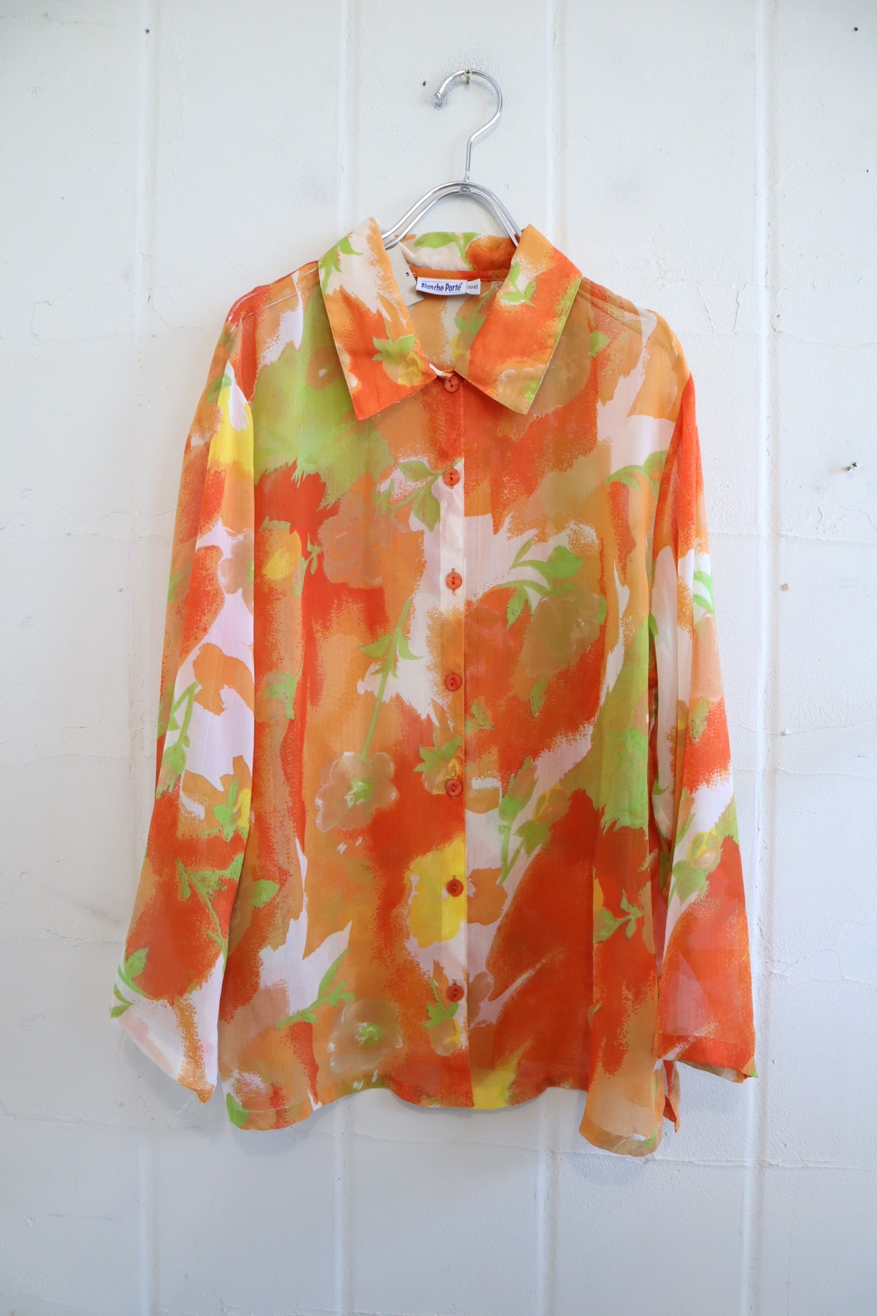 orange×lightgreen flower pattern see through shirt [l-2928]