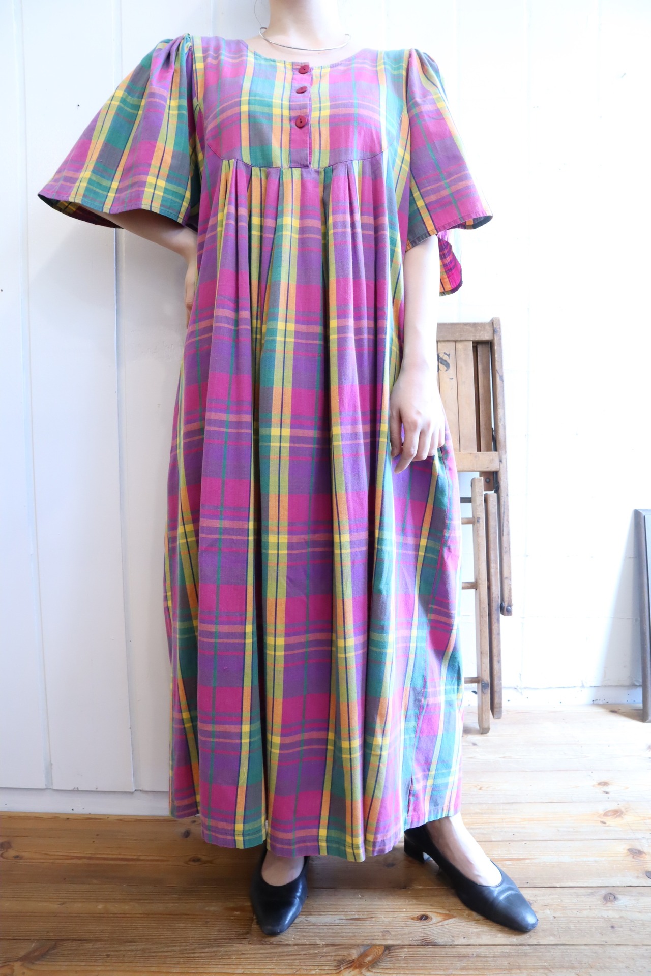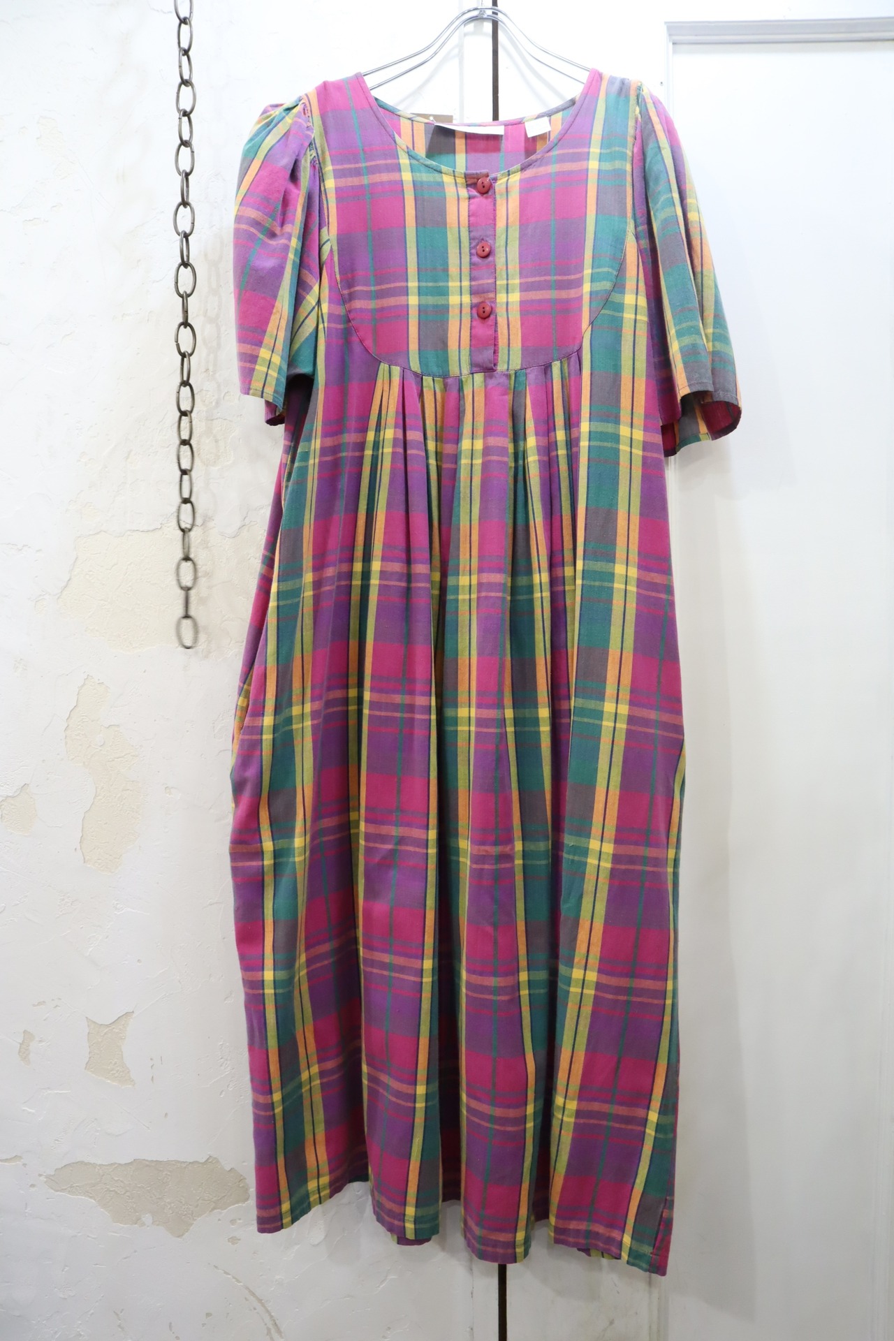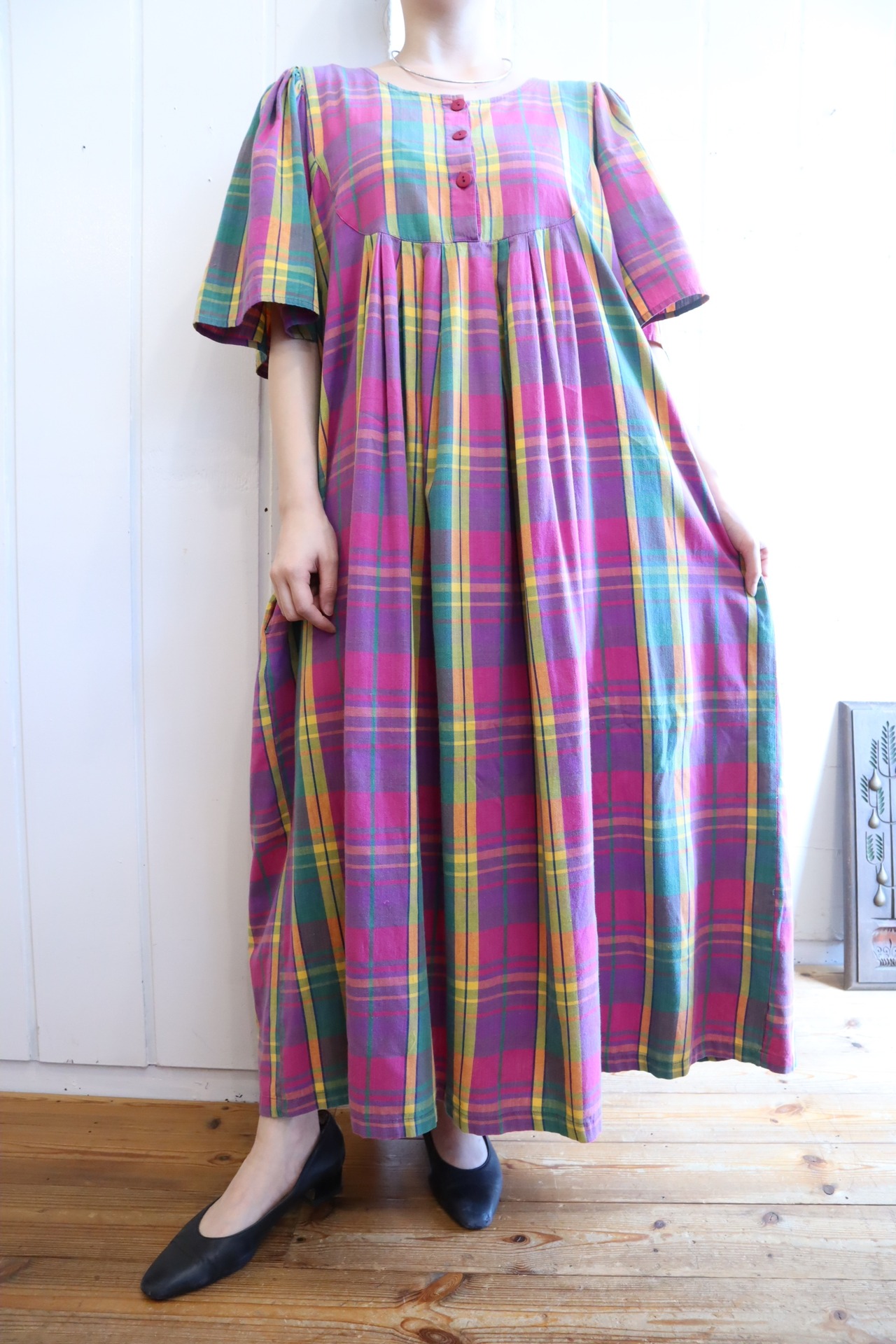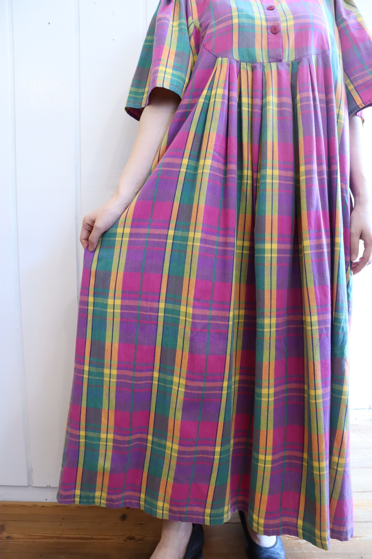 purplepink×yellow×green plaid short sleeve dress [l-2933]