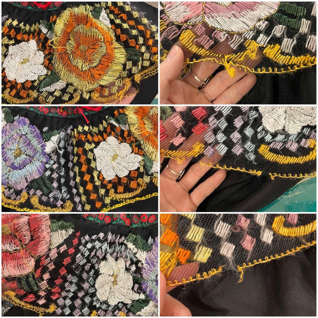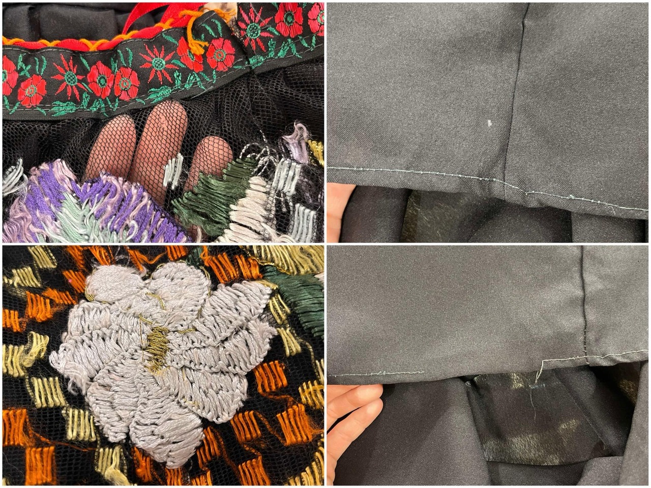 チュールに小穴、刺繍にシミやボディに小さな白い汚れ、裾にステッチのホツレが見受けられますが、いずれも古着の味として着ていただけるかと思います。