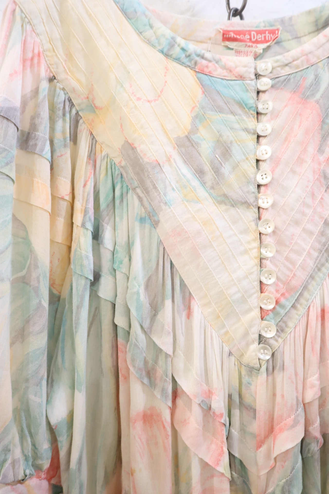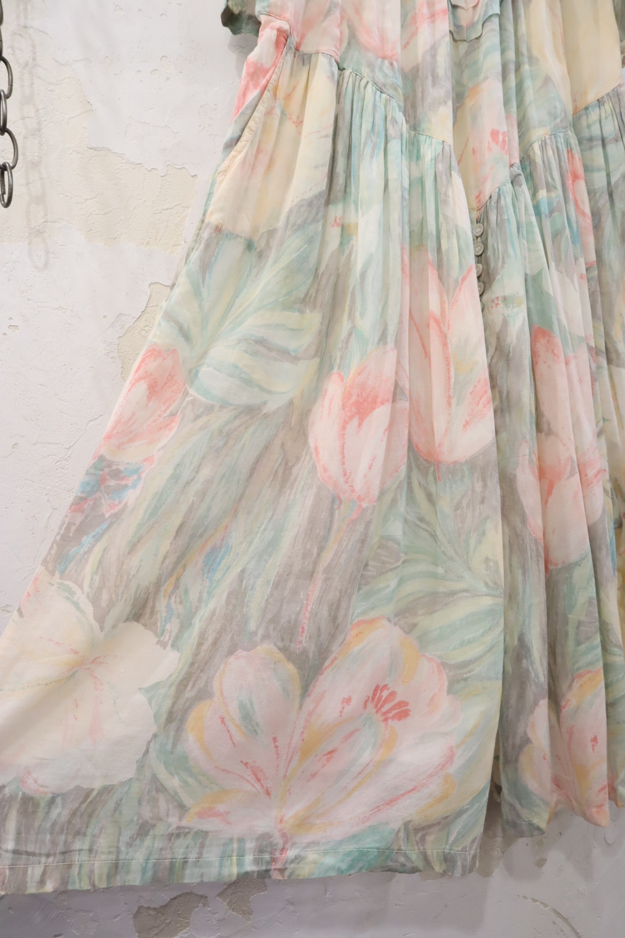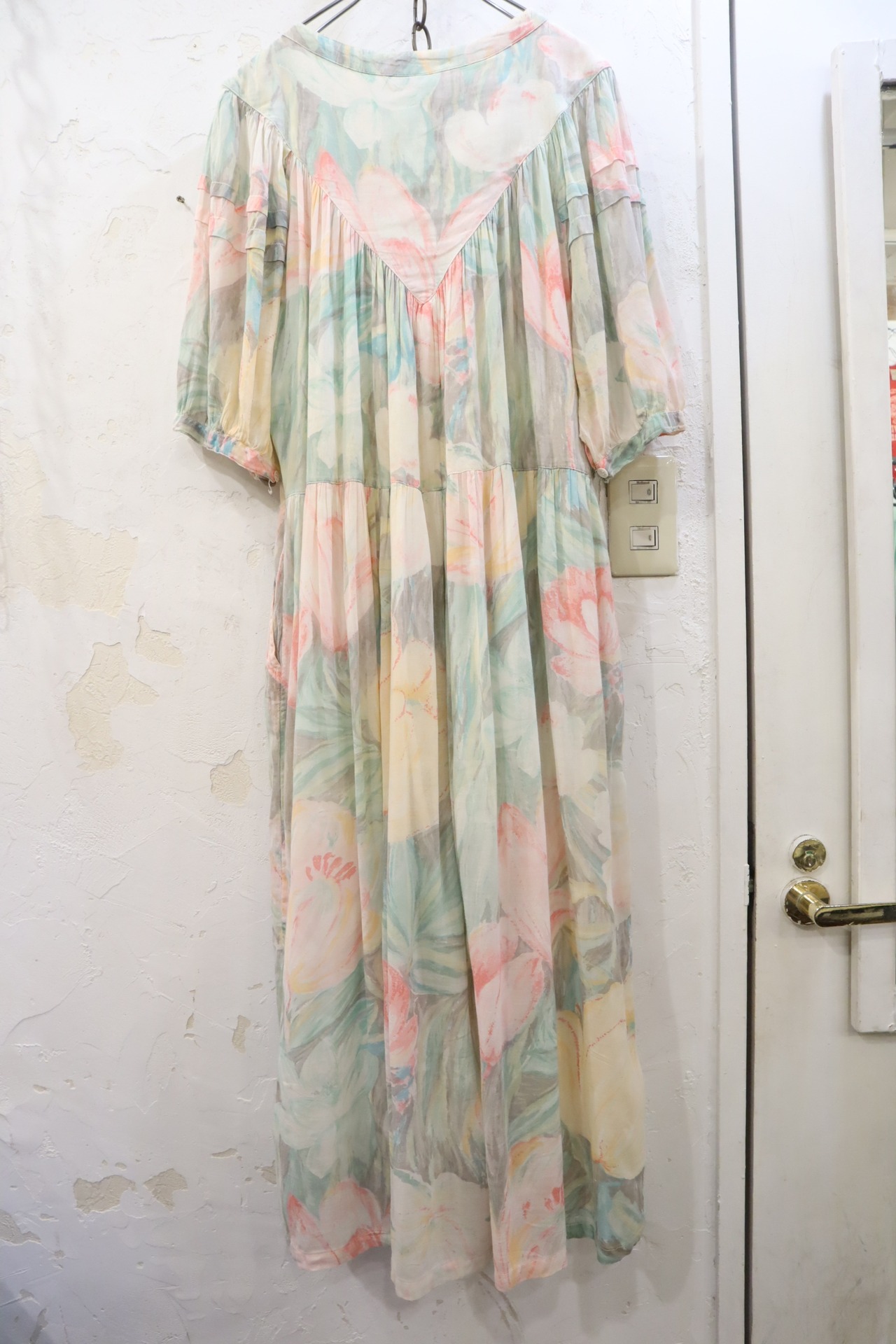 70s- lightgreen×lightpink flower pattern gaze dress [l-2945]