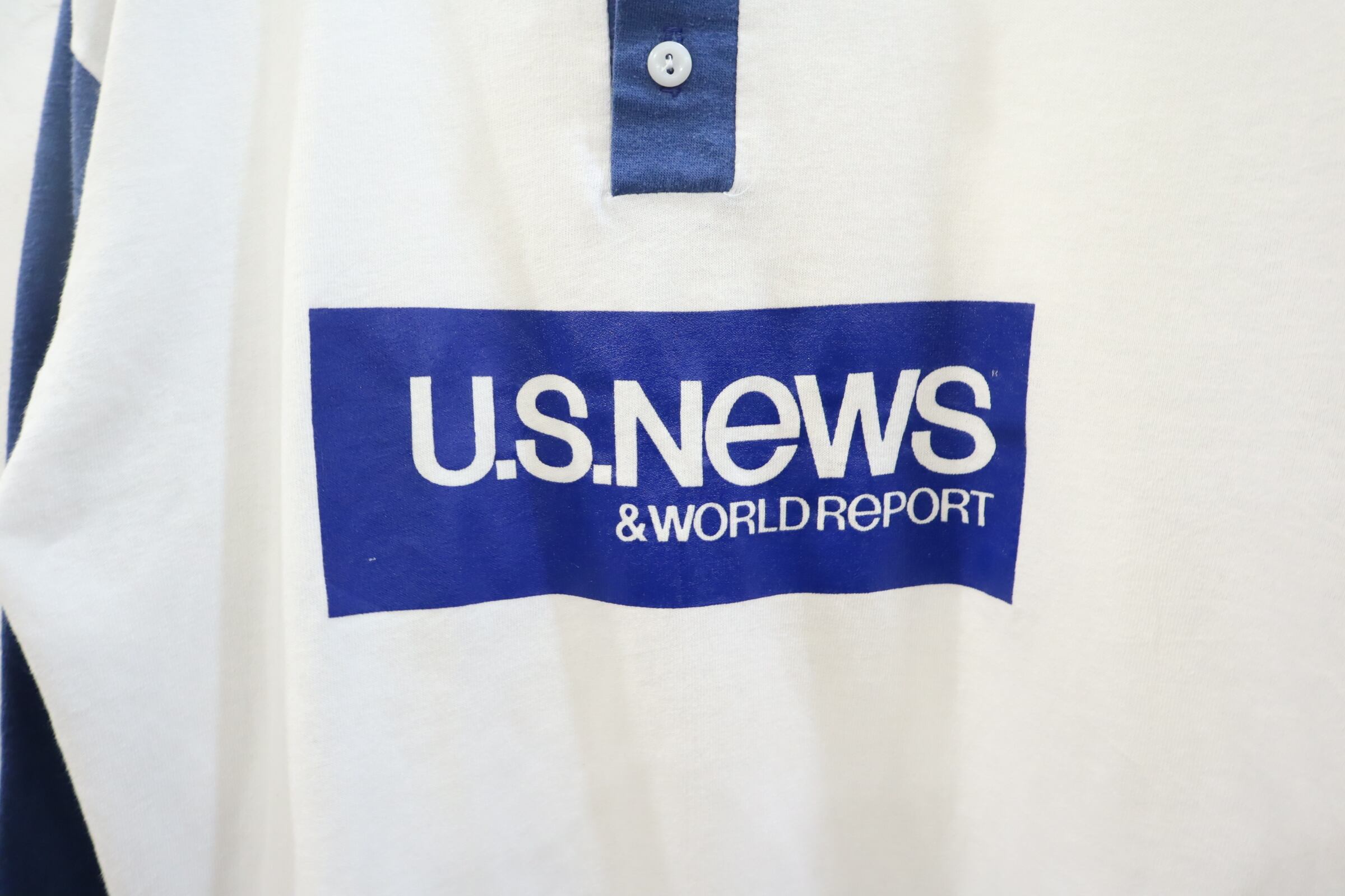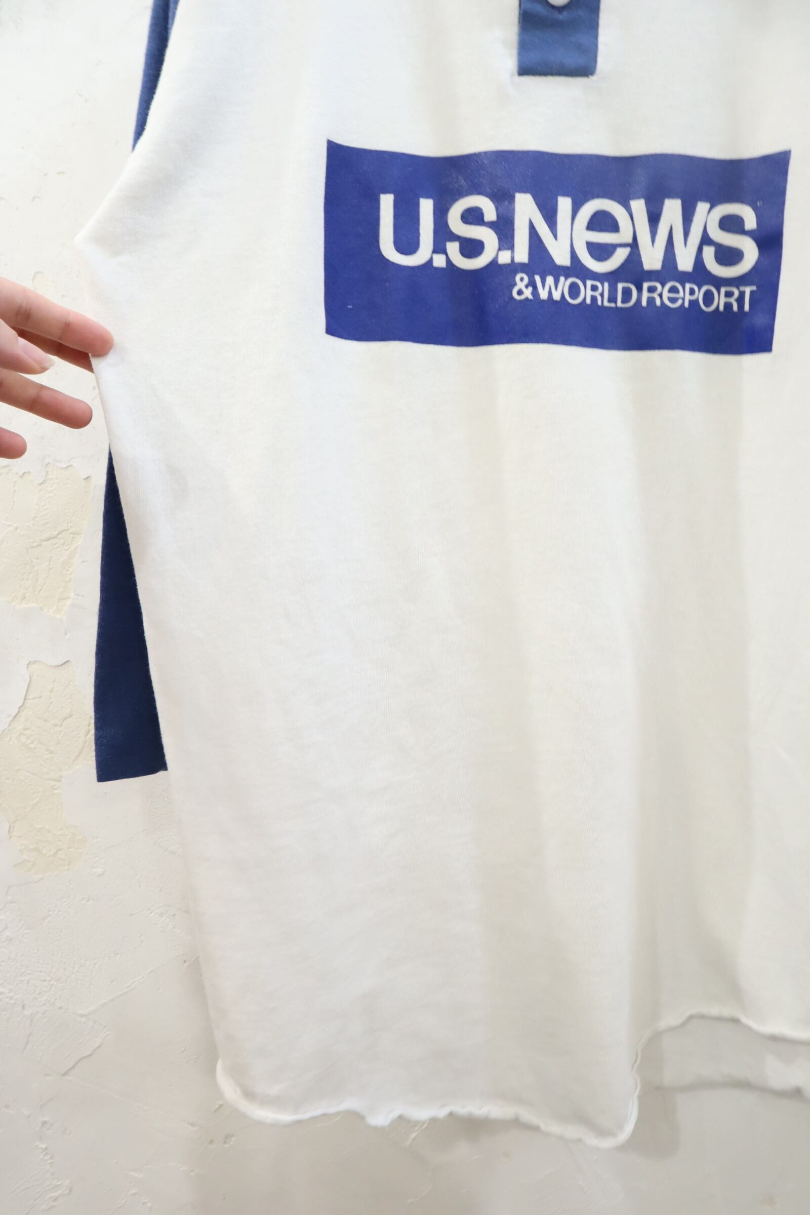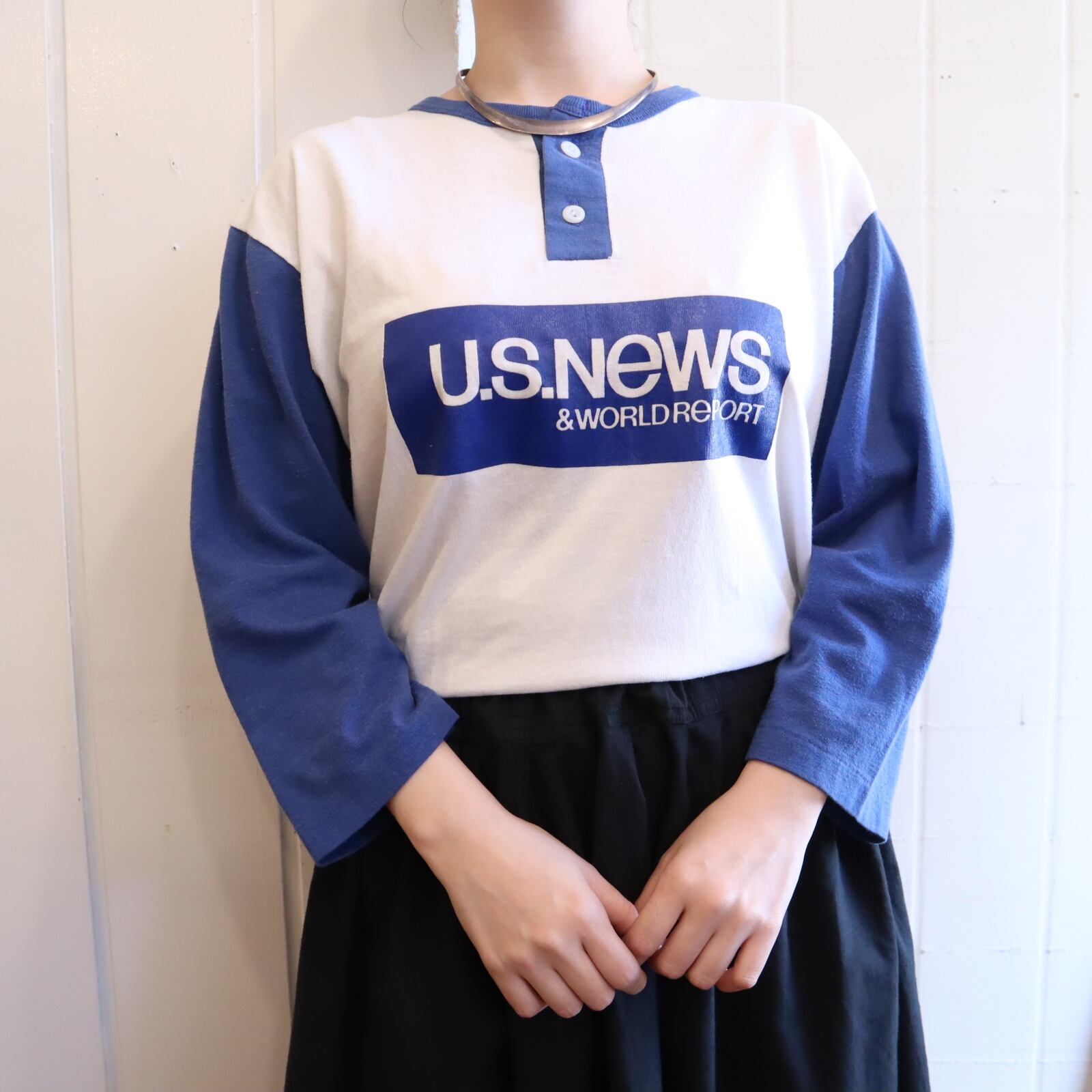 made in USA 80s white×blue rubber print henry neck tee [l-2946]