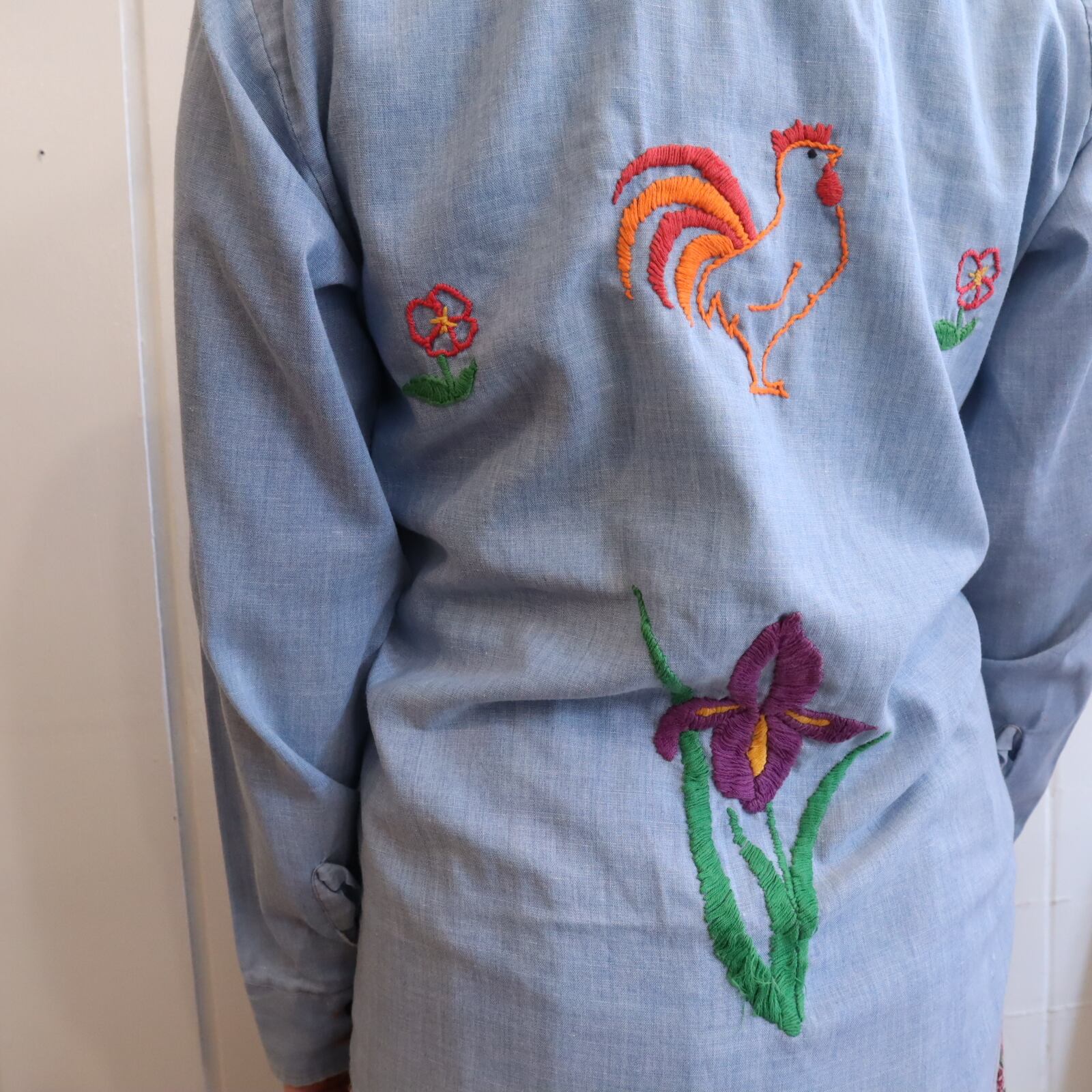 70s lightblue×colorful embroidery chambray shirt [l-3012]