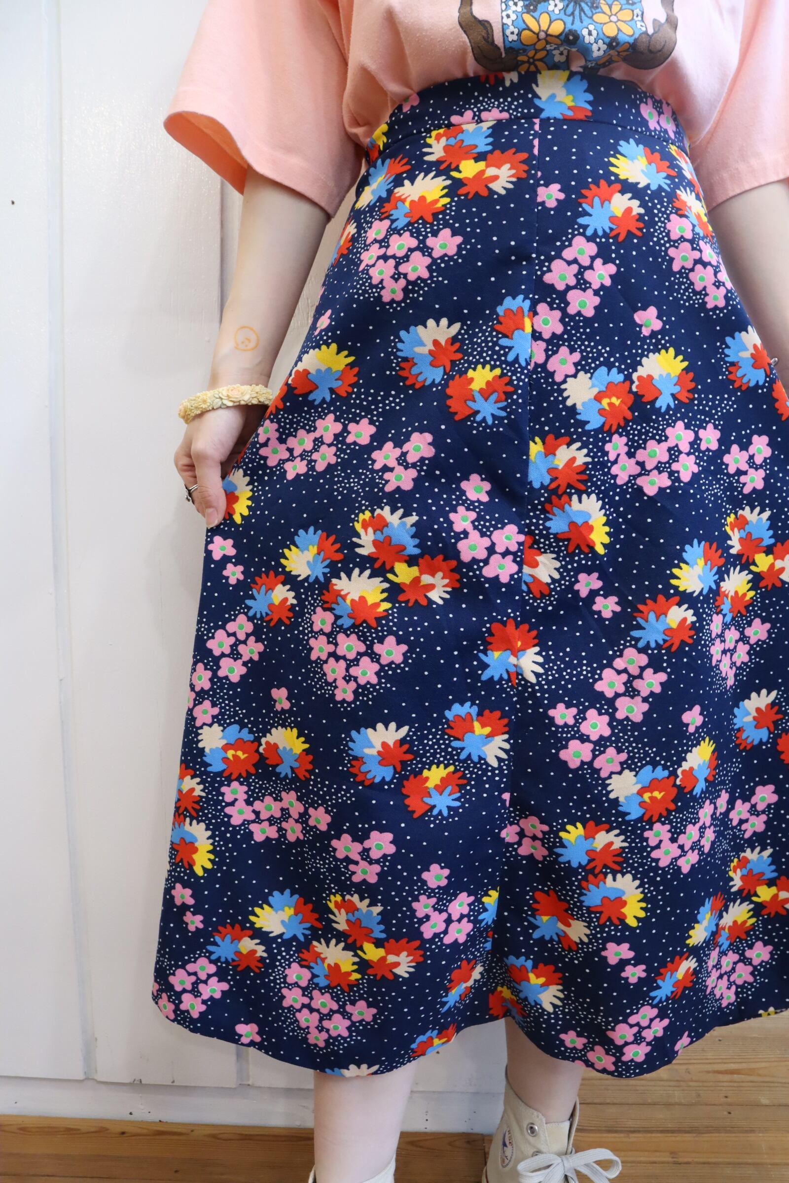 70s navy×pink dot & flower pattern skirt [l-3041]
