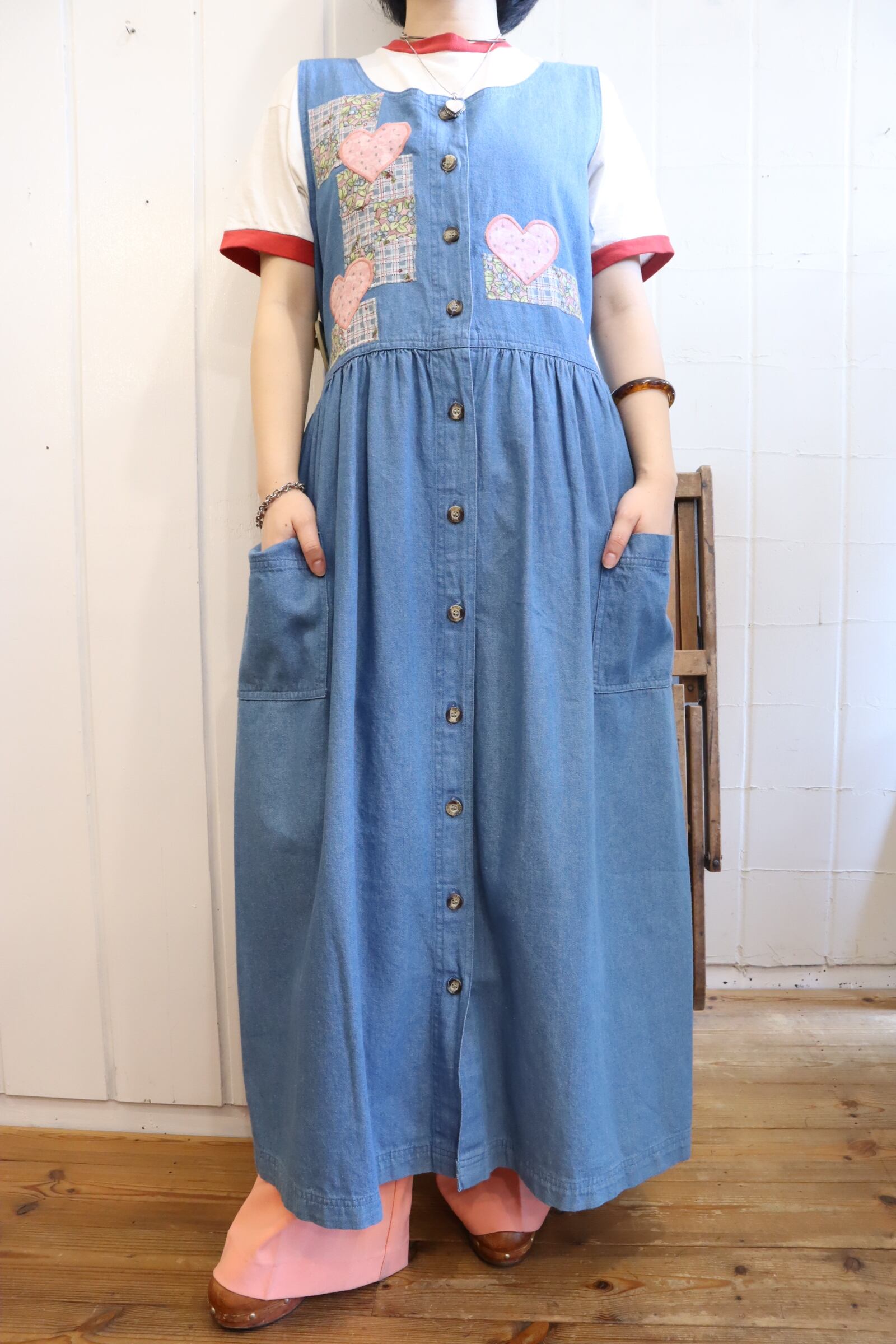 indigoblue×lightpink heart patch denim dress [l-3055]
