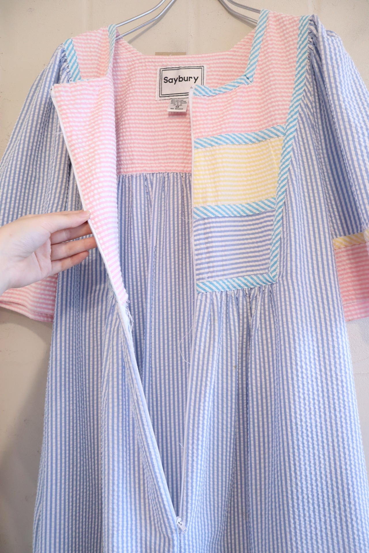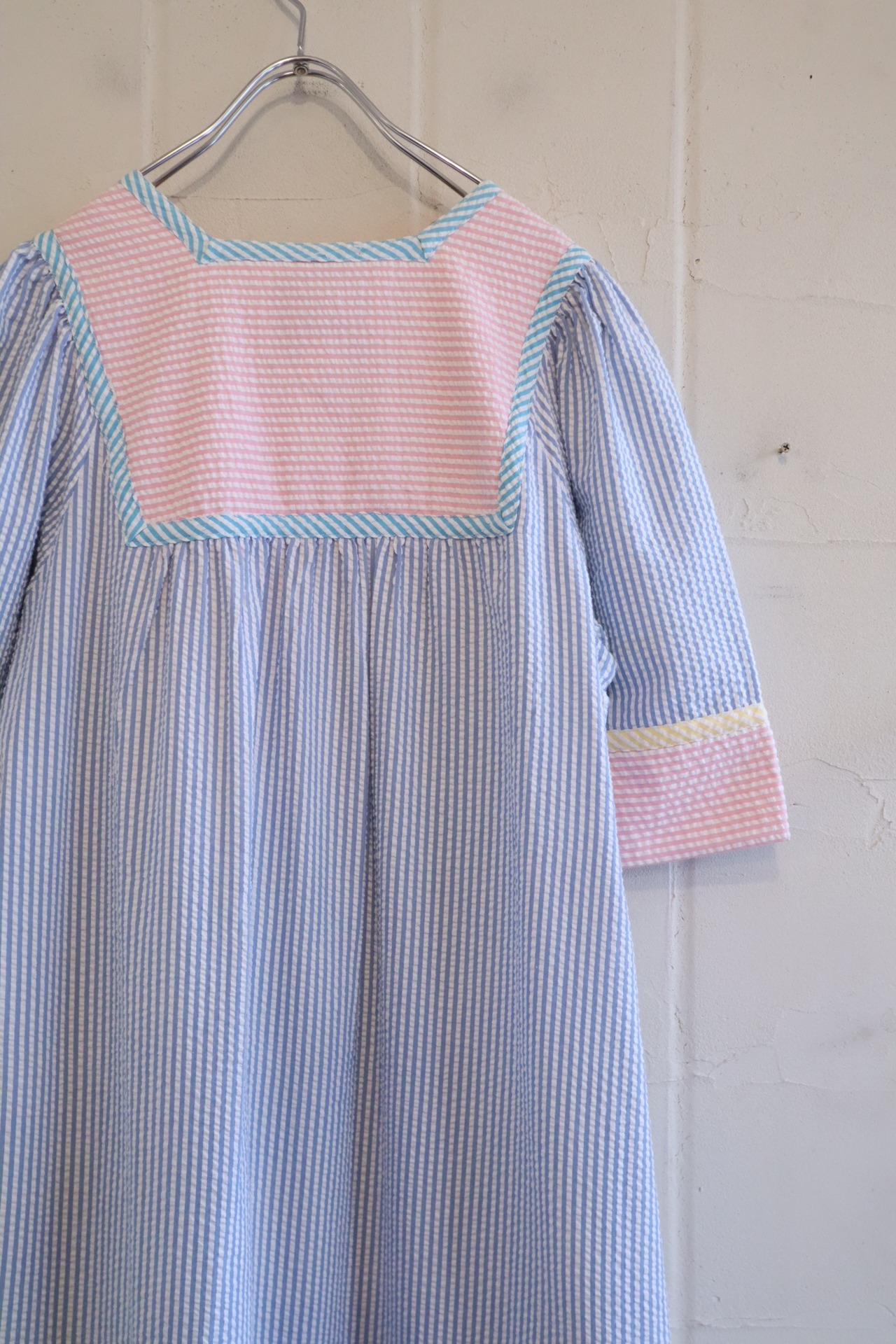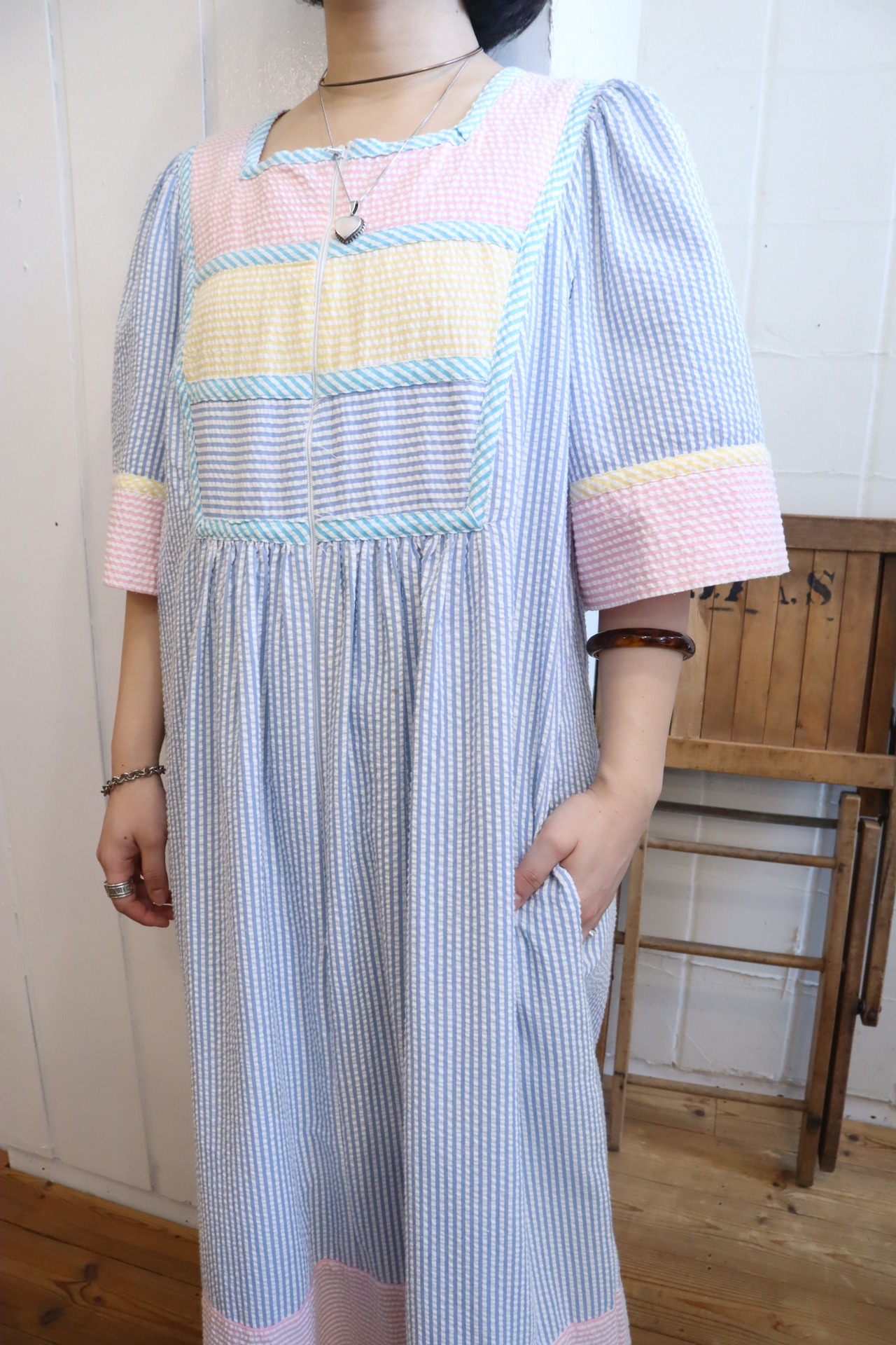 80s paleblue×palepink stripe front half zip seersucker dress [l-3056]
