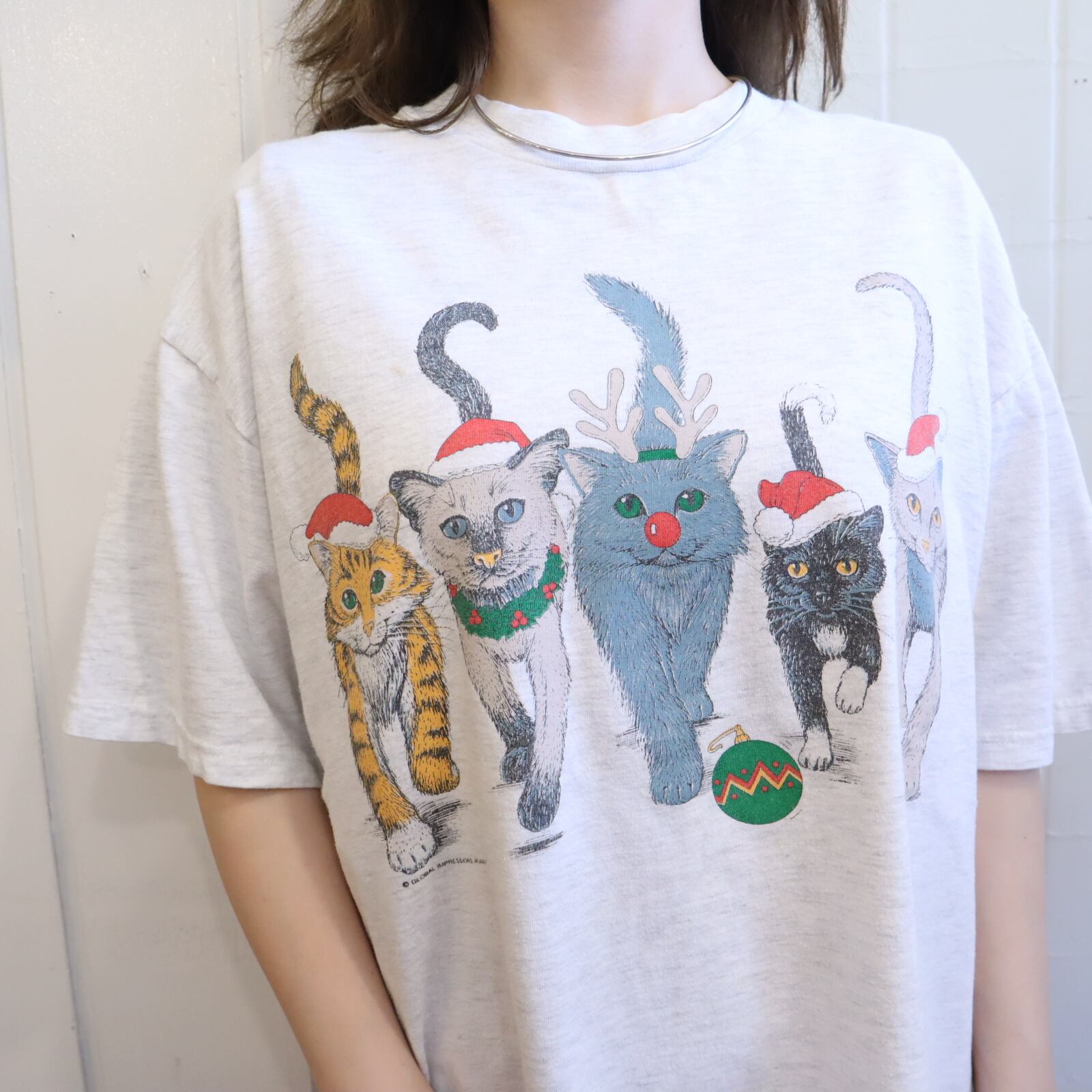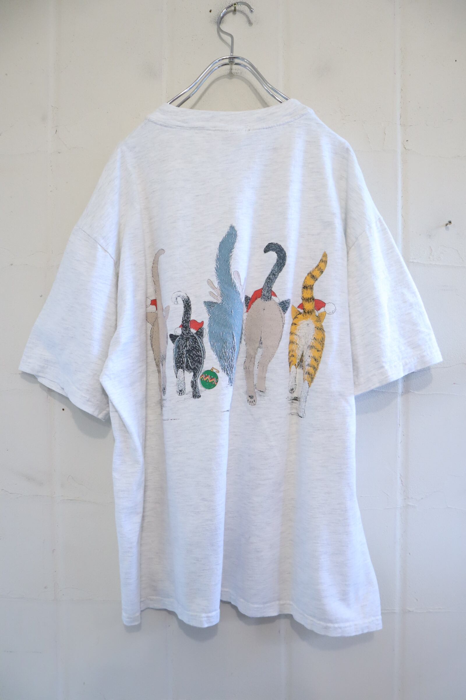 90s lighgray×dullblue christmas cat print T-shirt [l-3076]