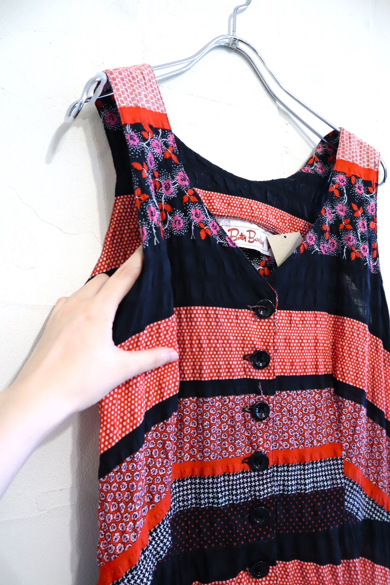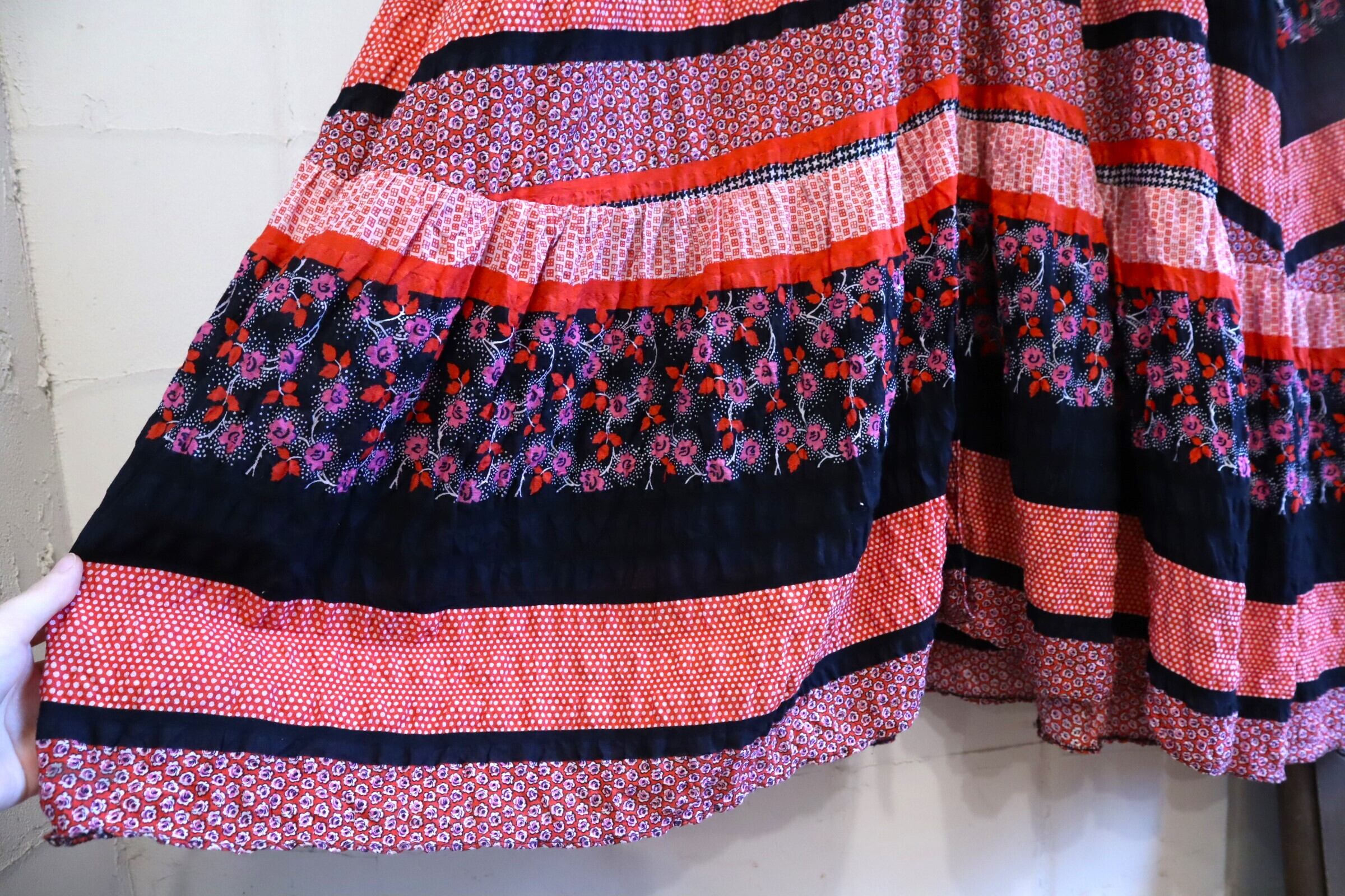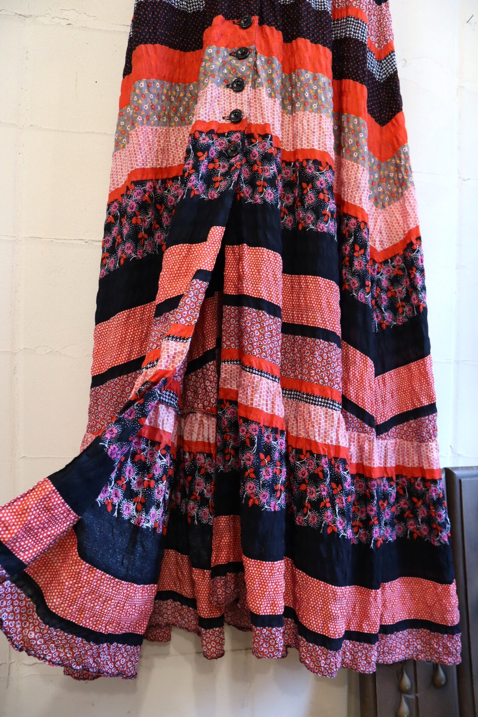 落ち着いたカラーリングで、大人に着こなせる70年代頃のマキシ丈のドレス。