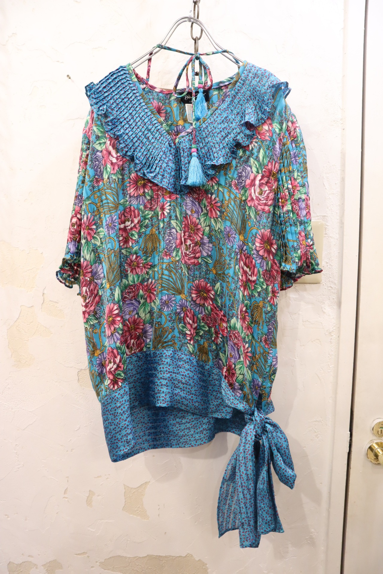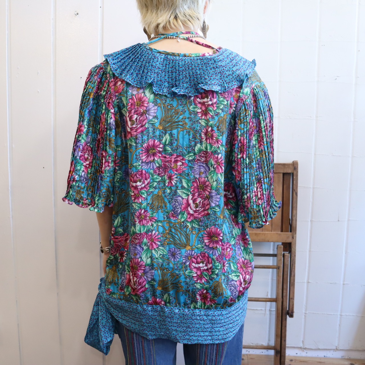 80s Diane Freis blue×pink×green flower frill tops [l-3104]