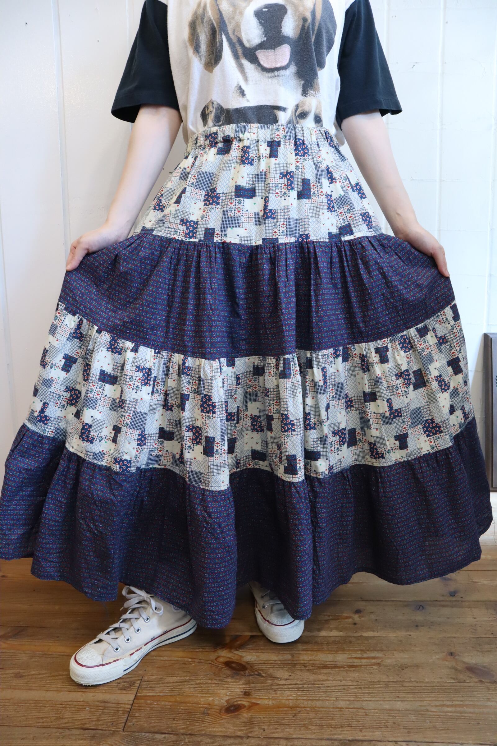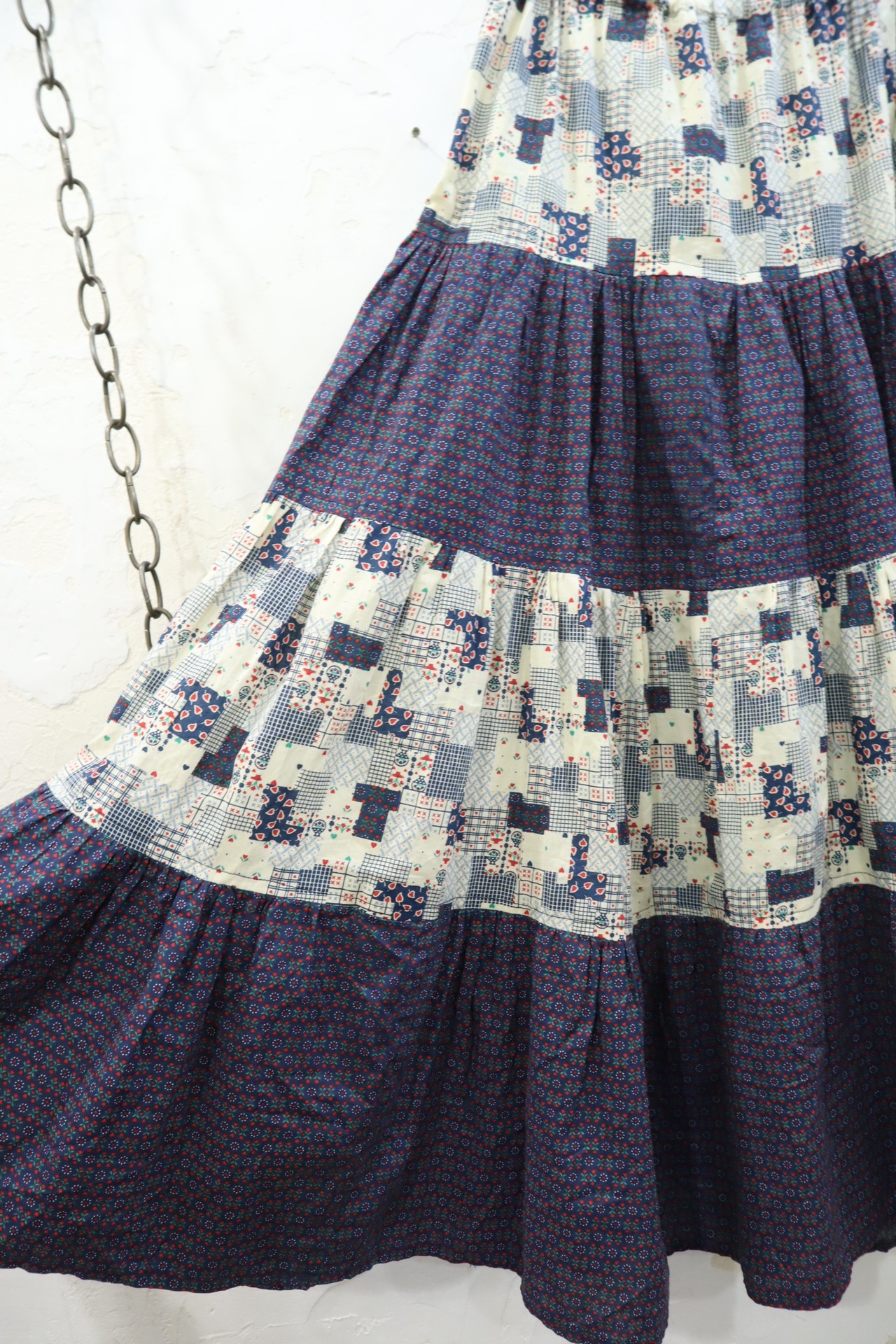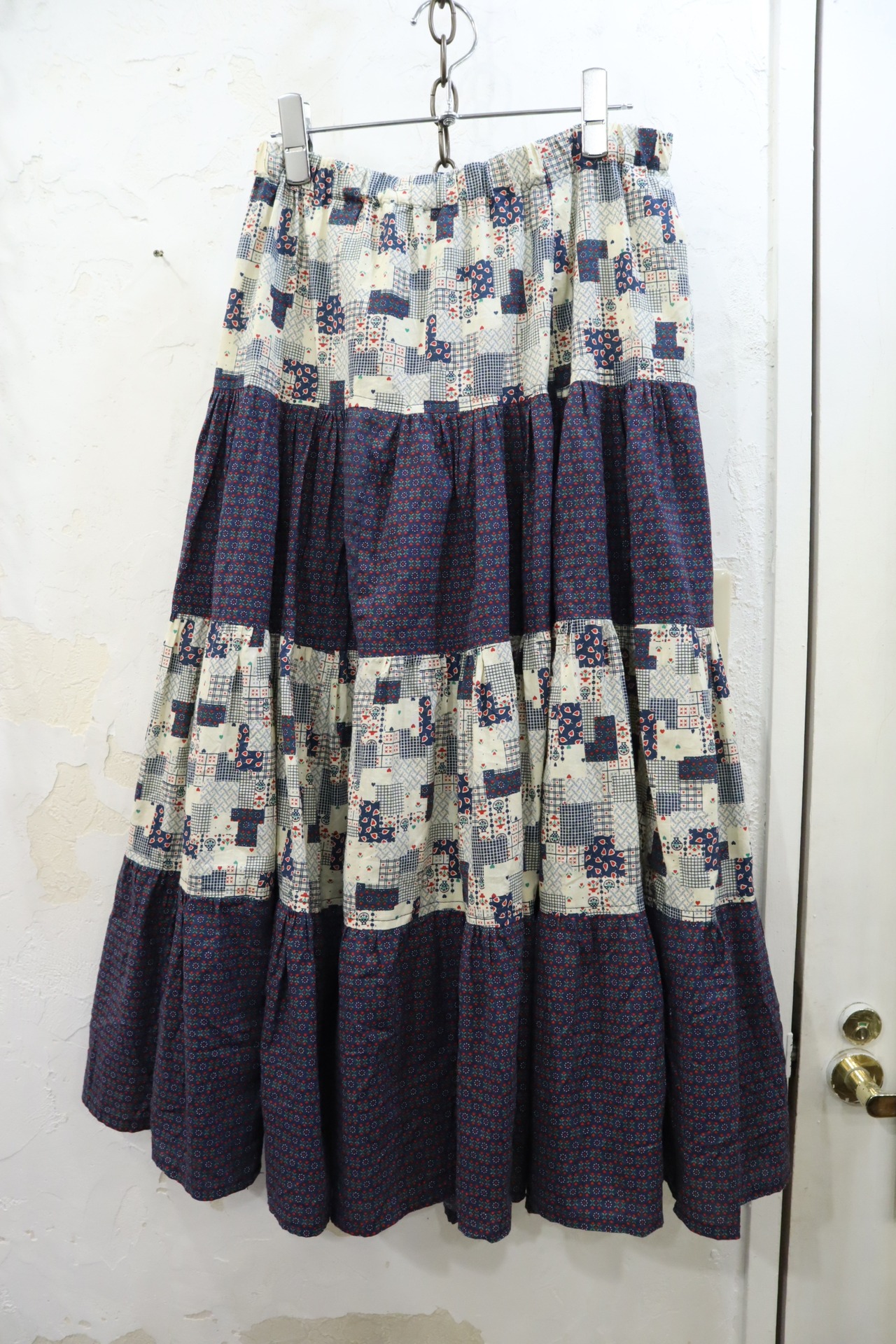 navy×offwhite×red flower&plaid pattern tiered skirt [l-3188]