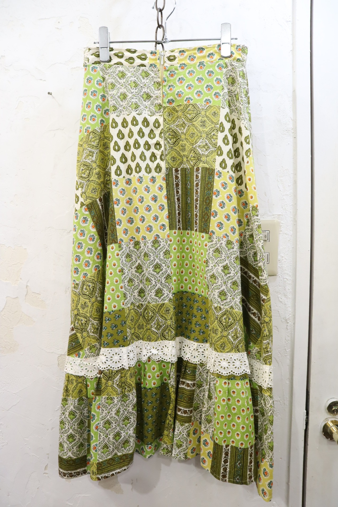 green×khaki×white patchwork pattern lace skirt [l-3190]