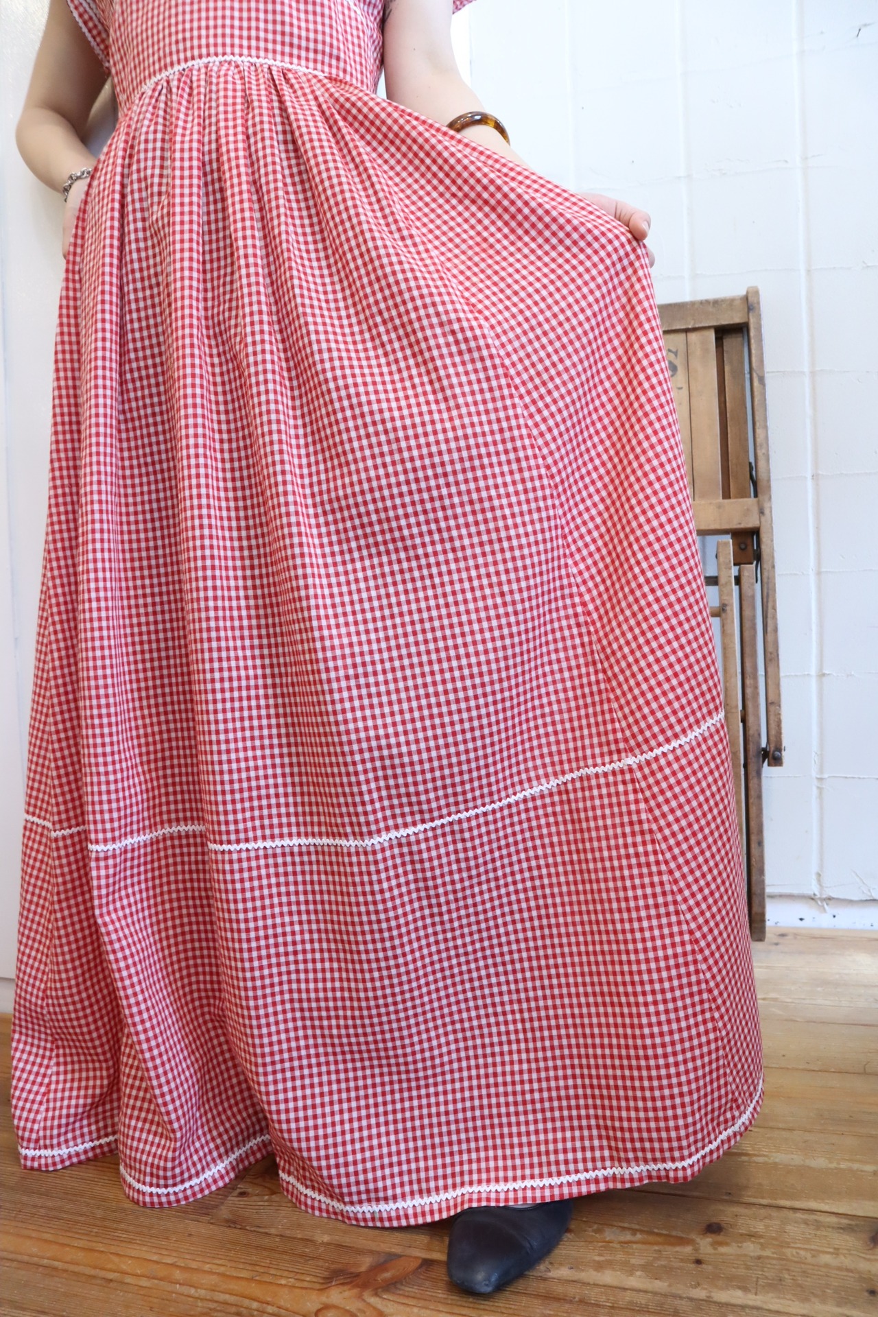 70s red×white ginghamcheck long dress [l-3217]