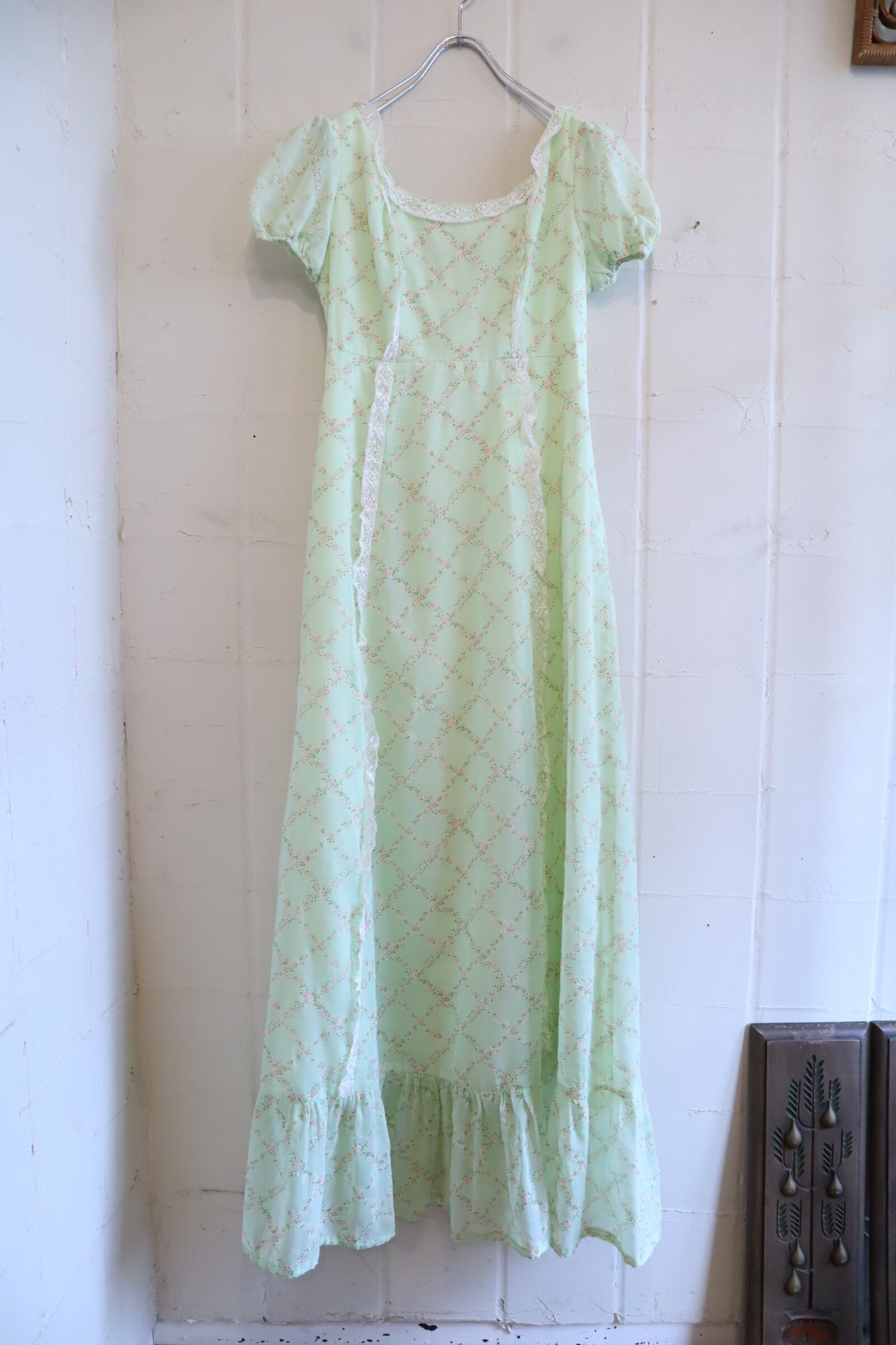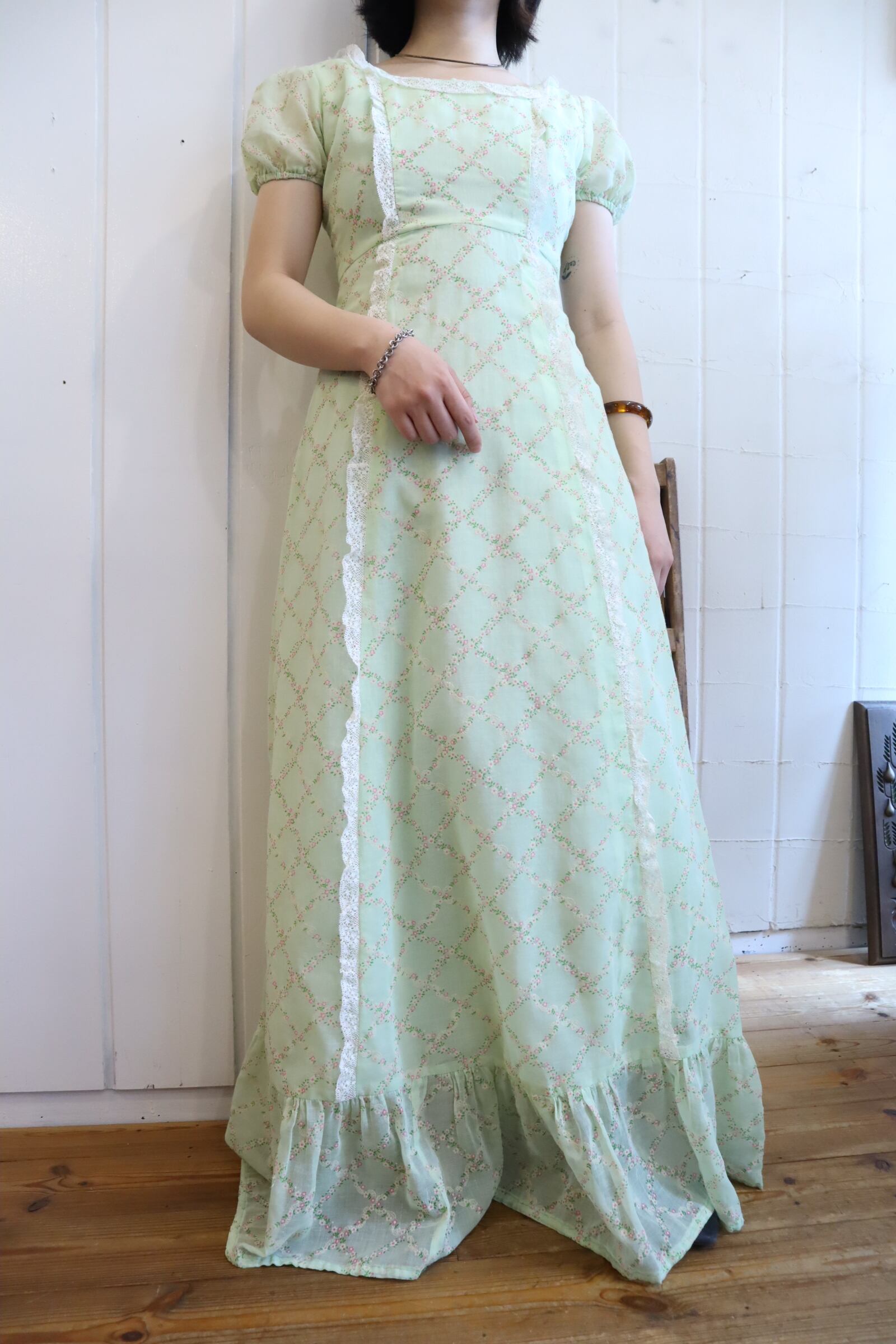 淡いペールグリーンのお色味や、格子になっ小花柄が可愛い70sドレス。