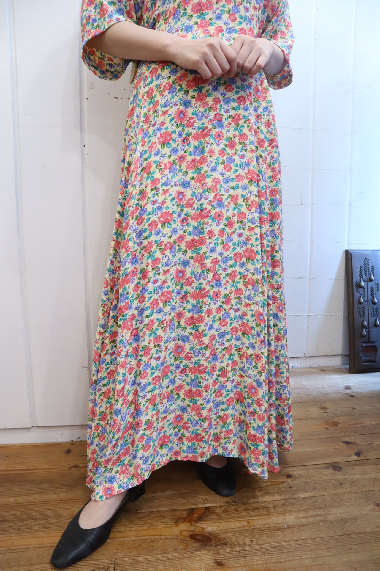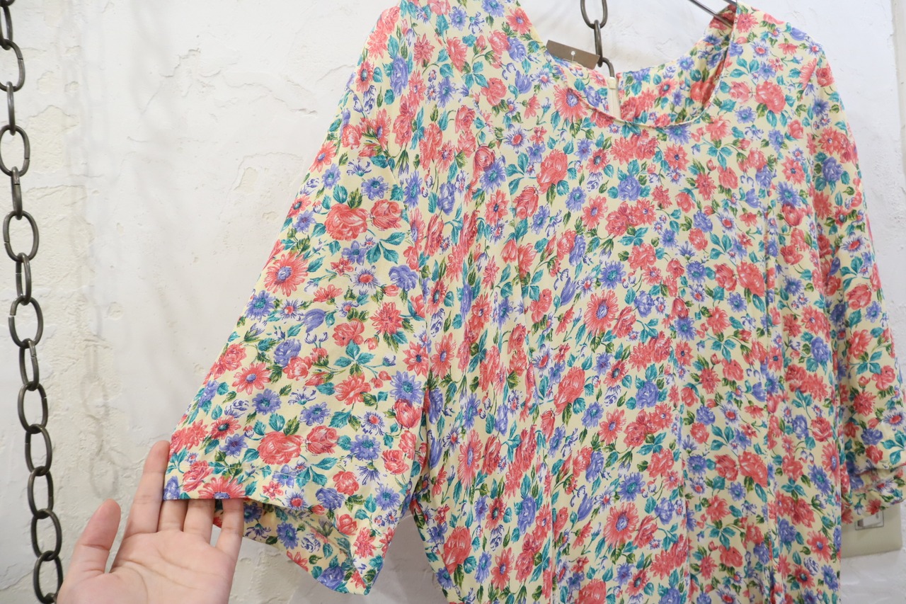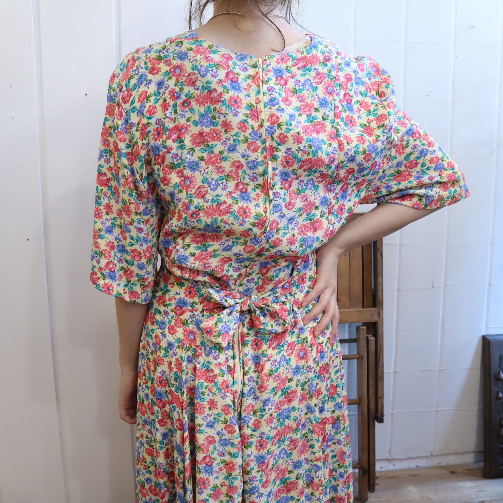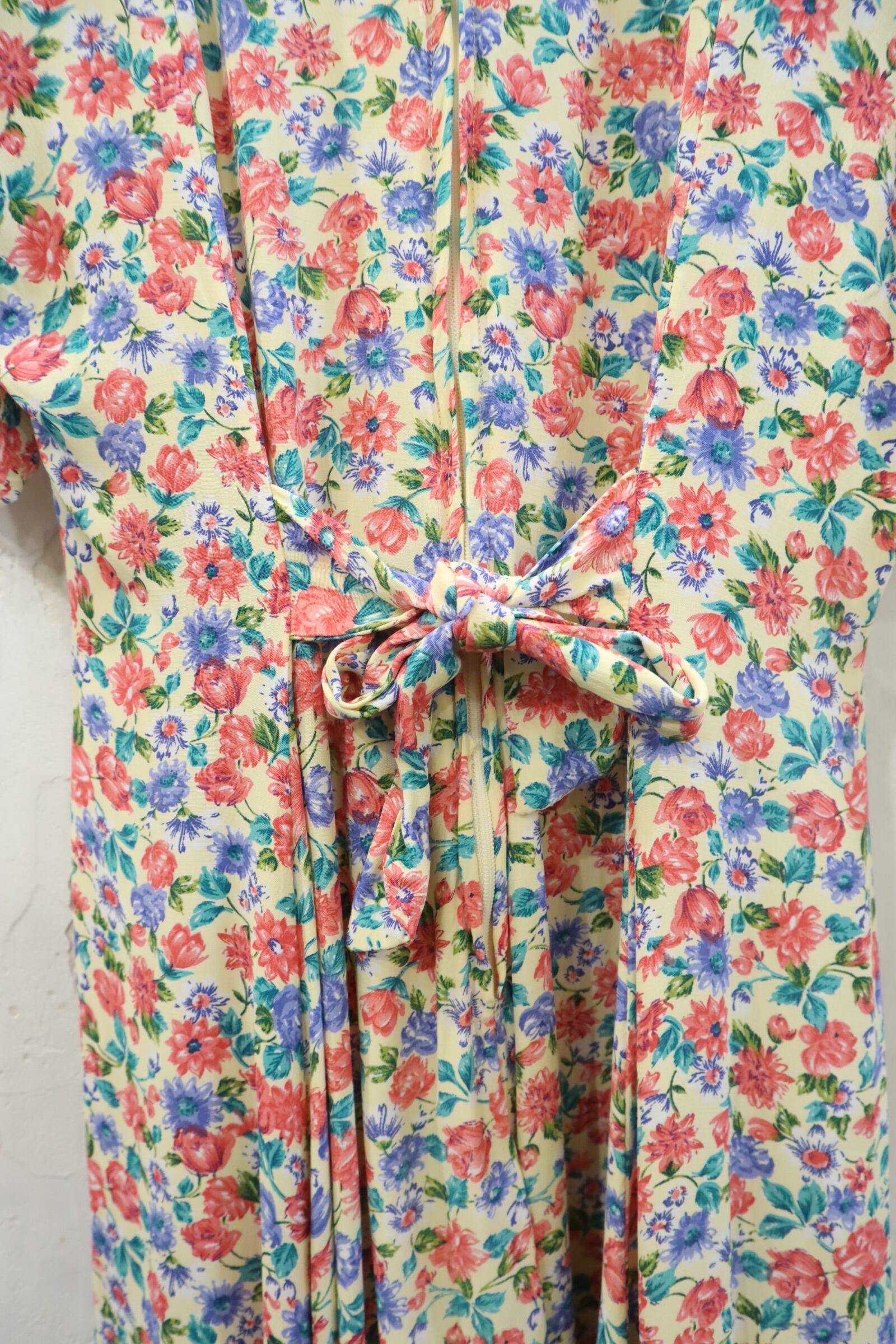 cream×pink×green flower pattern short sleeve dress [l-3242]