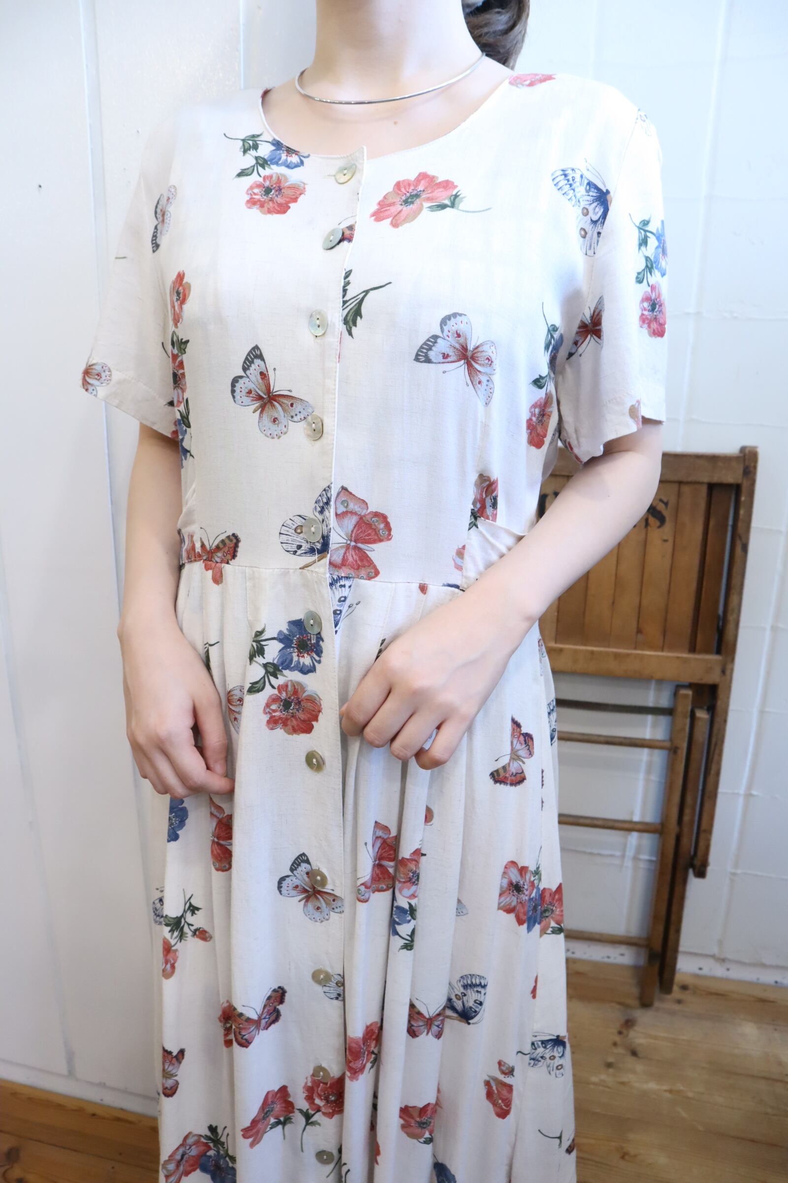 offwhite×red×blue flower&butterfly pattern short sleeve dress [l-3243]