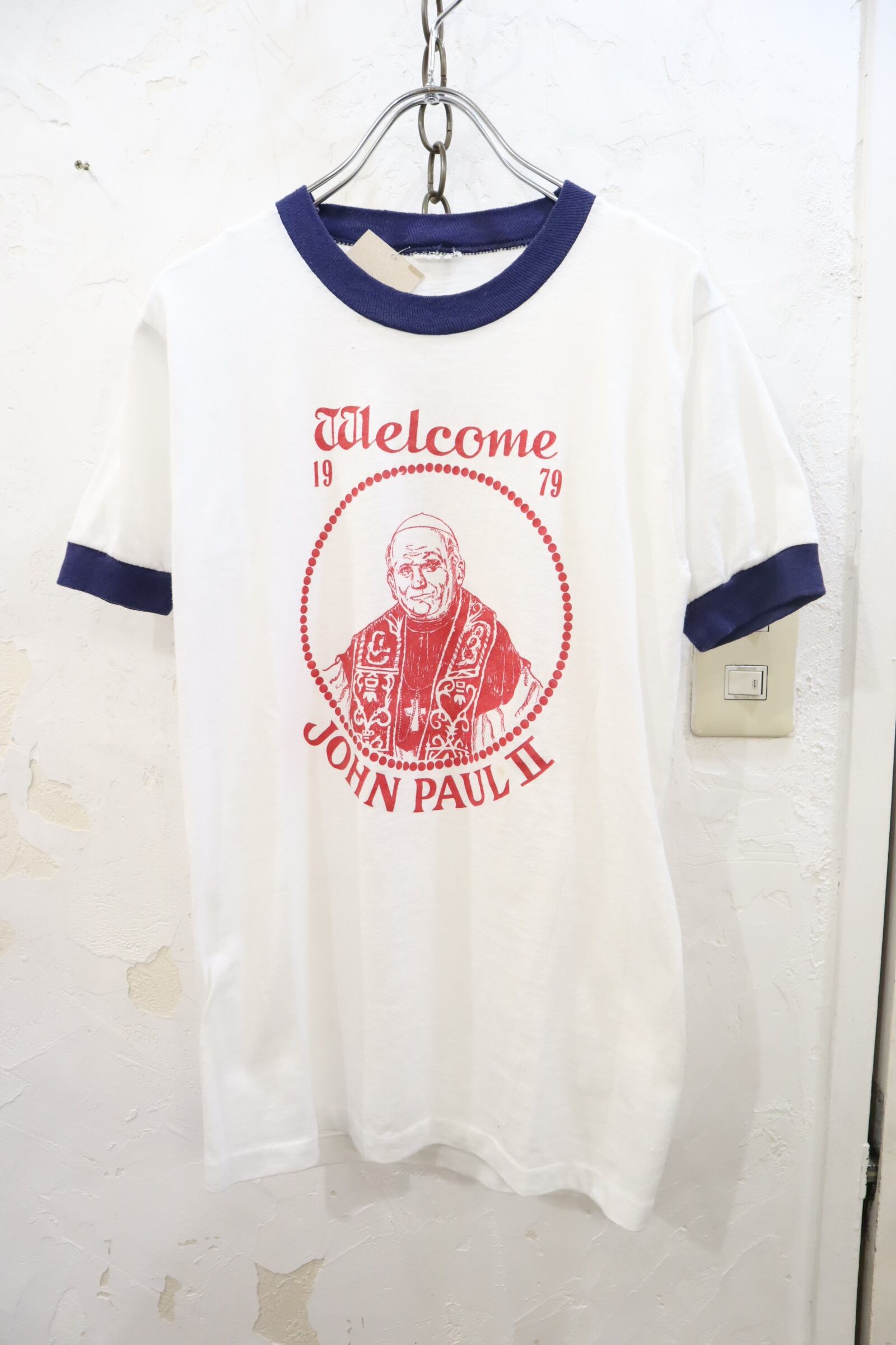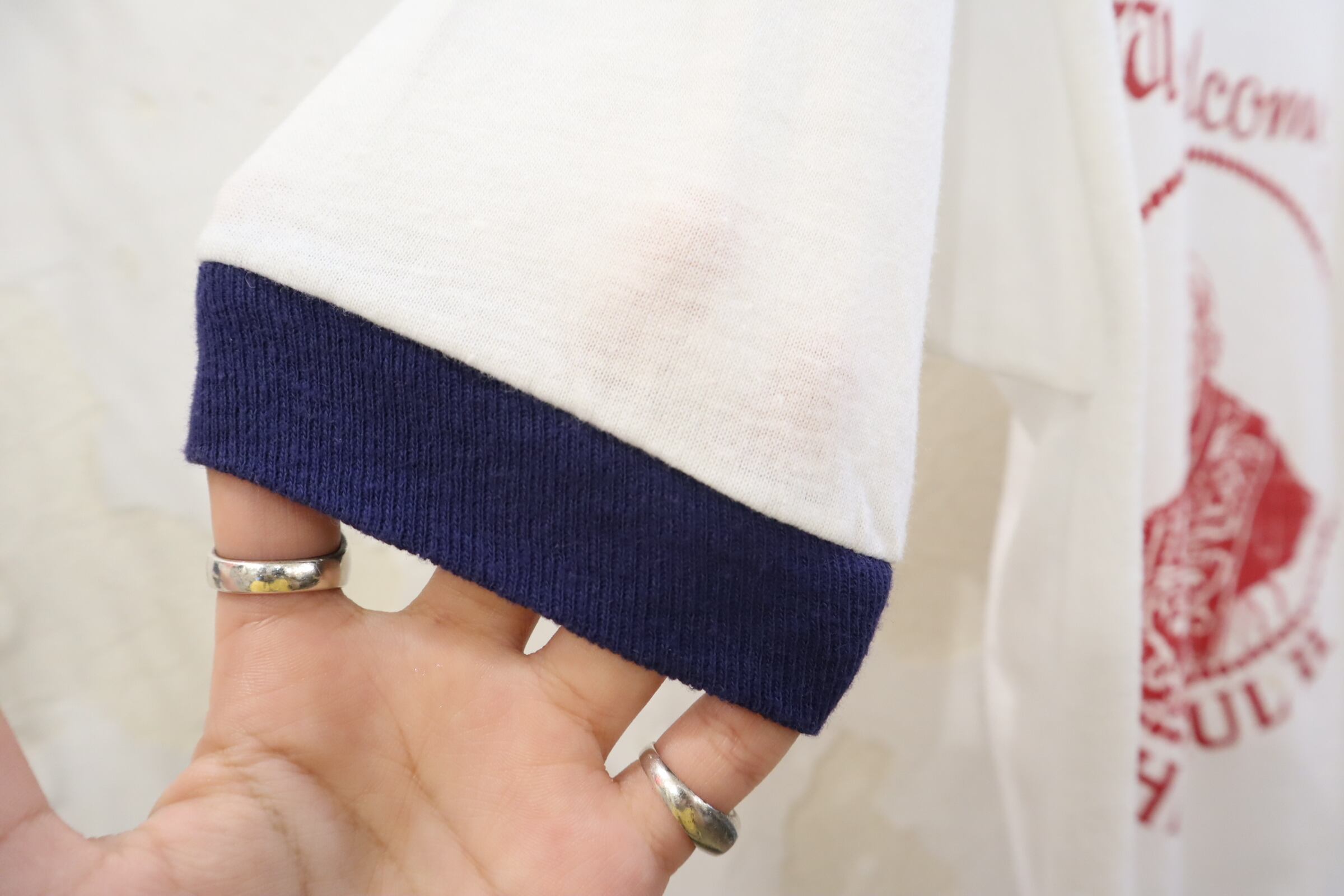 70s- white×navy×red rubber print ringer T-shirt [l-3250]