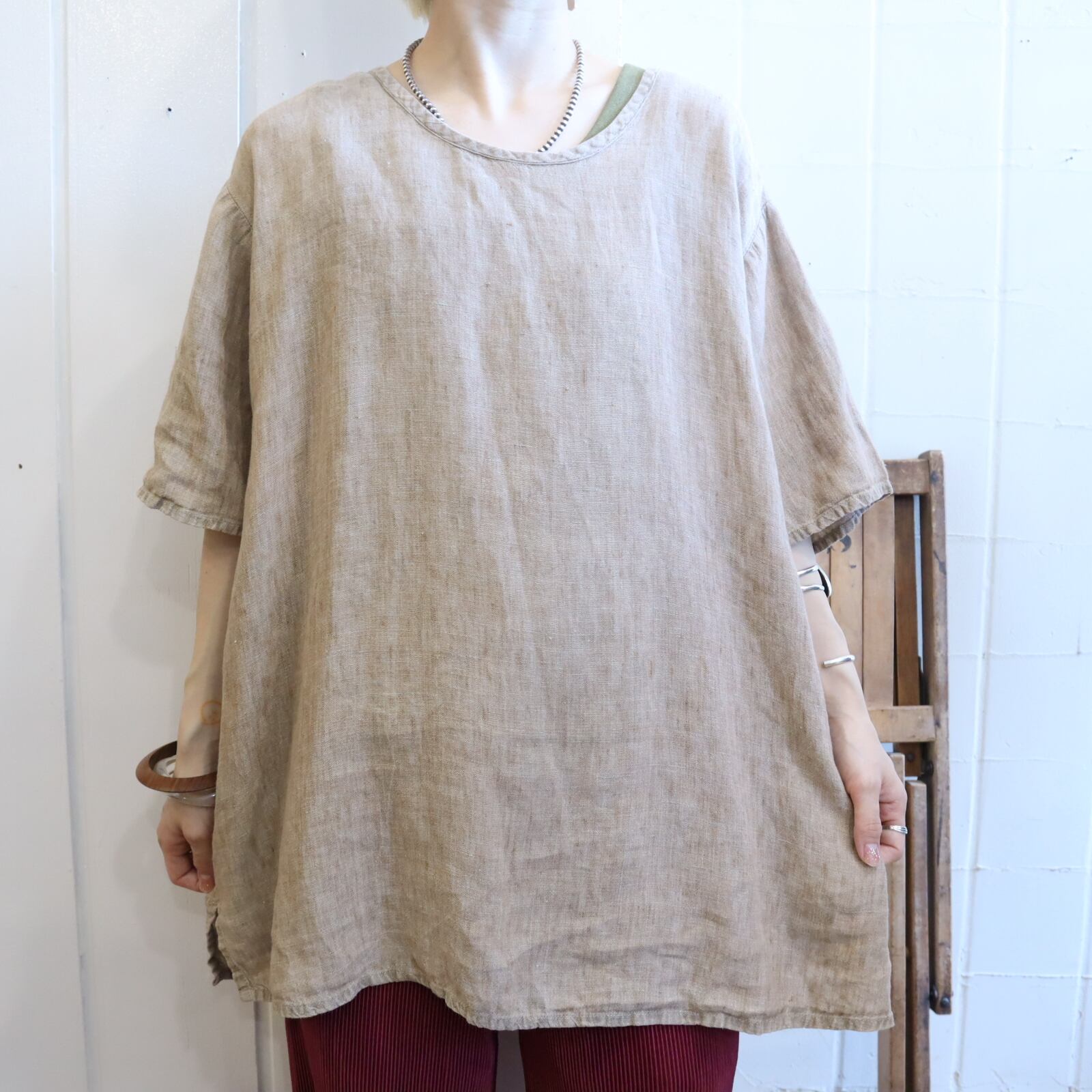 合わせやすいベージュカラーのFLAXトップス。