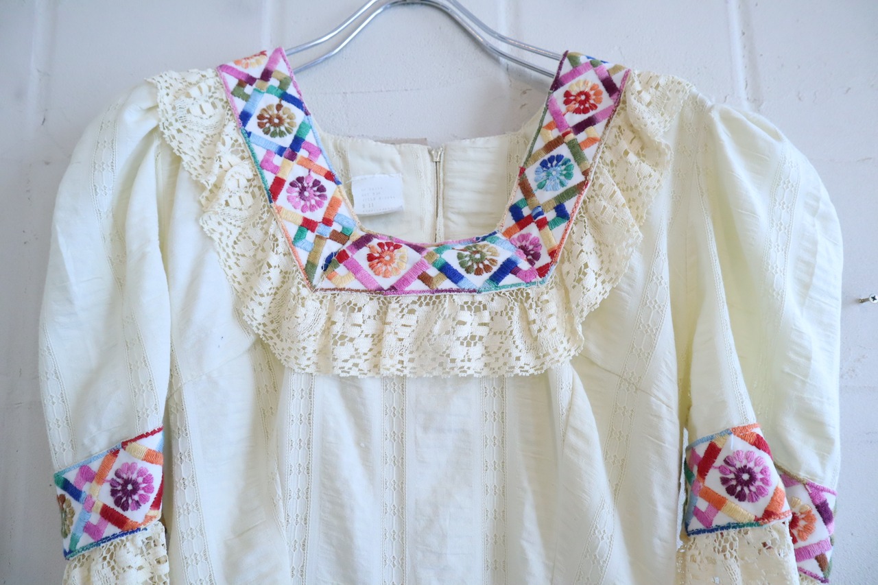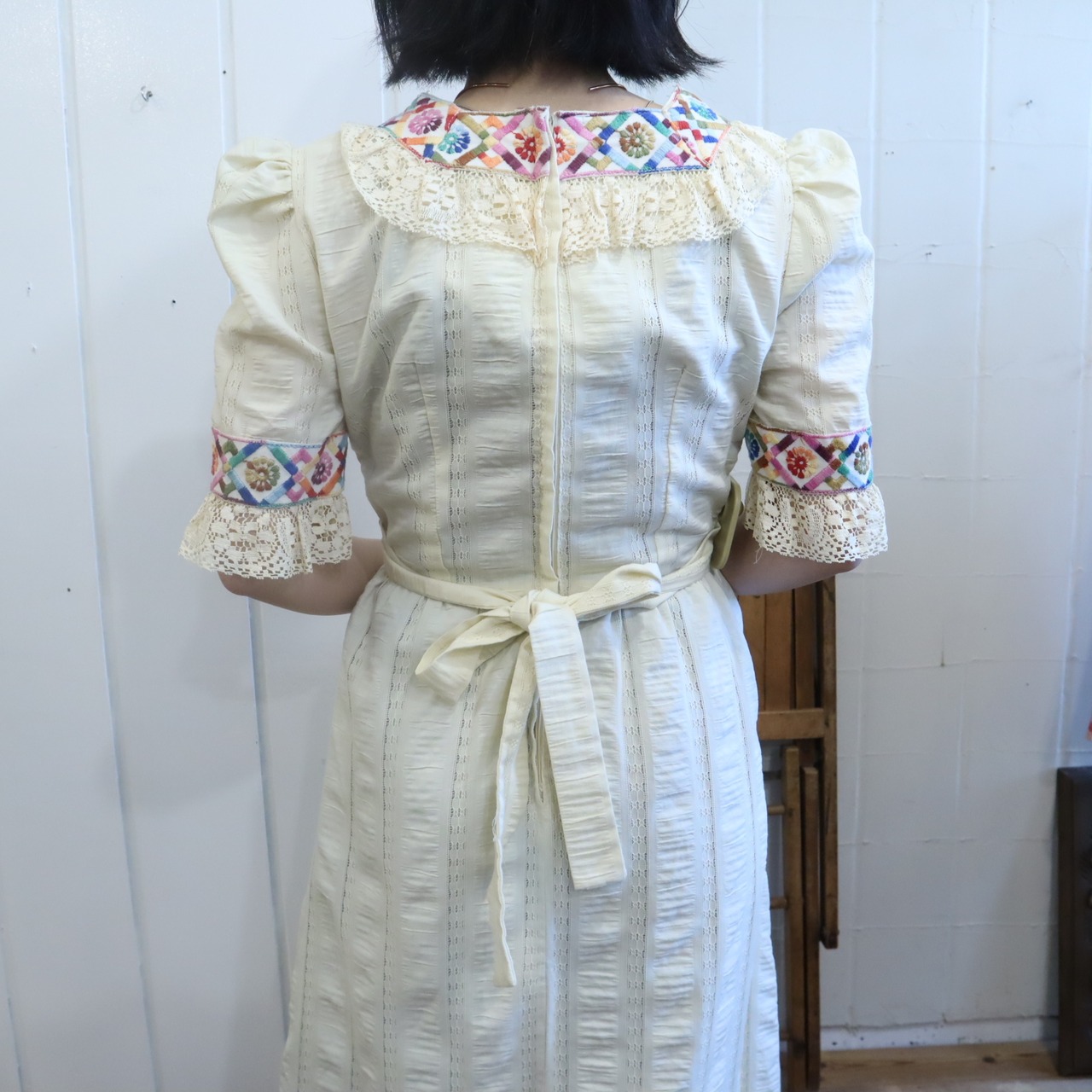 70s ivory×colorful emboridery tape design long dress [l-3268]
