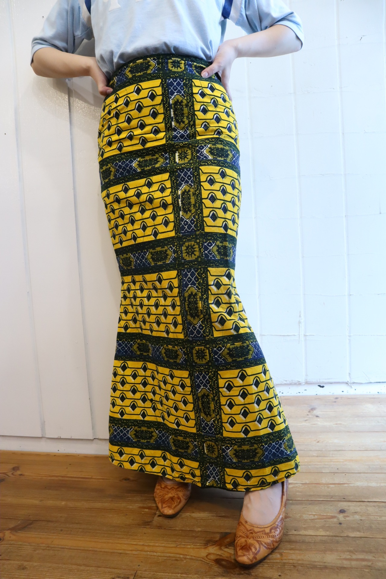 マーメイドシルエットのような形が珍しく、素敵なアフリカンバティックスカートです*