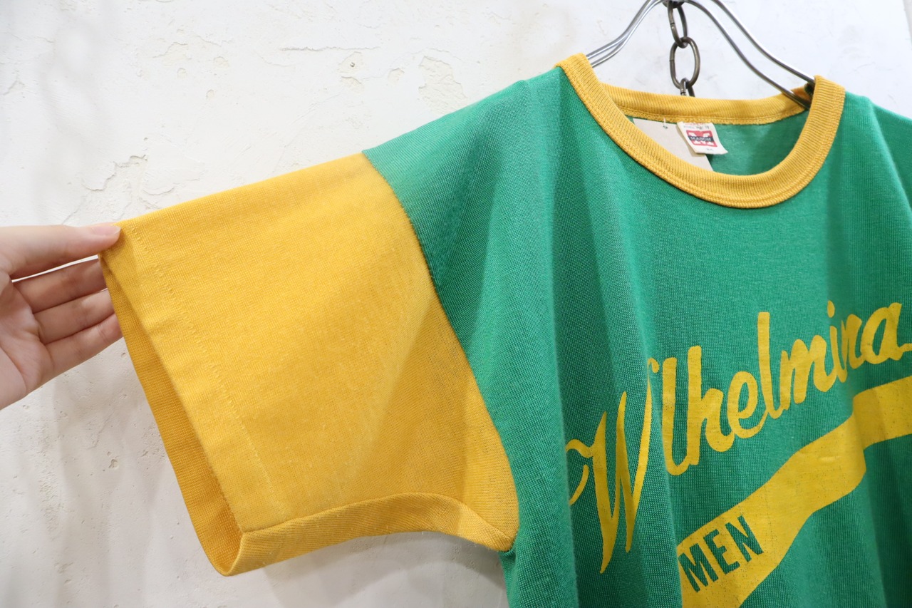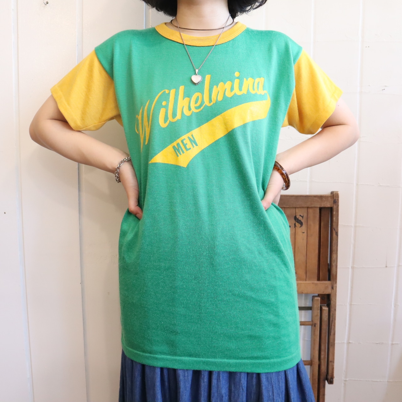 60s-70s green×yellow rubber print football T-shirt [k-3518]