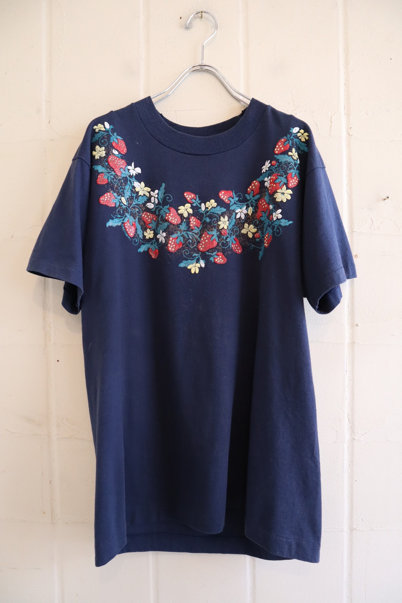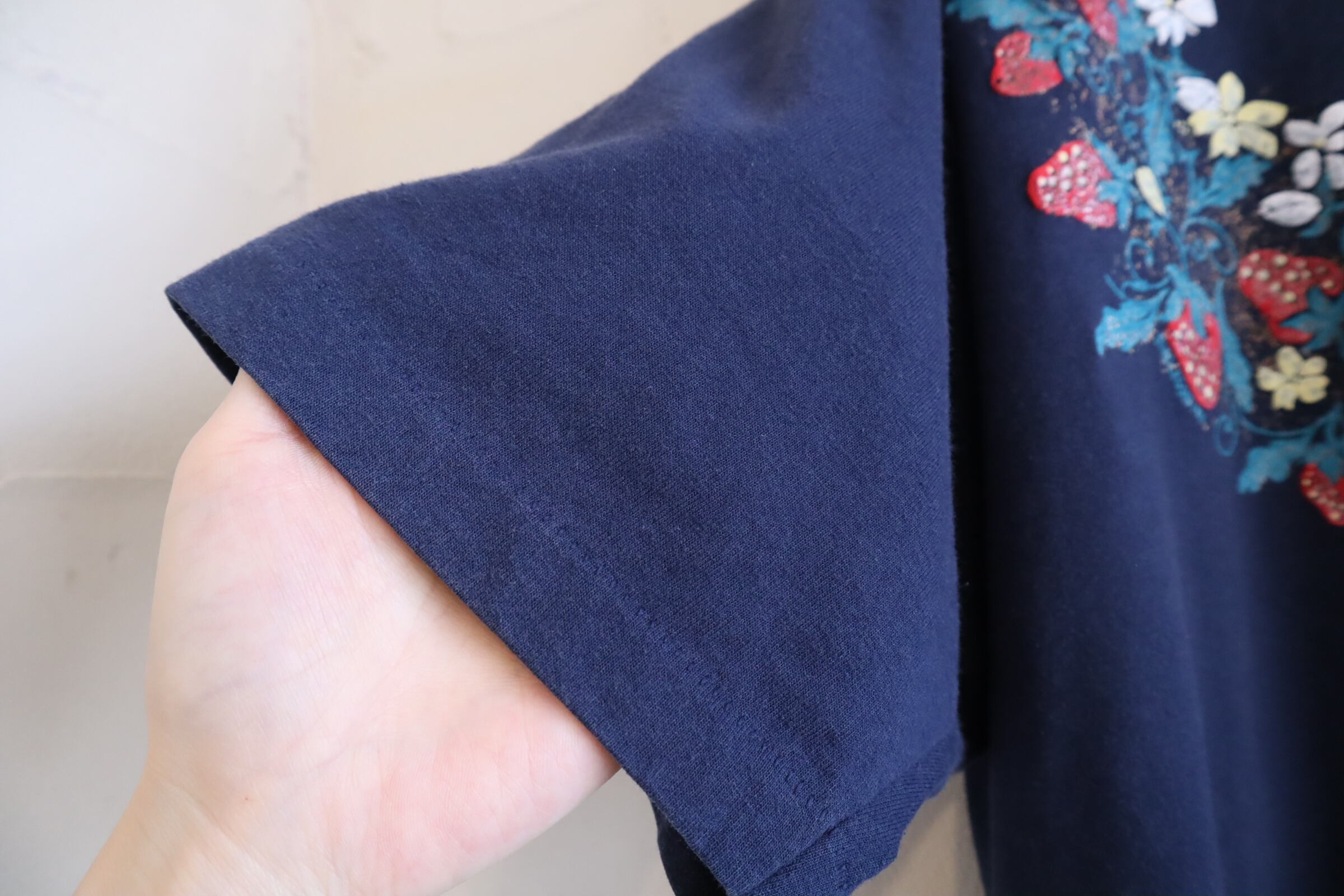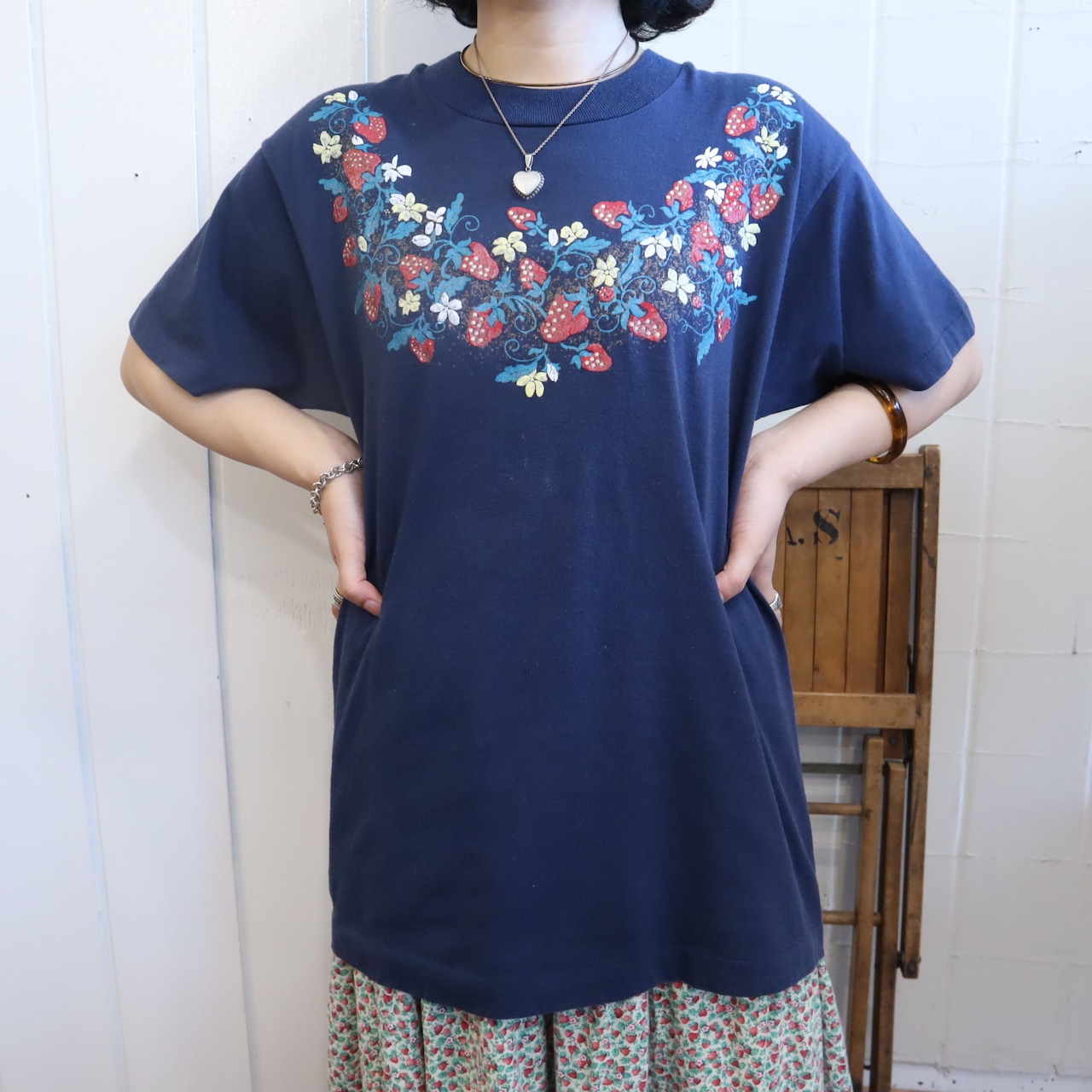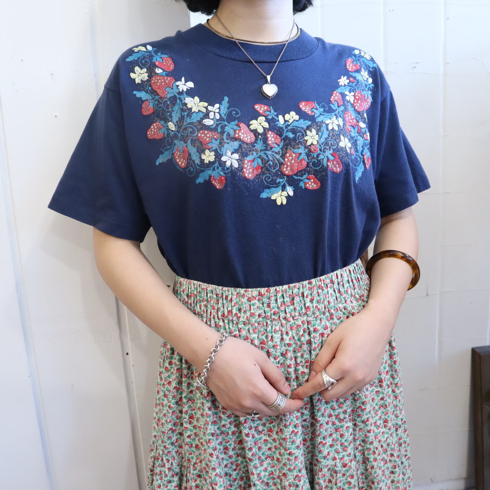 胸元に広がるイチゴのプリントがとっても可愛いTシャツ。