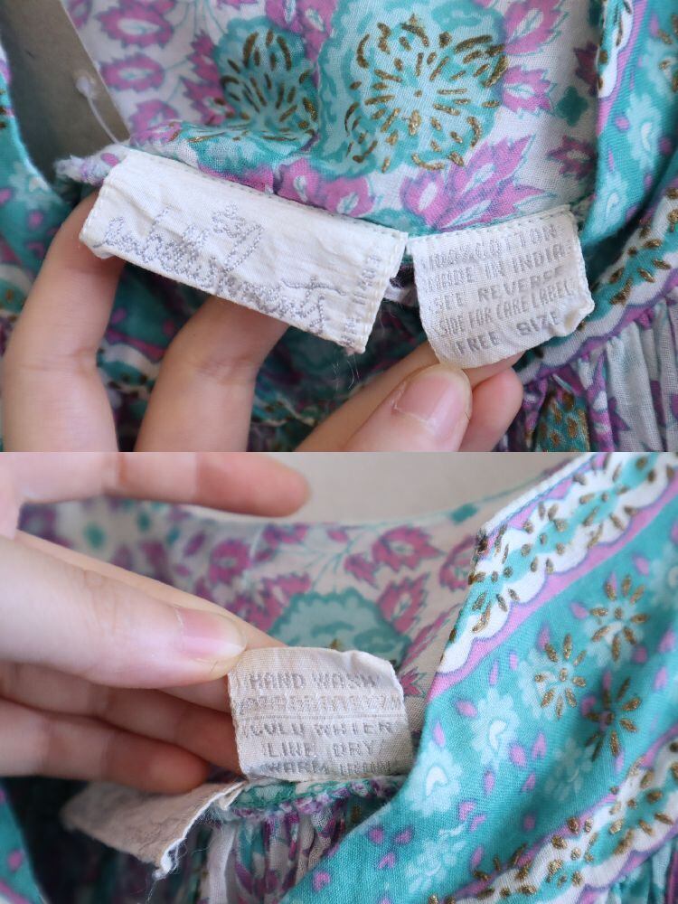 鮮やかなブルーグリーンとピンクのような紫のような絶妙なカラーが可愛いインドコットンドレス。