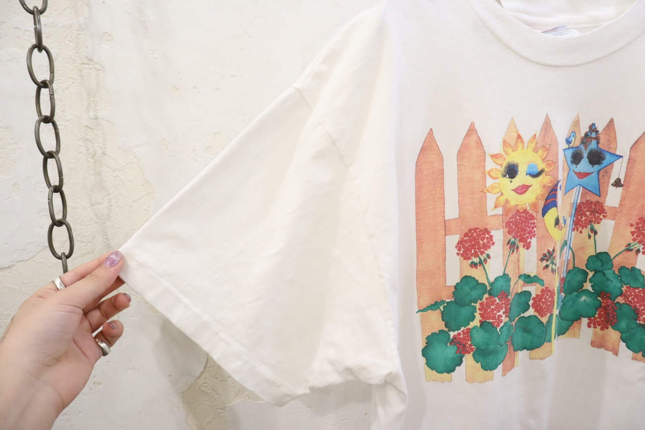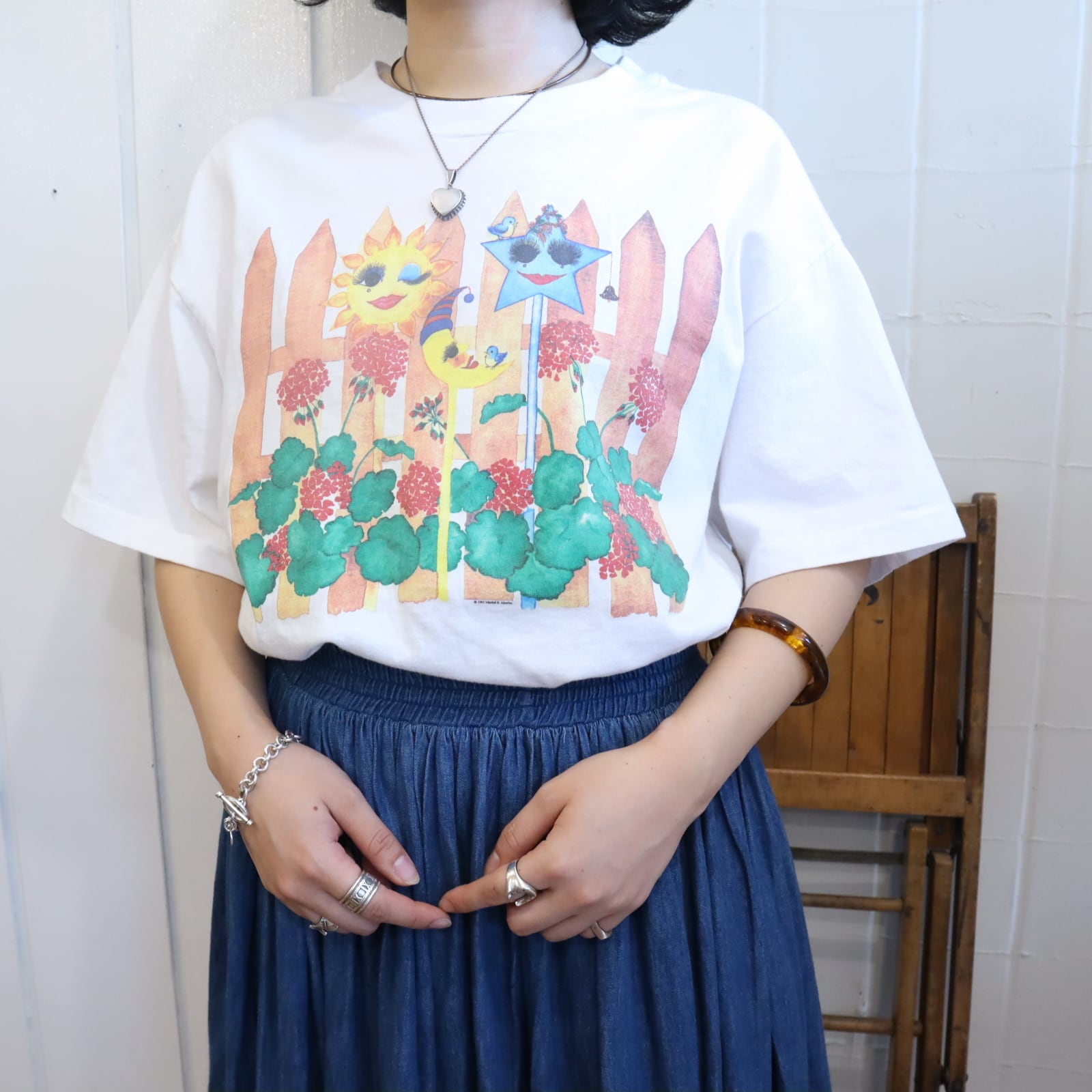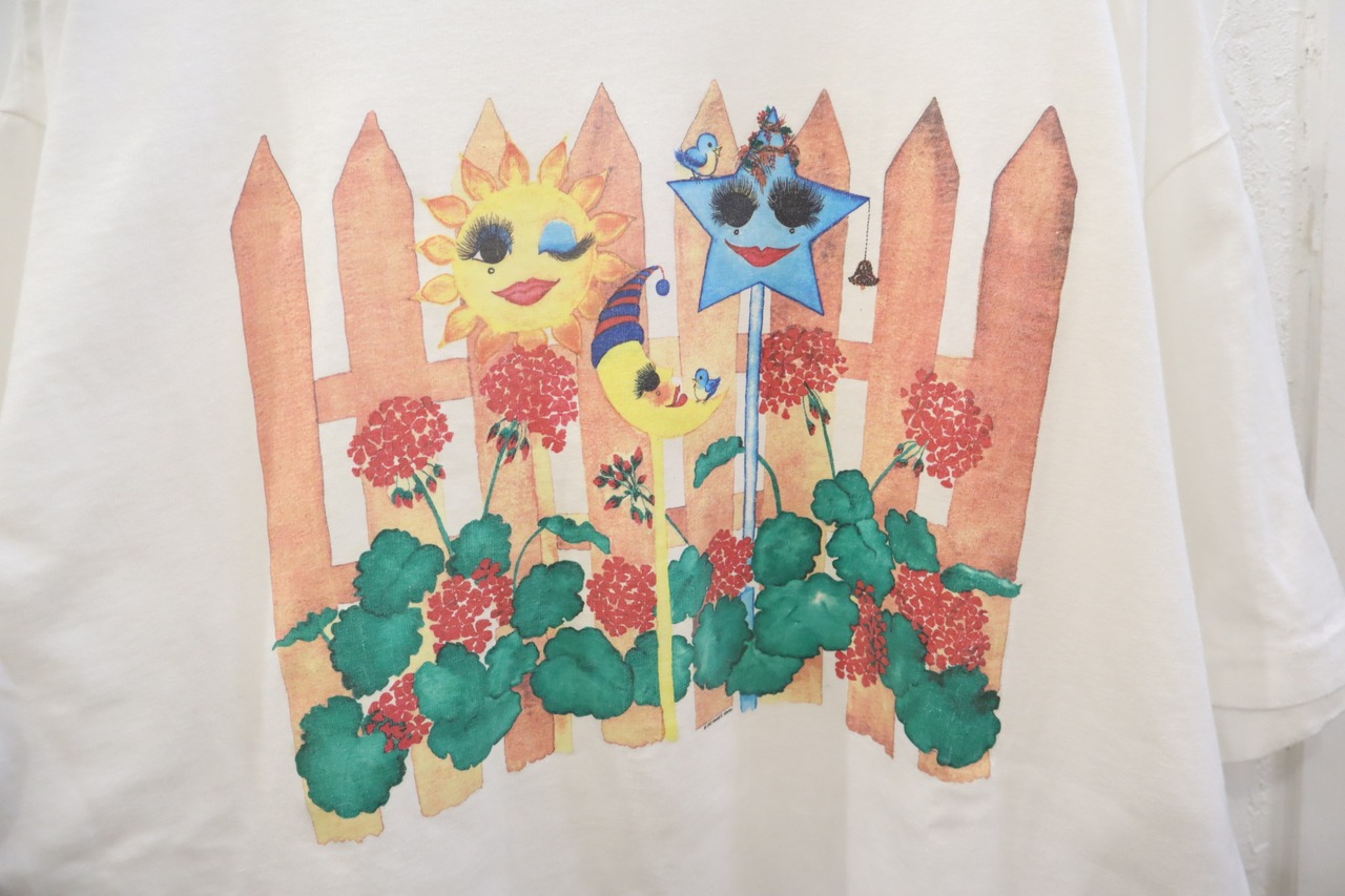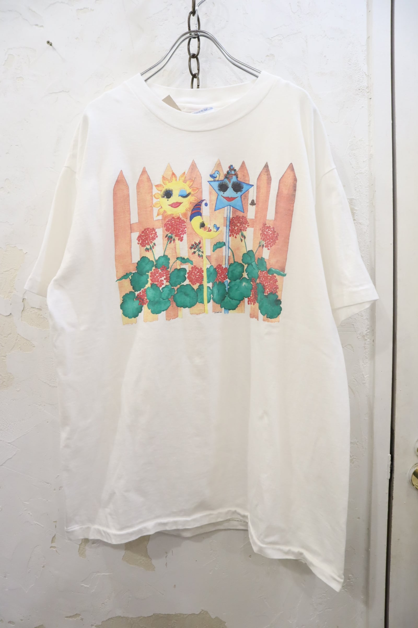 90s white×brownbeige flower&sun print T-shirt [l-3573]