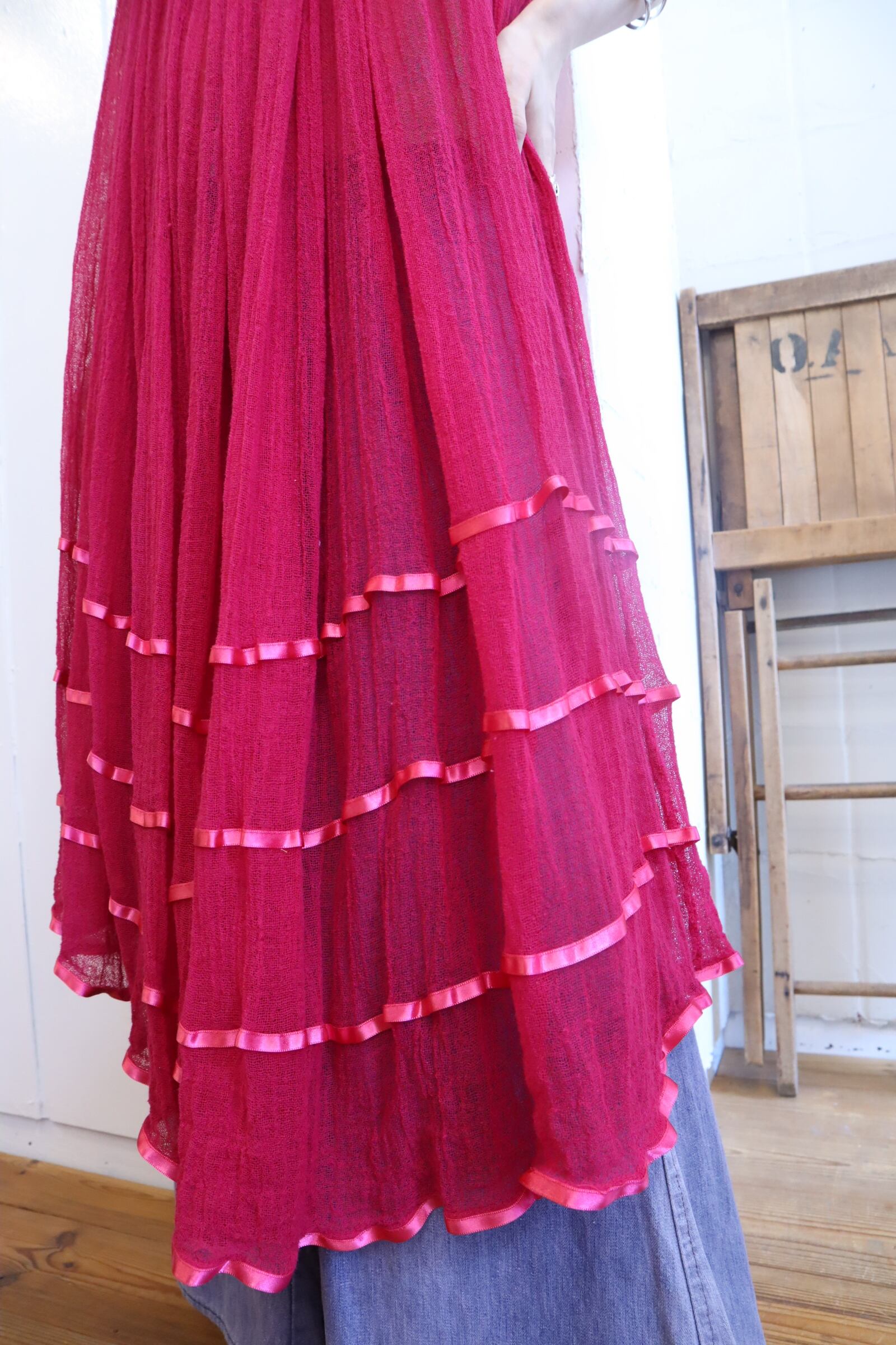 アシンメトリーな裾のデザインと濃いピンクが可愛いガーゼドレス。