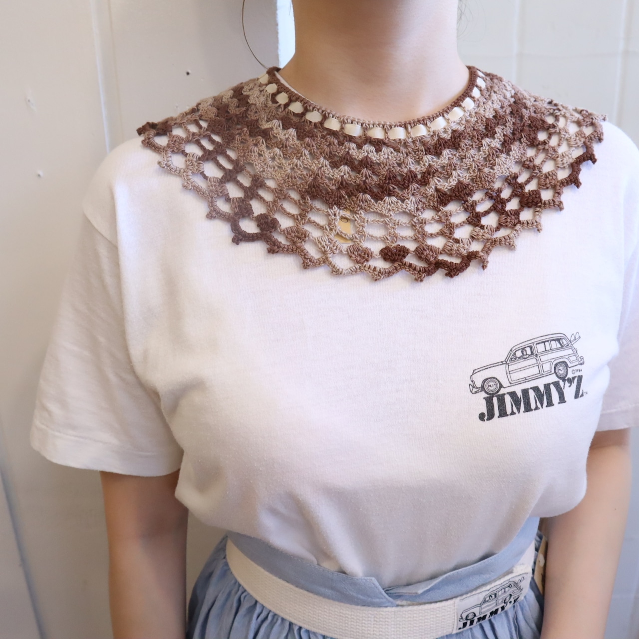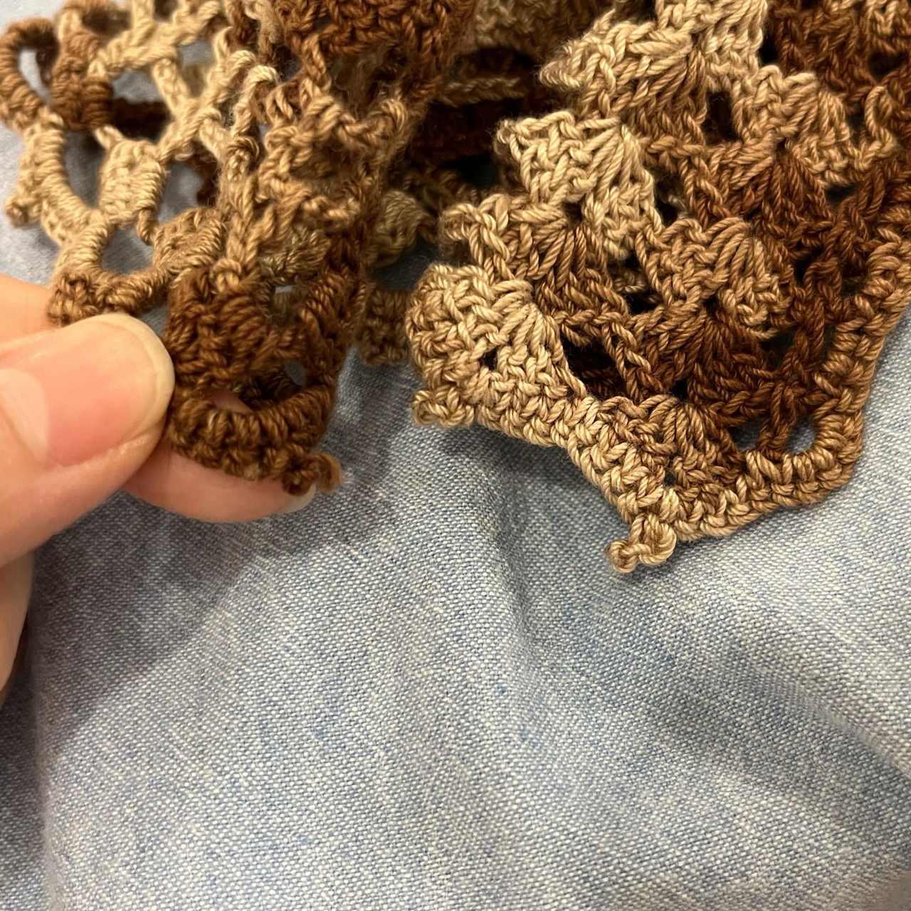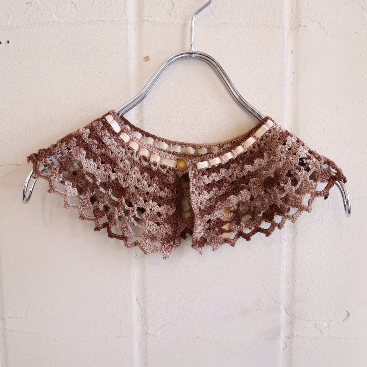 グラデーションになったブラウンのほっこりカラーが可愛いかぎ編みの付け襟。