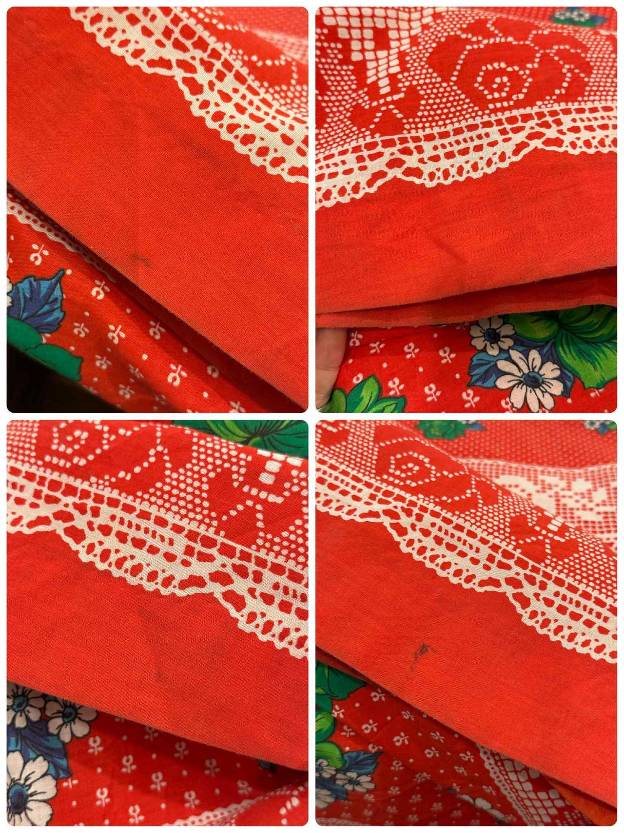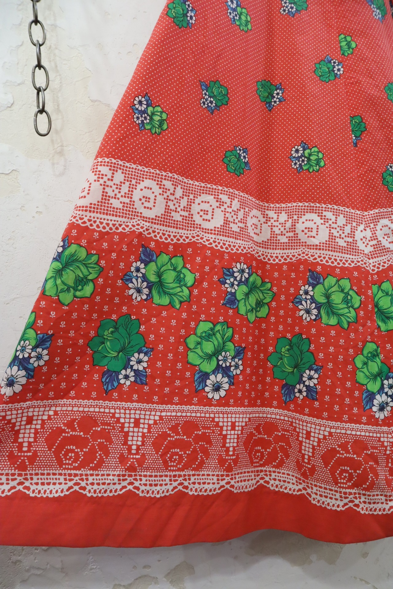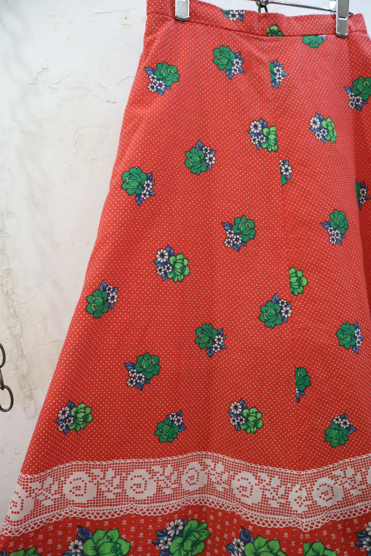 Euro 70s red×green flower&lace print long skirt [l-3613]