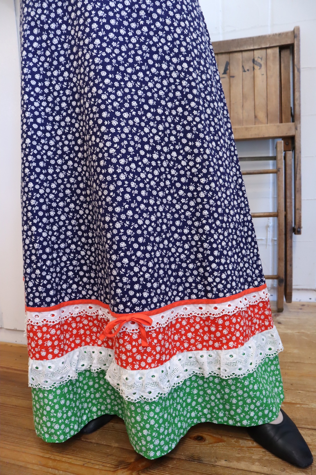 Euro 70s navy×red flower lace ribbon long skirt [l-3614]