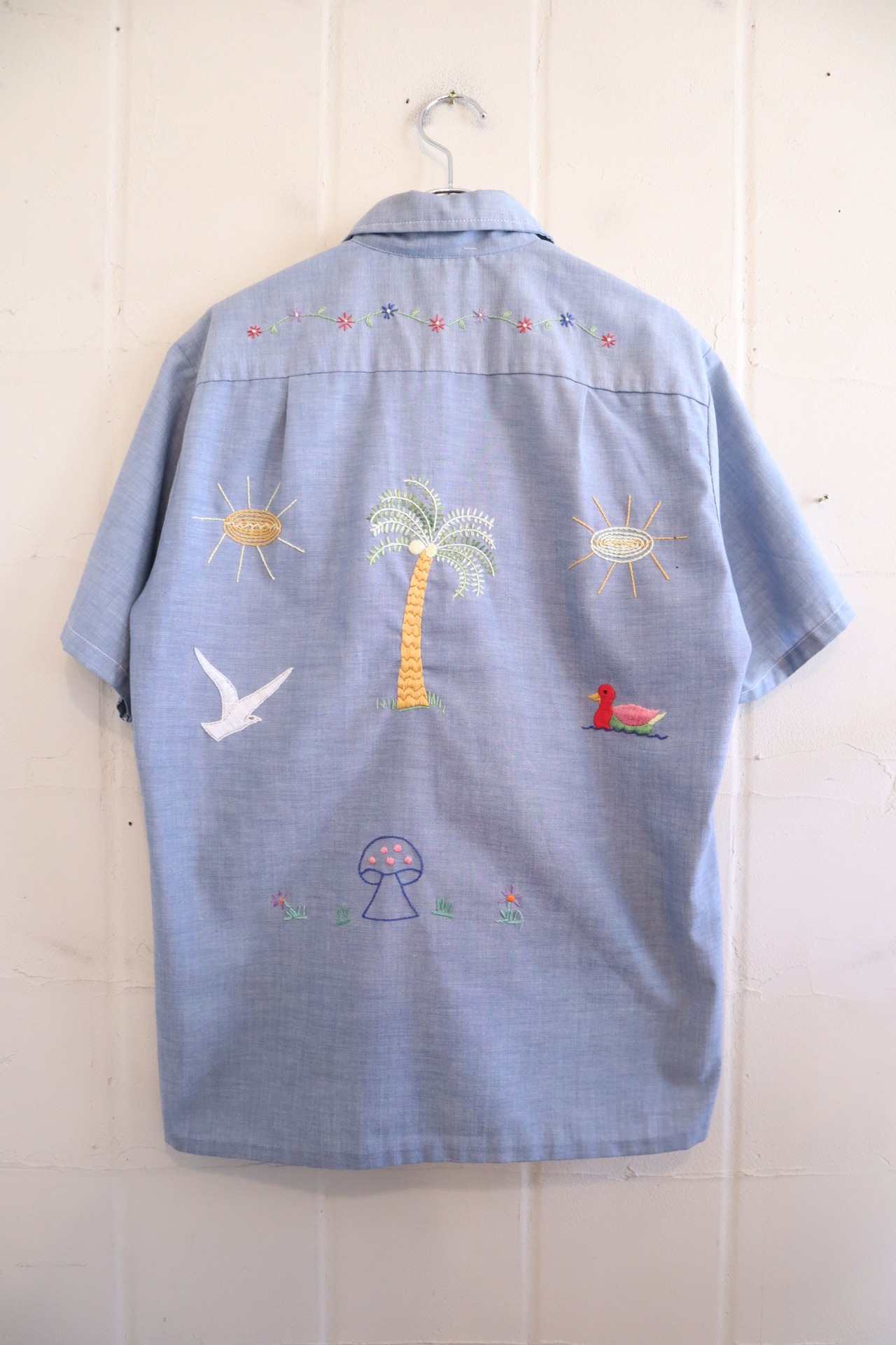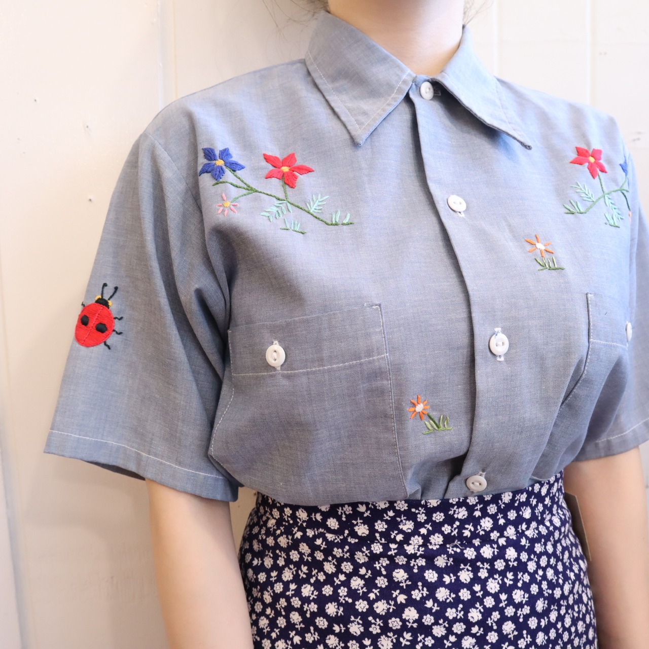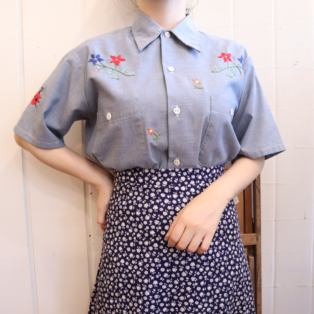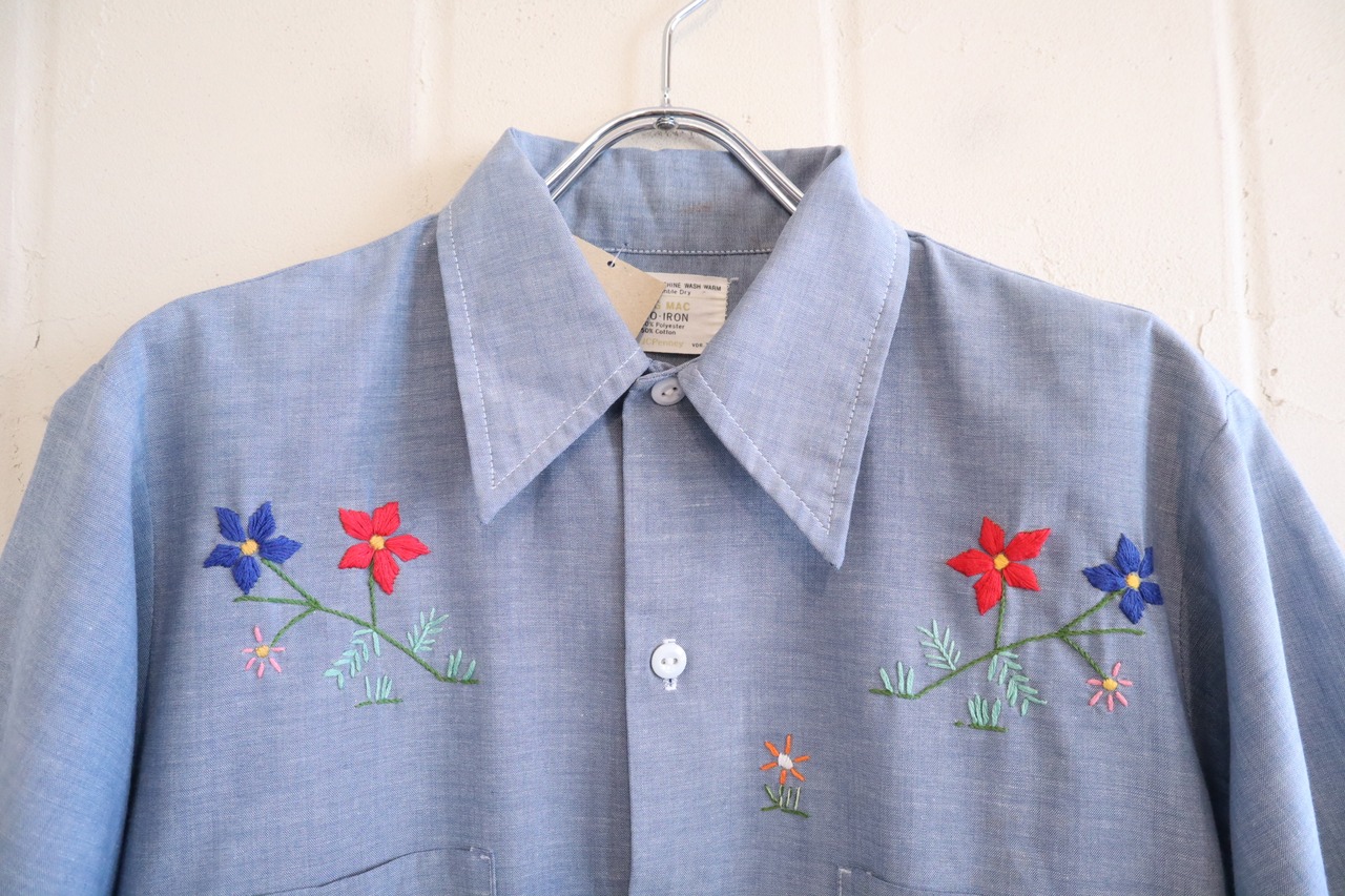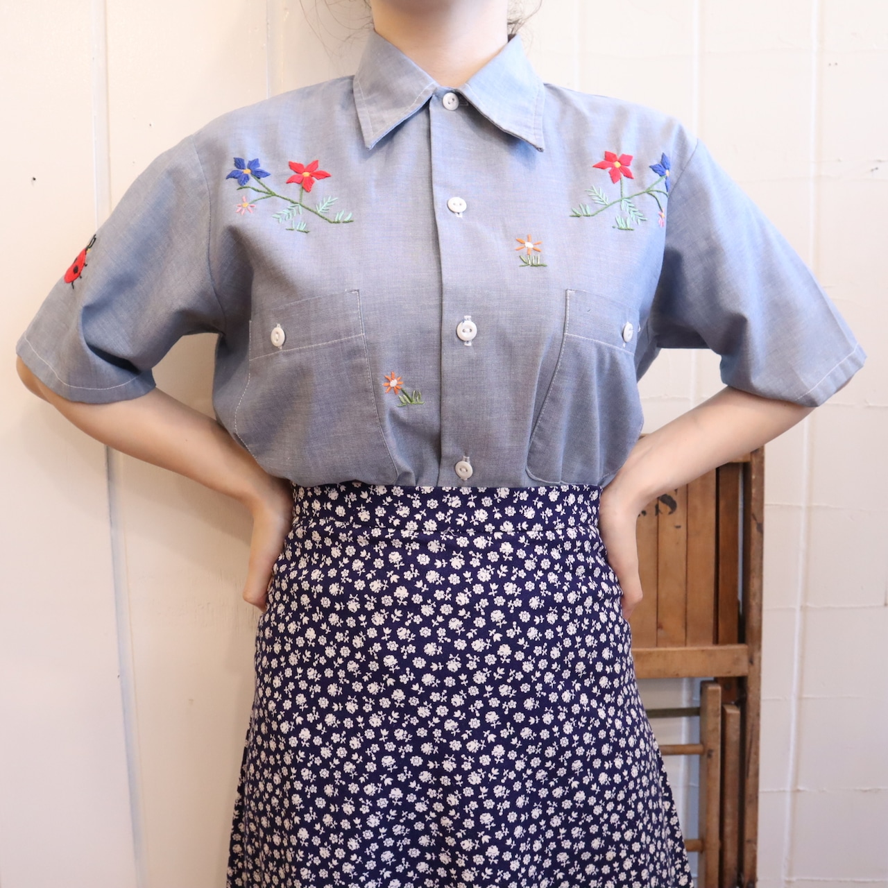 70s lightblue×red flower embroidery chambray shirt [l-3618]